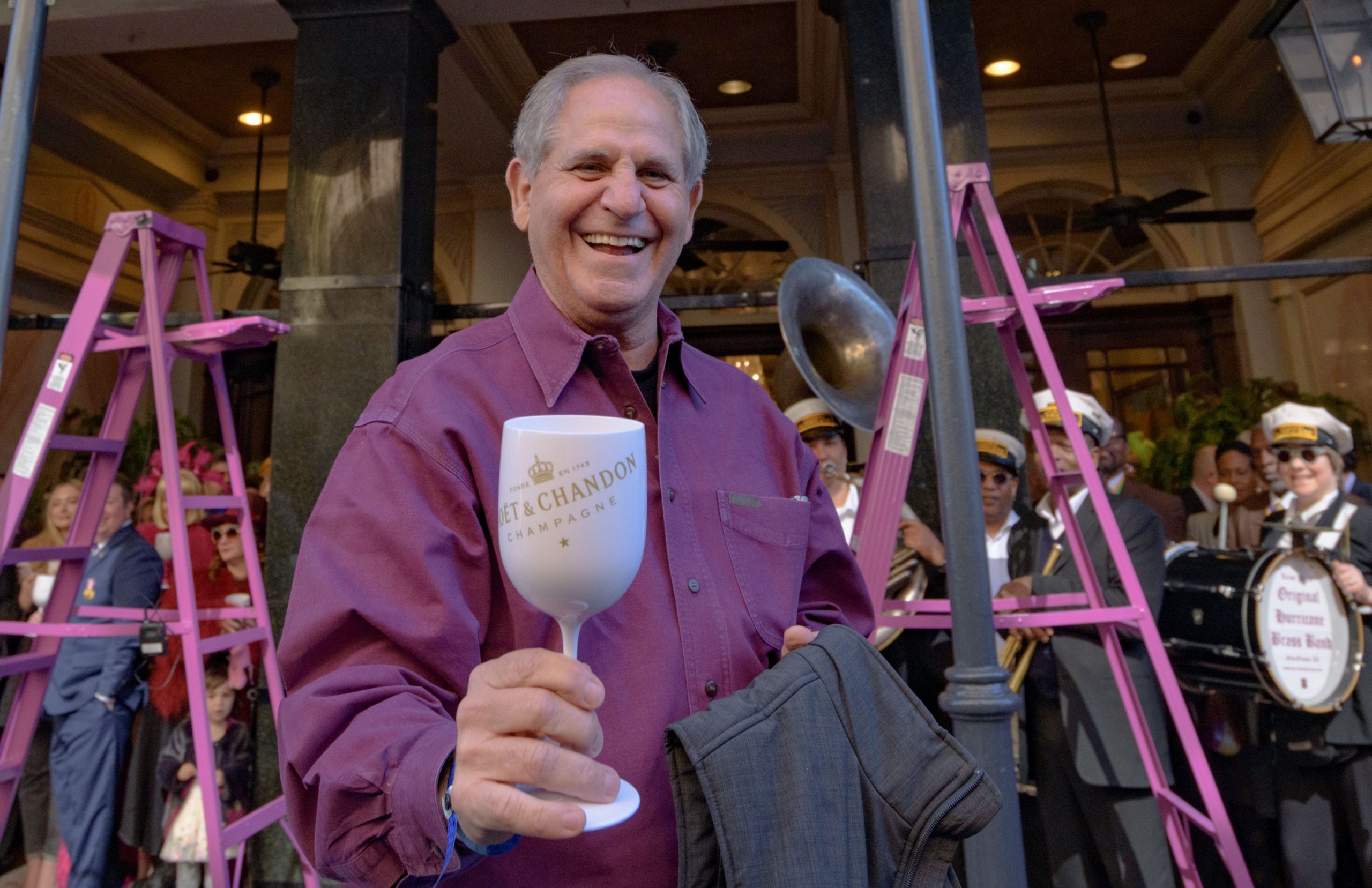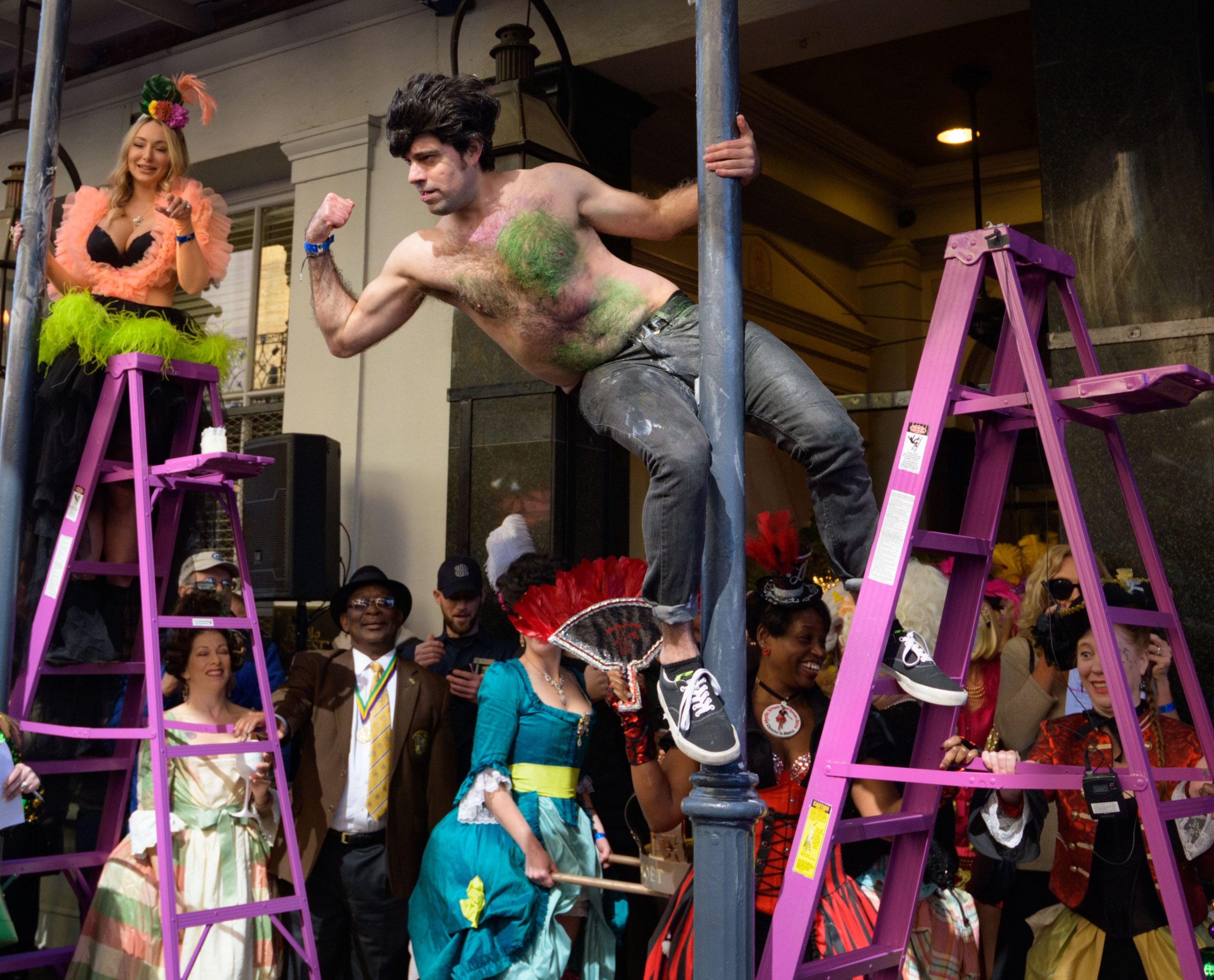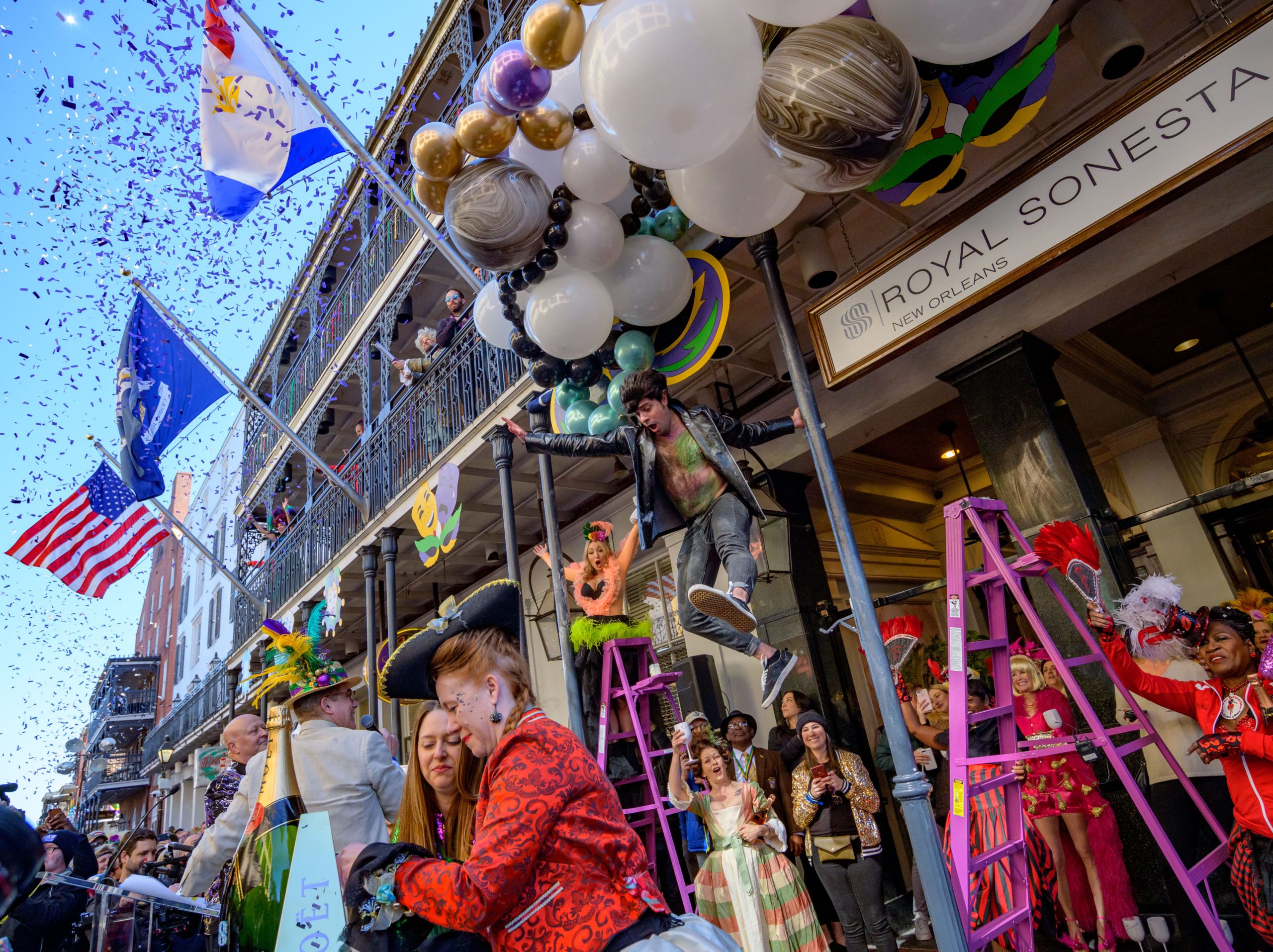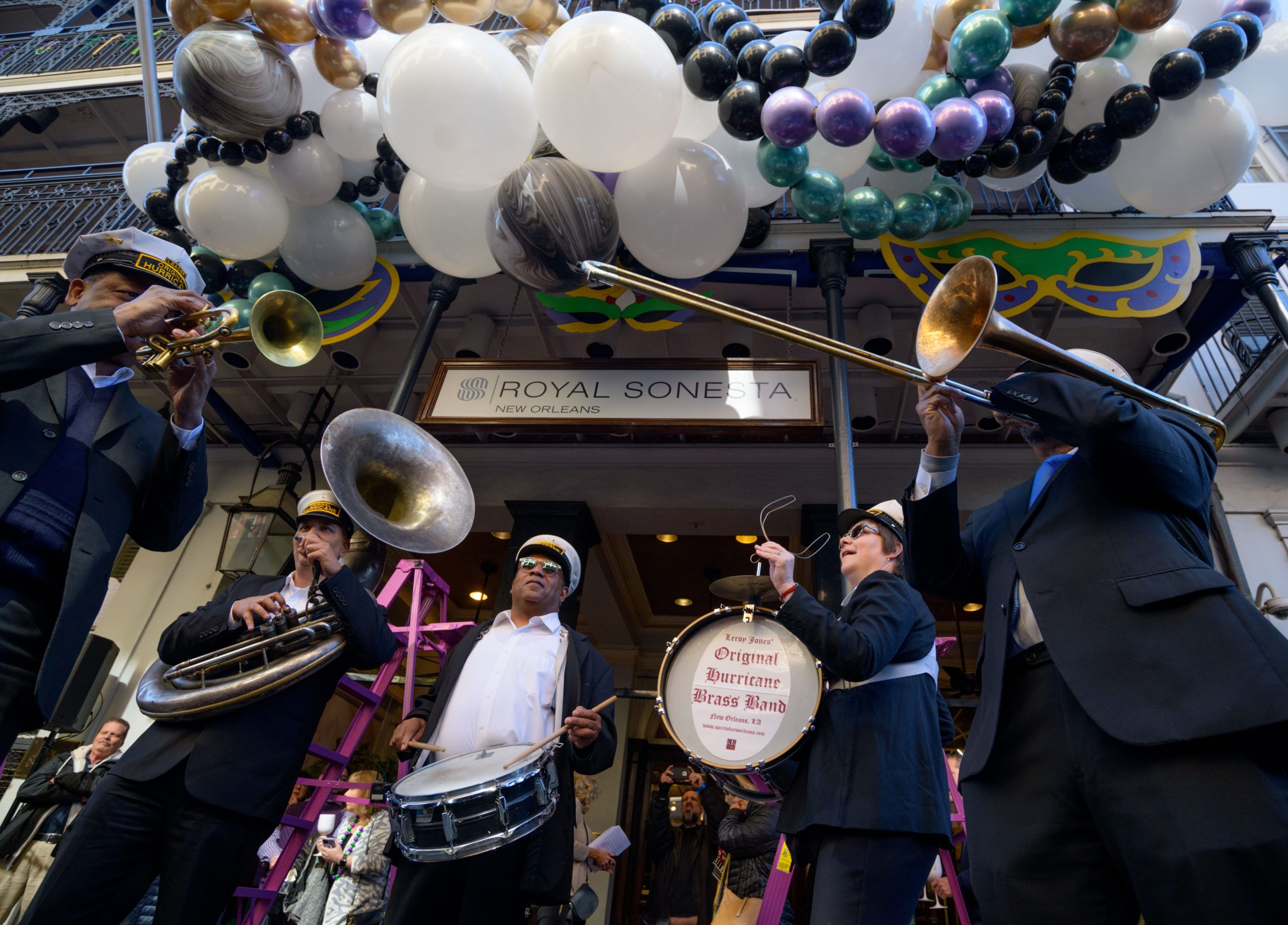 The tradition of greasing down poles at the Royal Sonesta Hotel in the French Quarter to keep parade-goers from shimmying up hotel balconies turns 50 this year. Known as the official kick off to Mardi Gras weekend, this event featured actor Bryan Batt as host and included appearances by Kenny Lopez from News with a Twist, who won this year, last year’s winner Desiree Ontiveros of Bad Ass Balloons wearing “Bitch Please” eyelashes, Miss New Orleans Pride 2020 Lana O’Day in shiny purple dress, Reagan Charleston Thomas of Southern Charm New Orleans, musician Amanda Shaw dressed as Charlie Chaplin’s Tramp, and renowned Big Easy burlesque dancer and performer, Trixie Minx. Leroy Jones and the Original Hurricane Brass Band entertained the crowd with special guests from the Merry Antoinettes, the Mystic Krewe of Femme Fatale, the Krewe of NOMTOC (New Orleans’ Most Talked Of Club) and the Krewe of Cork. Photo by Matthew Hinton