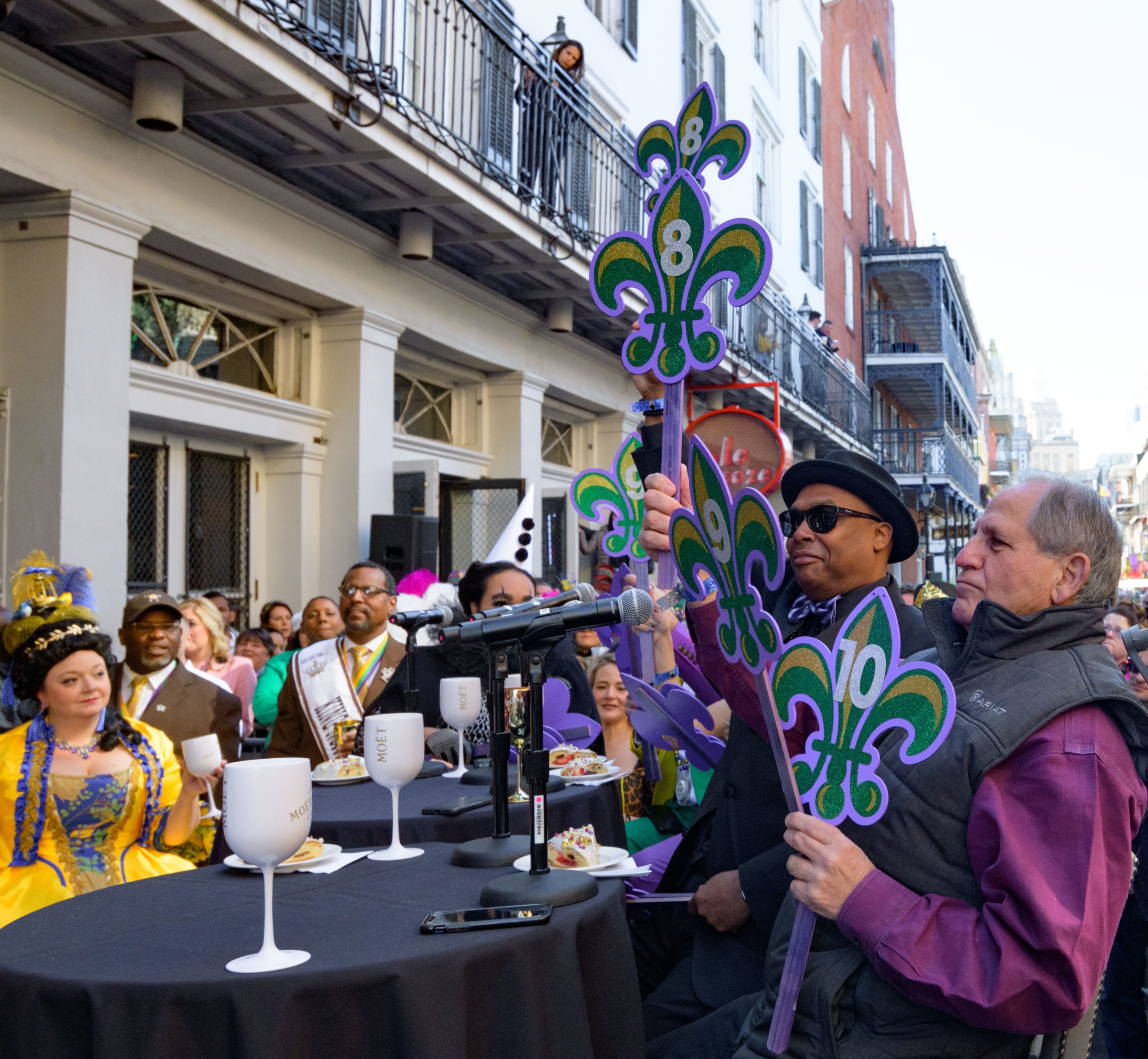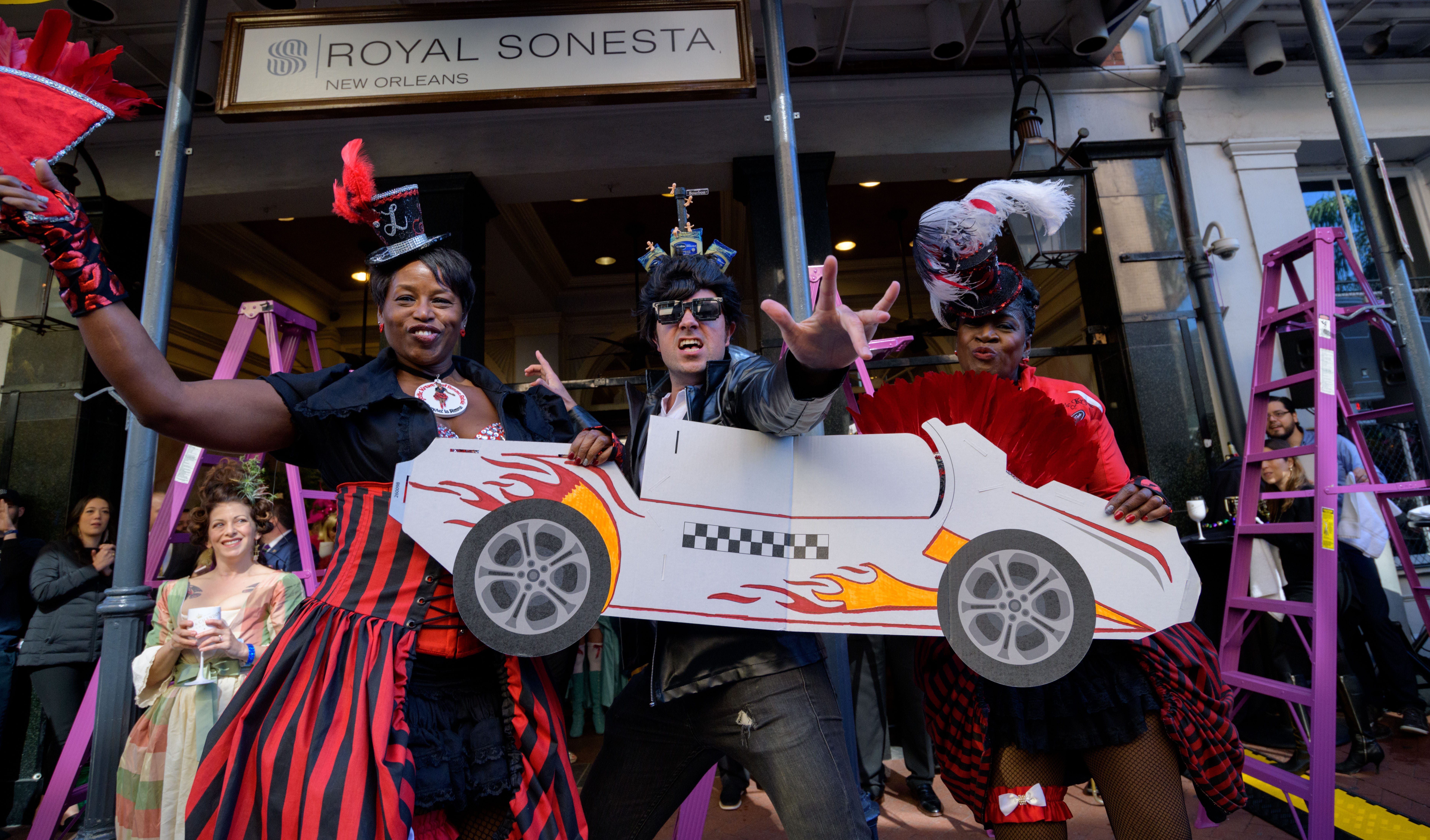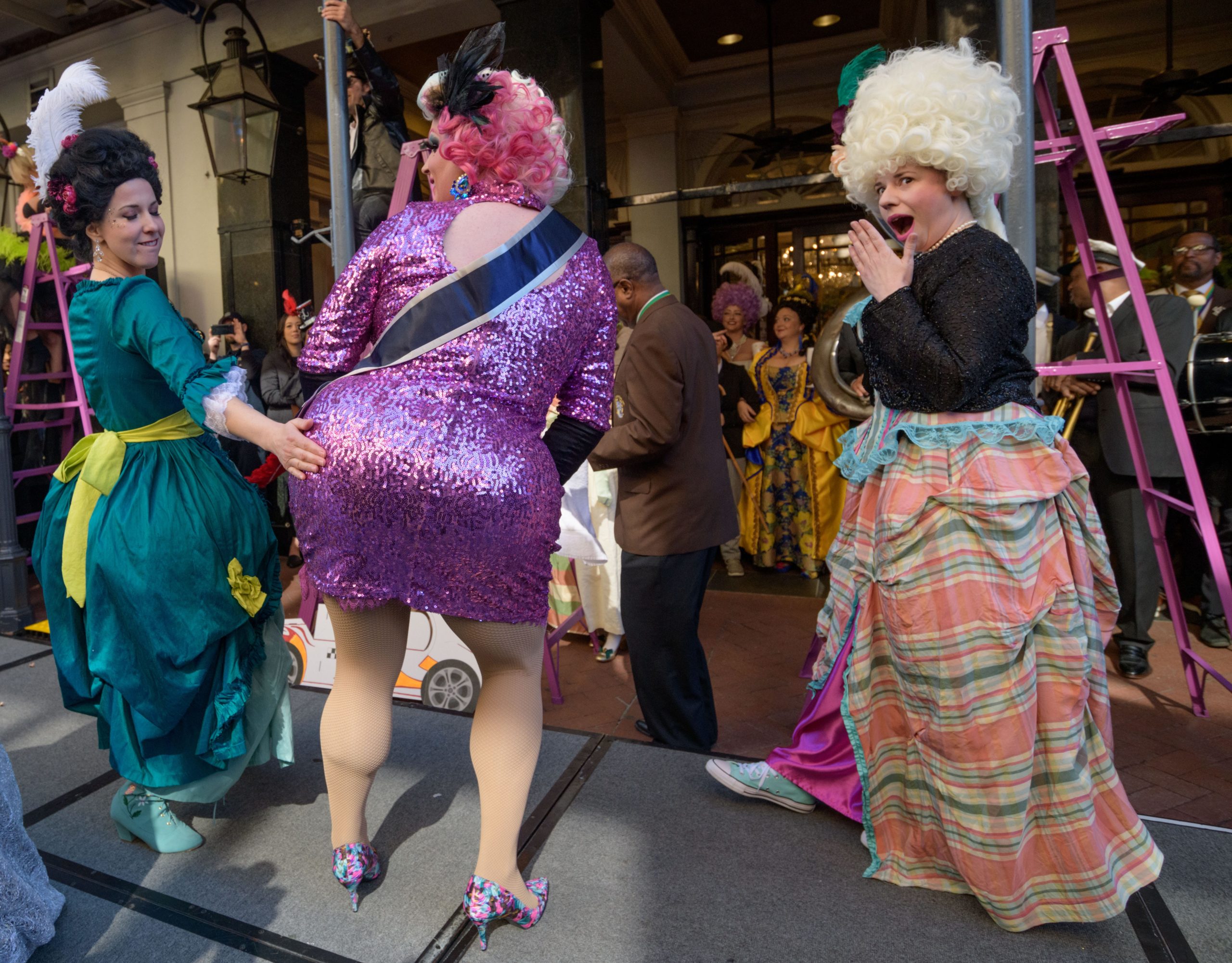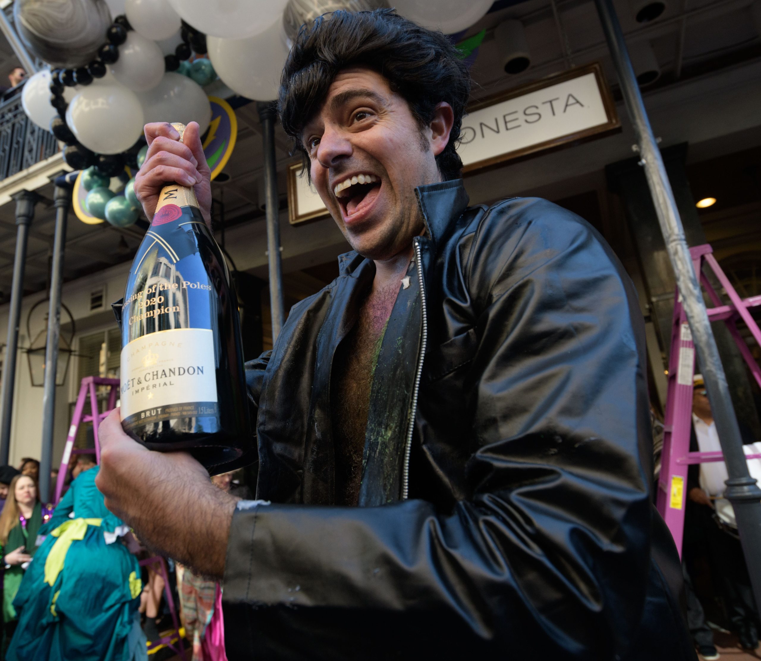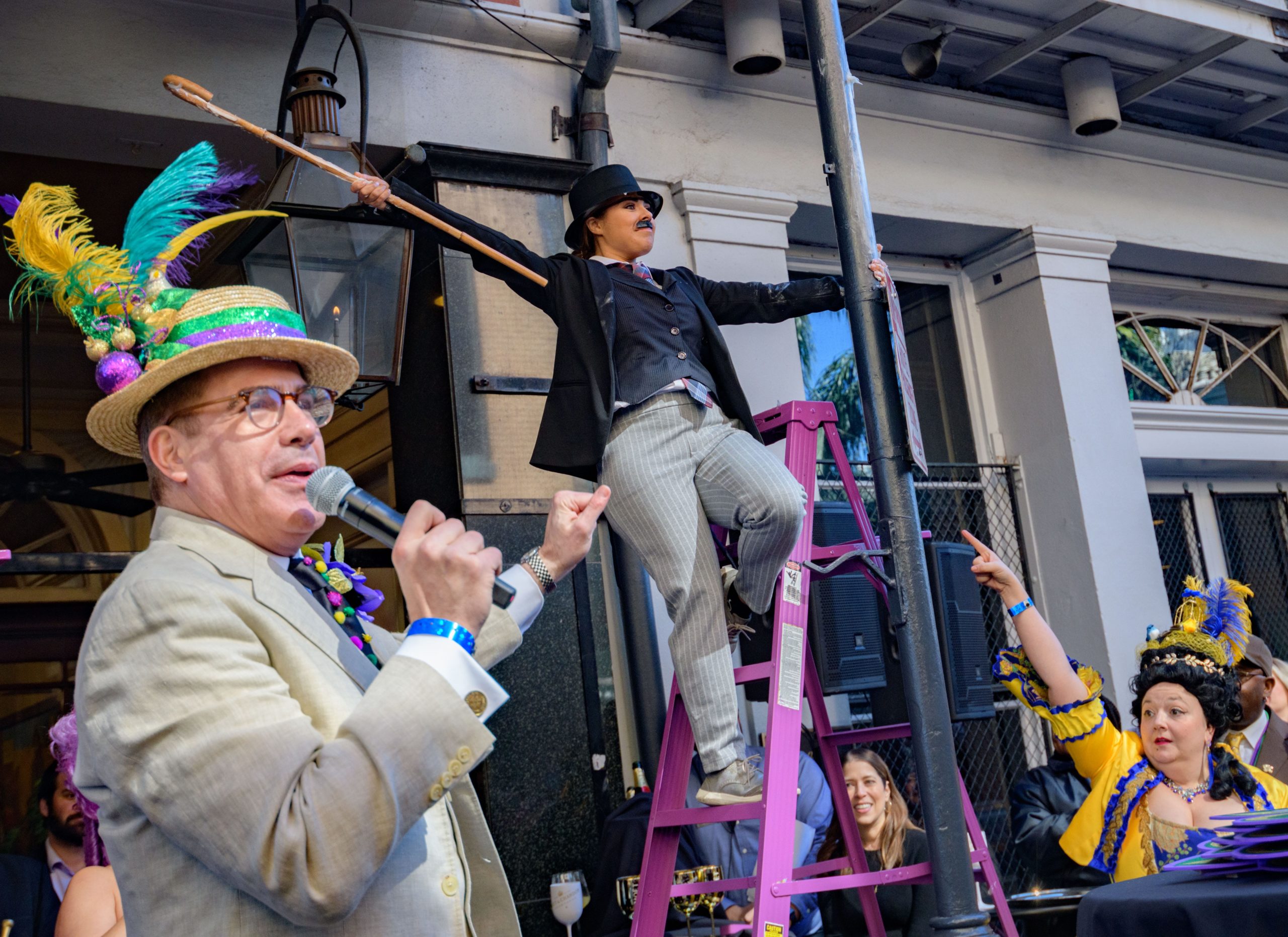 The tradition of greasing down poles at the Royal Sonesta Hotel in the French Quarter to keep parade-goers from shimmying up hotel balconies turns 50 this year. Known as the official kick off to Mardi Gras weekend, this event featured actor Bryan Batt as host and included appearances by Kenny Lopez from News with a Twist, who won this year, last year’s winner Desiree Ontiveros of Bad Ass Balloons wearing “Bitch Please” eyelashes, Miss New Orleans Pride 2020 Lana O’Day in shiny purple dress, Reagan Charleston Thomas of Southern Charm New Orleans, musician Amanda Shaw dressed as Charlie Chaplin’s Tramp, and renowned Big Easy burlesque dancer and performer, Trixie Minx. Leroy Jones and the Original Hurricane Brass Band entertained the crowd with special guests from the Merry Antoinettes, the Mystic Krewe of Femme Fatale, the Krewe of NOMTOC (New Orleans’ Most Talked Of Club) and the Krewe of Cork. Photo by Matthew Hinton