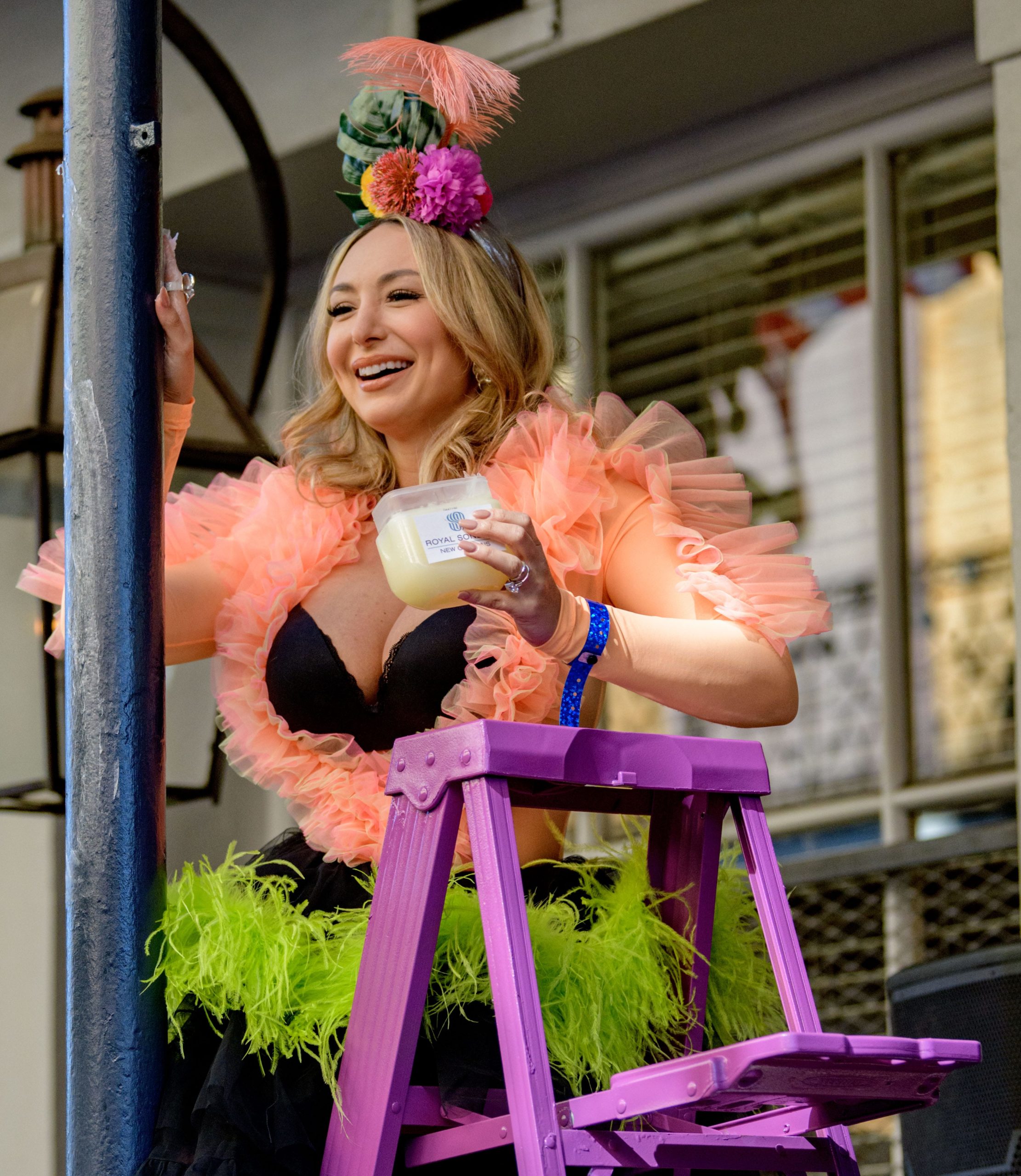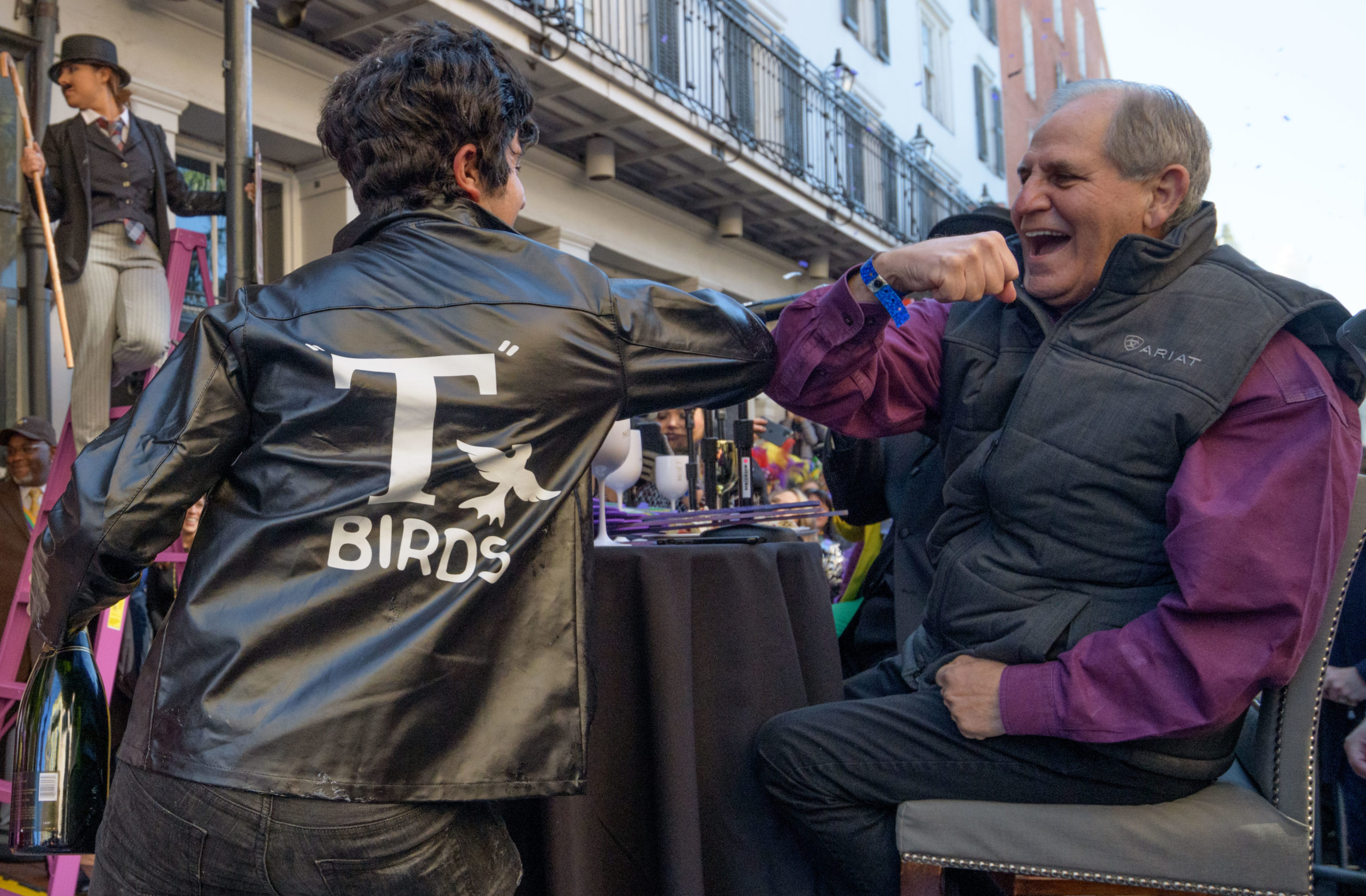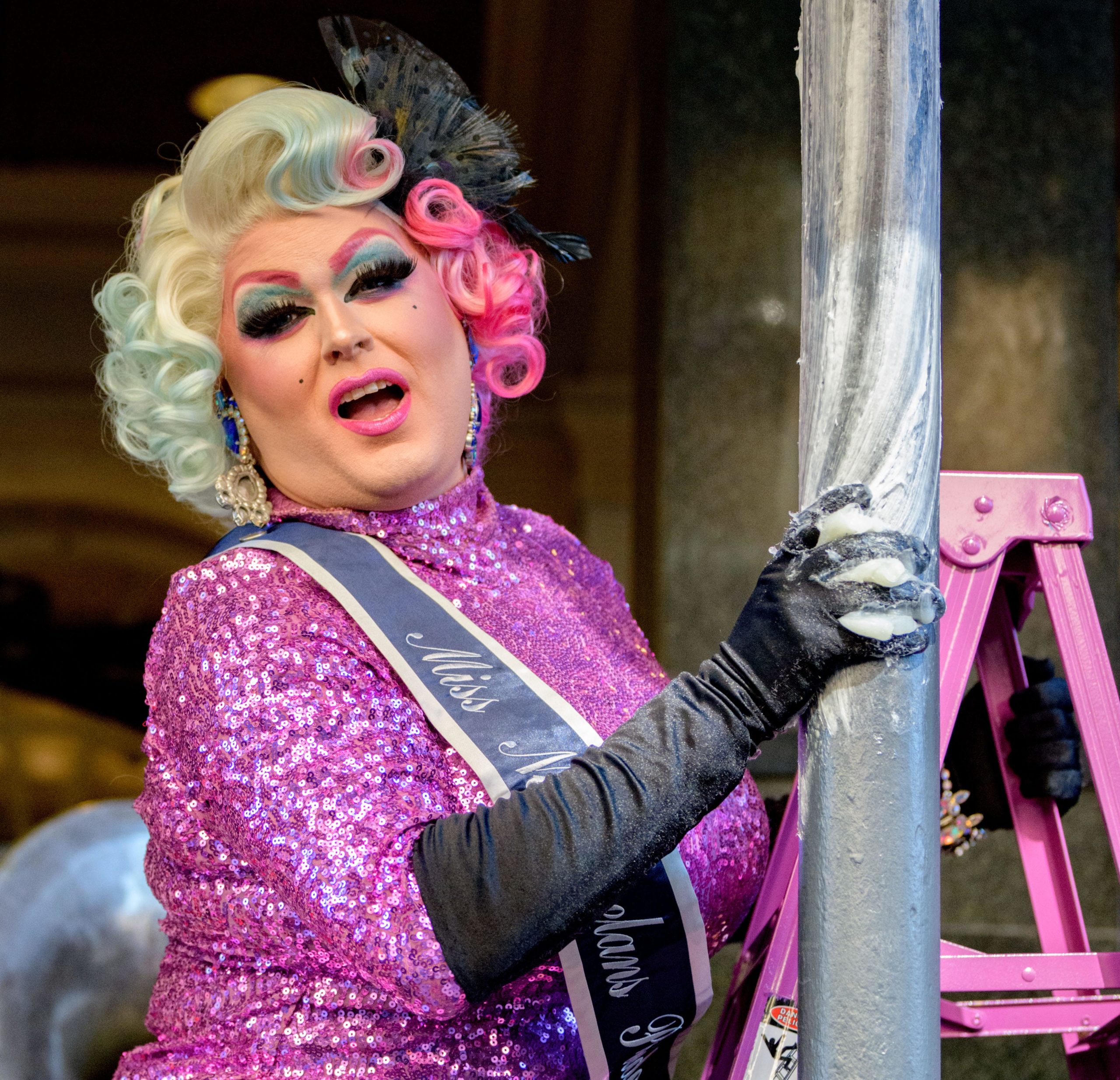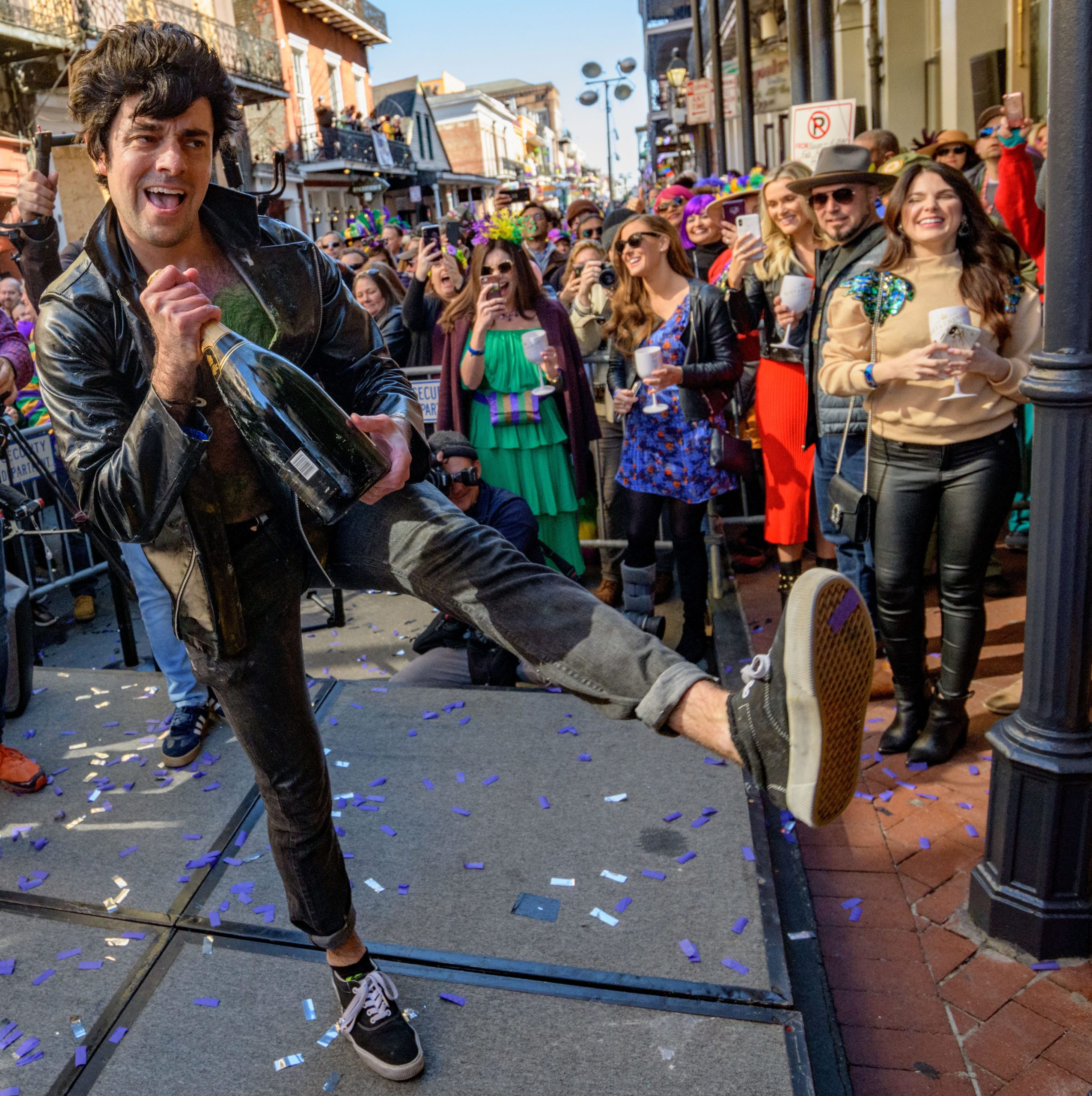 The tradition of greasing down poles at the Royal Sonesta Hotel in the French Quarter to keep parade-goers from shimmying up hotel balconies turns 50 this year. Known as the official kick off to Mardi Gras weekend, this event featured actor Bryan Batt as host and included appearances by Kenny Lopez from News with a Twist, who won this year, last year’s winner Desiree Ontiveros of Bad Ass Balloons wearing “Bitch Please” eyelashes, Miss New Orleans Pride 2020 Lana O’Day in shiny purple dress, Reagan Charleston Thomas of Southern Charm New Orleans, musician Amanda Shaw dressed as Charlie Chaplin’s Tramp, and renowned Big Easy burlesque dancer and performer, Trixie Minx. Leroy Jones and the Original Hurricane Brass Band entertained the crowd with special guests from the Merry Antoinettes, the Mystic Krewe of Femme Fatale, the Krewe of NOMTOC (New Orleans’ Most Talked Of Club) and the Krewe of Cork. Photo by Matthew Hinton