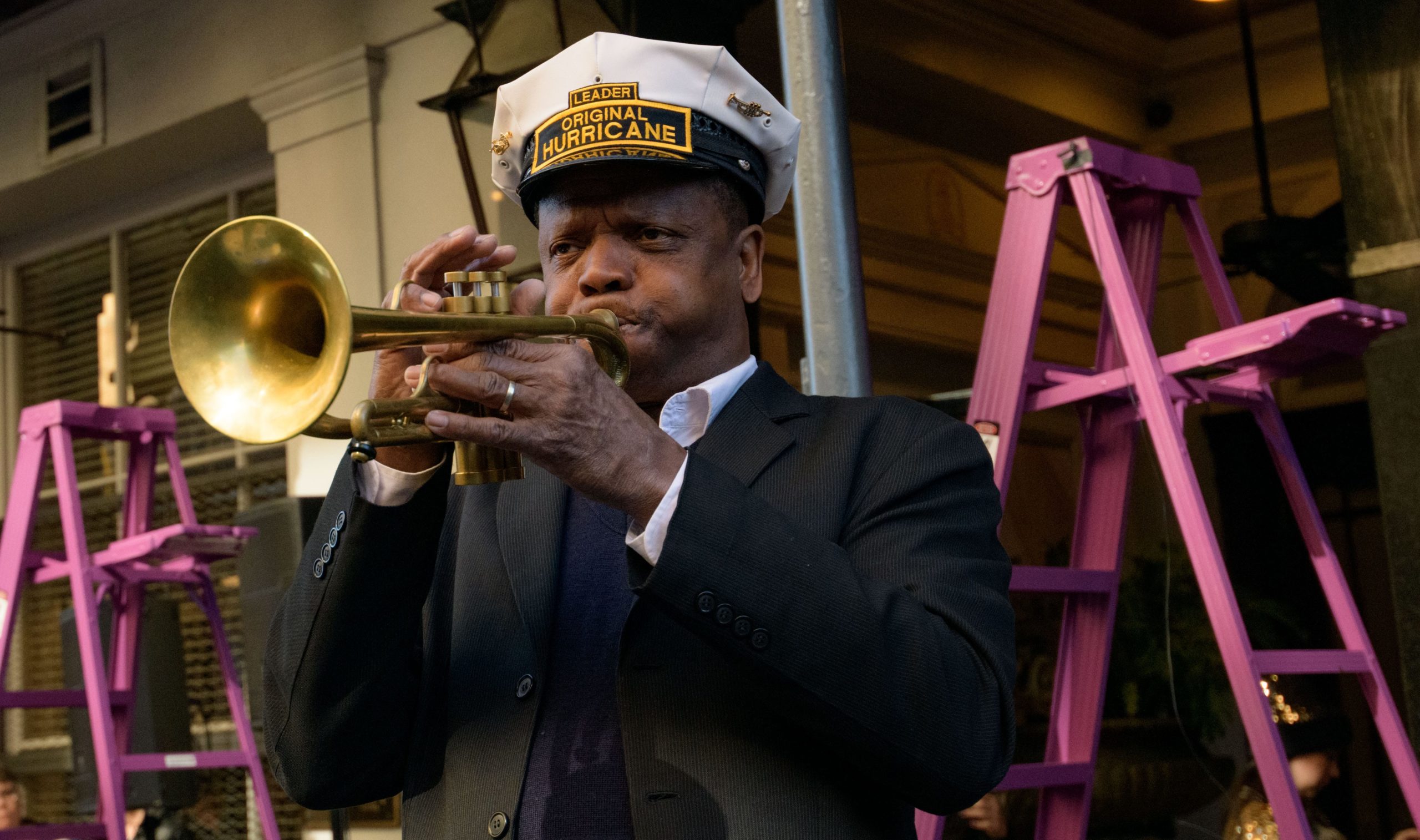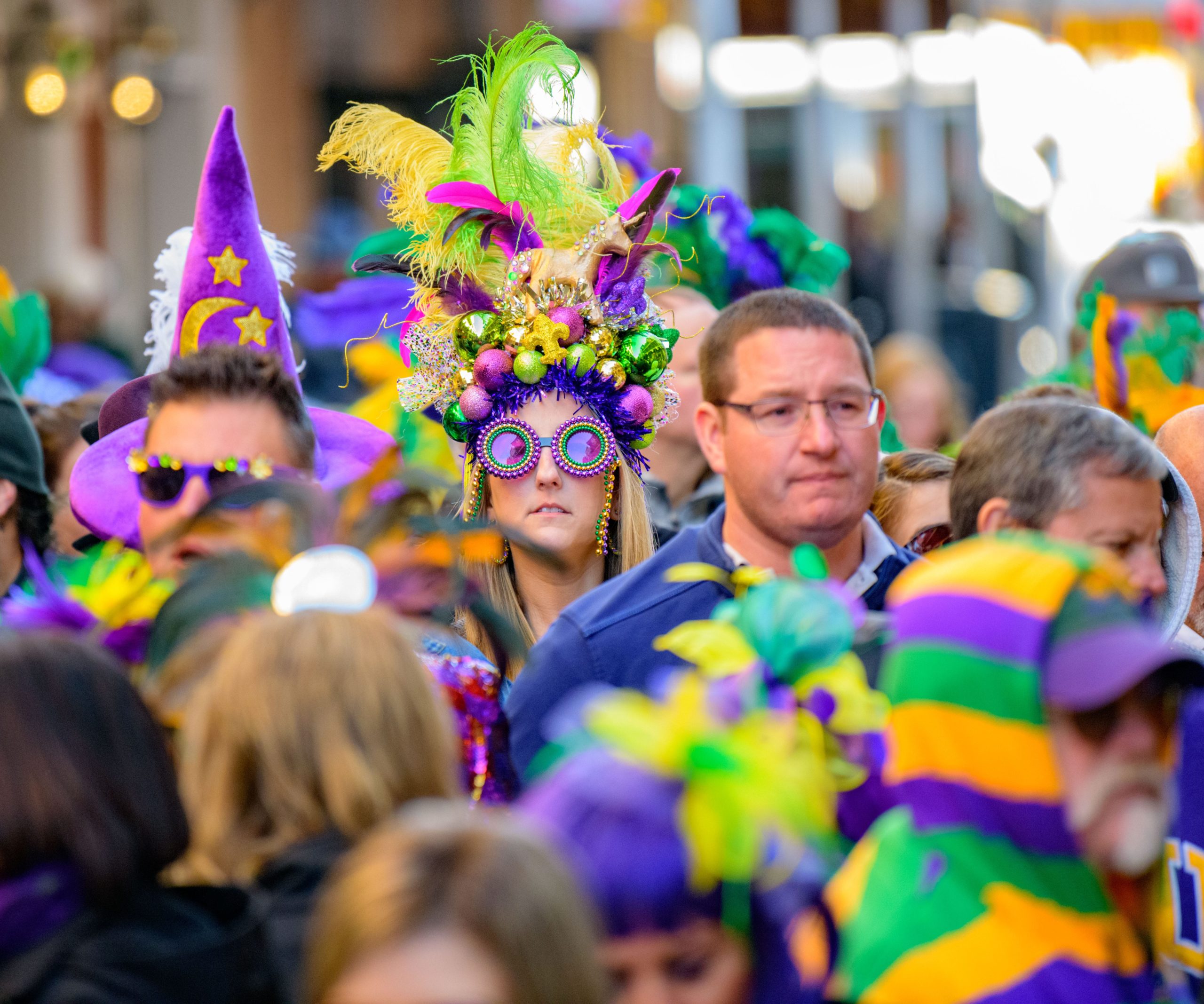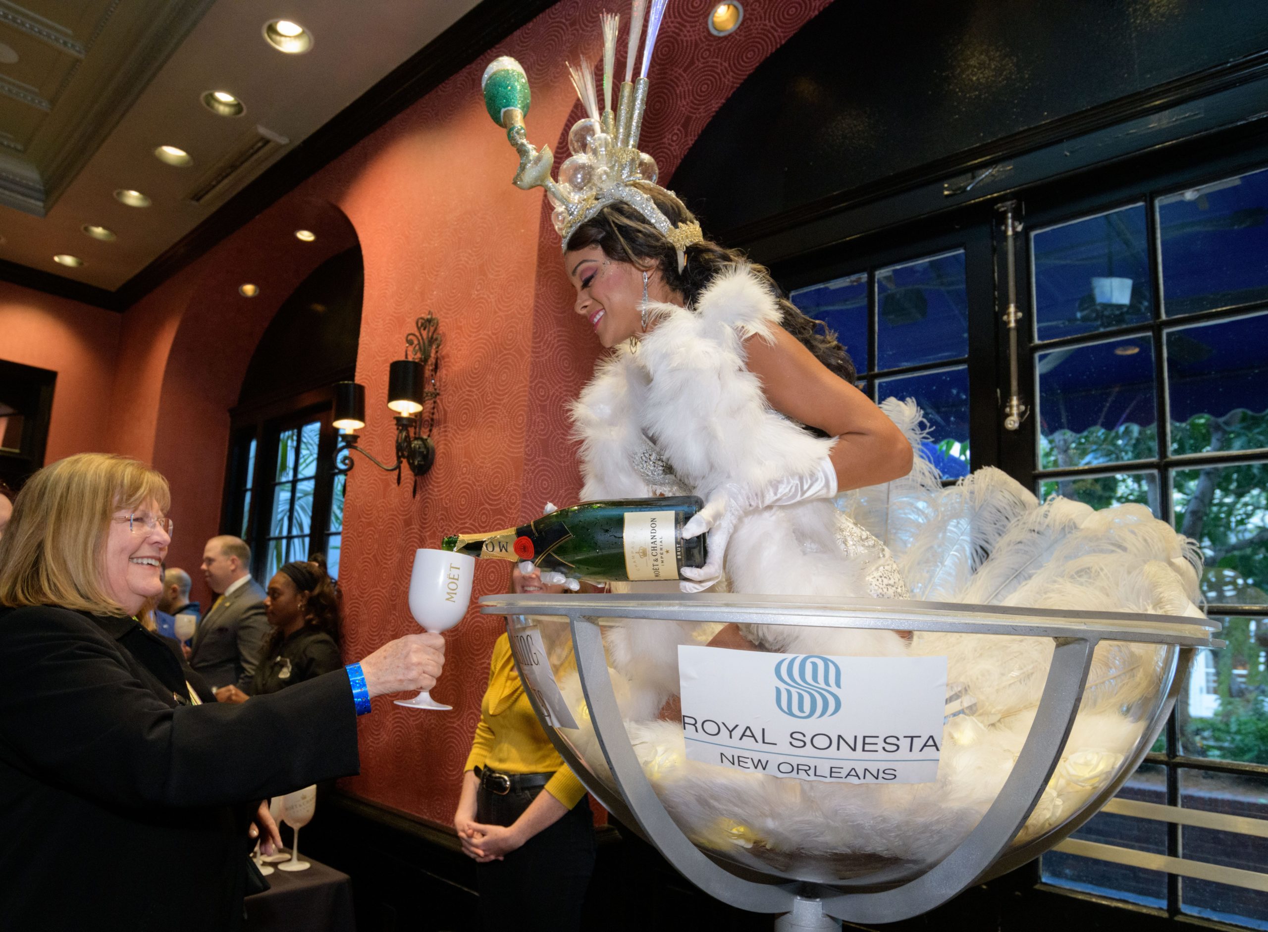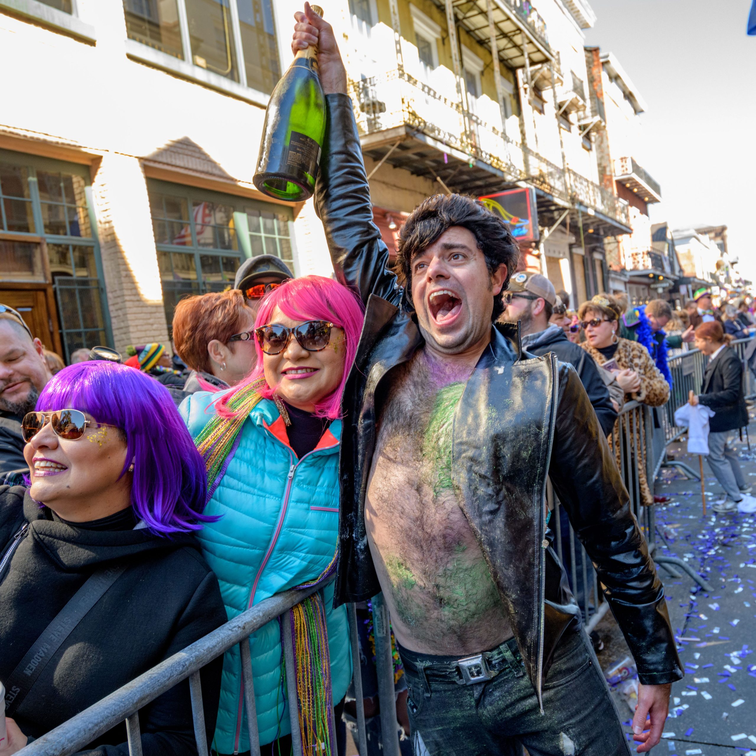 The tradition of greasing down poles at the Royal Sonesta Hotel in the French Quarter to keep parade-goers from shimmying up hotel balconies turns 50 this year. Known as the official kick off to Mardi Gras weekend, this event featured actor Bryan Batt as host and included appearances by Kenny Lopez from News with a Twist, who won this year, last year’s winner Desiree Ontiveros of Bad Ass Balloons wearing “Bitch Please” eyelashes, Miss New Orleans Pride 2020 Lana O’Day in shiny purple dress, Reagan Charleston Thomas of Southern Charm New Orleans, musician Amanda Shaw dressed as Charlie Chaplin’s Tramp, and renowned Big Easy burlesque dancer and performer, Trixie Minx. Leroy Jones and the Original Hurricane Brass Band entertained the crowd with special guests from the Merry Antoinettes, the Mystic Krewe of Femme Fatale, the Krewe of NOMTOC (New Orleans’ Most Talked Of Club) and the Krewe of Cork. Photo by Matthew Hinton