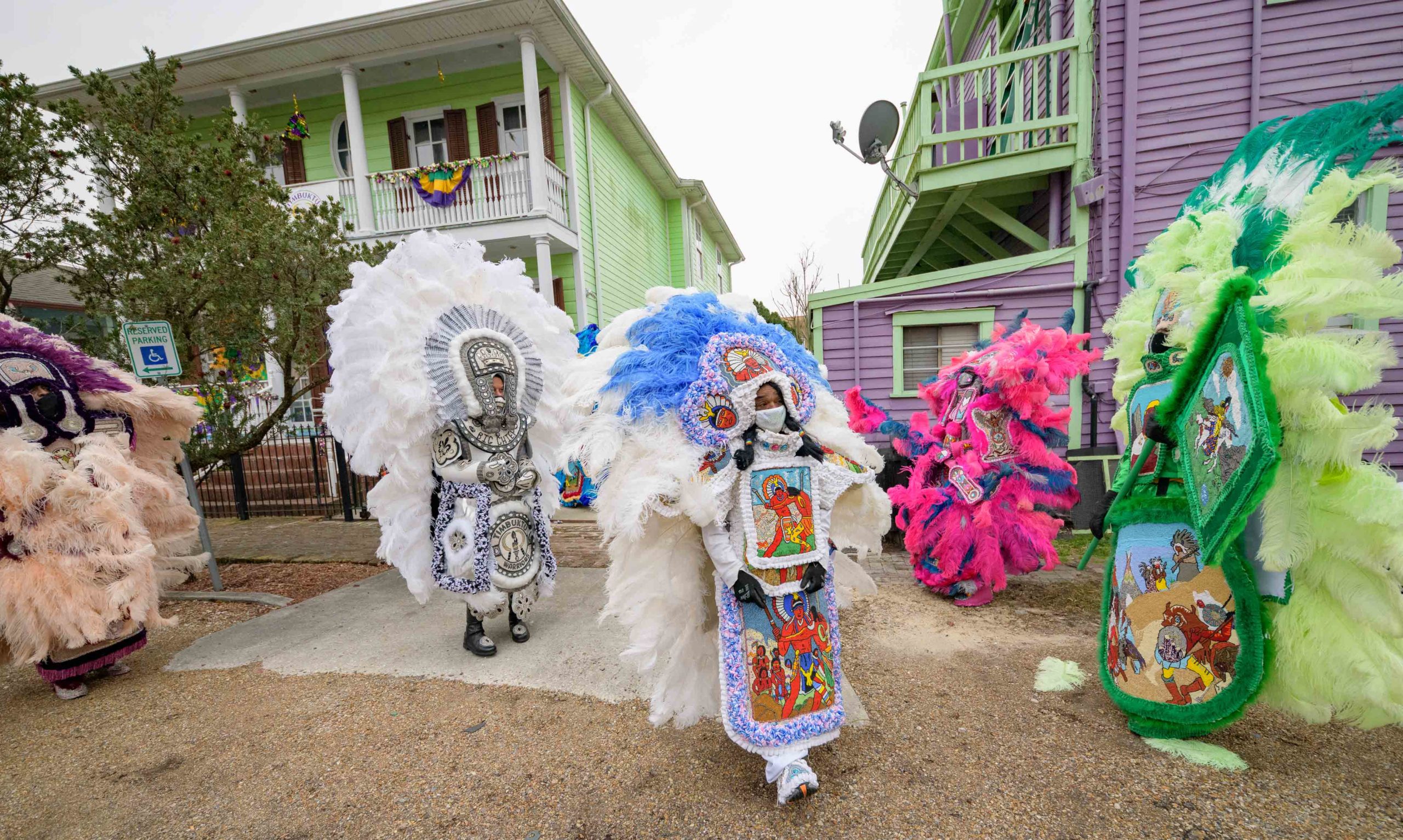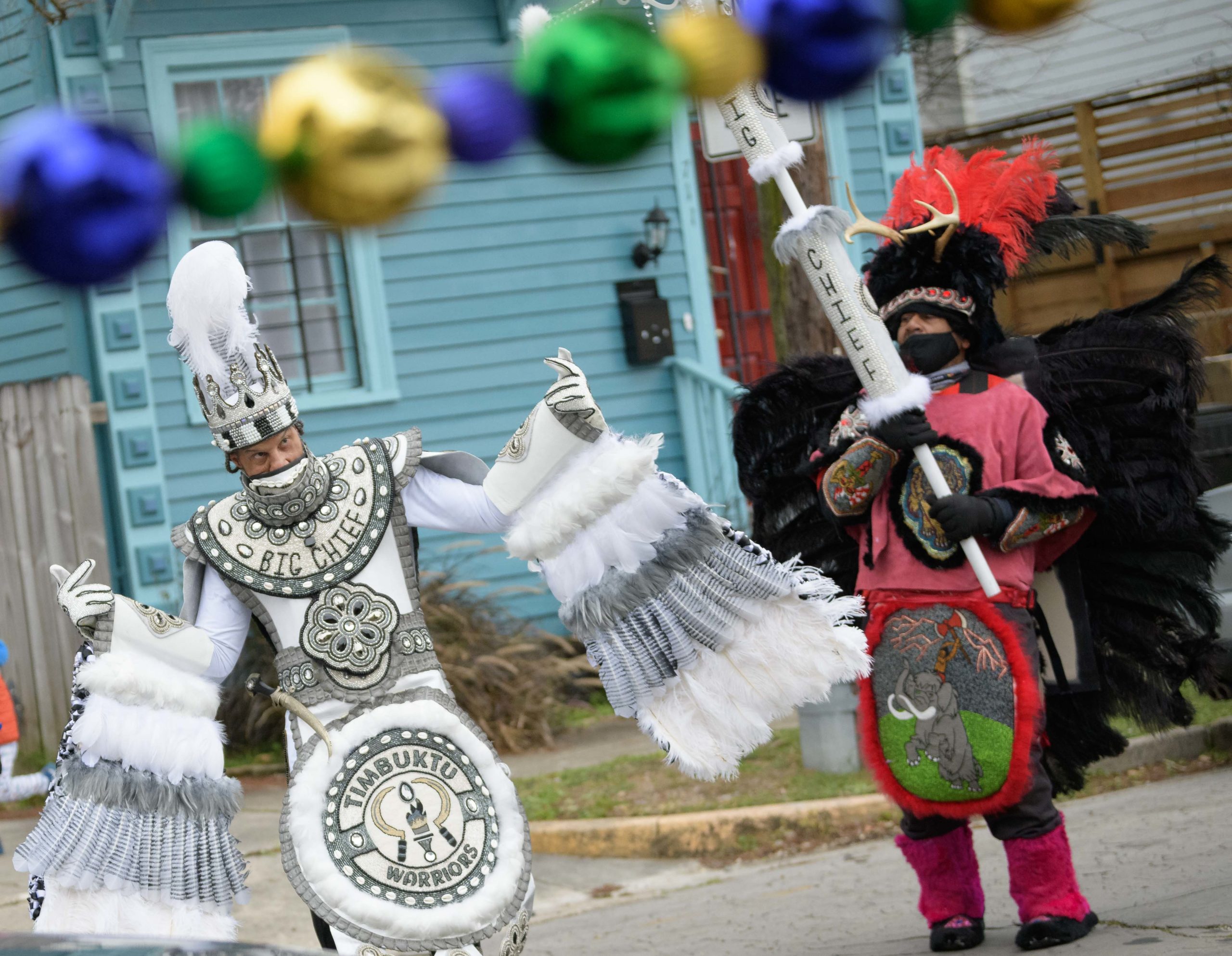 Early that mornin’ a house float came to life on Mardi Gras as Big Chief Dow Edwards of the Timbuktu Warriors paraded around the block of his home on Amelia Street in the Riverside neighborhood in New Orleans on Fat Tuesday, Feb 16, 2021. The weeks leading up to Mardi Gras Big Chief Dow displayed suits from his time as Spy Boy for the Mohawk Hunters as his house float. The Krewe of House Floats is an initiative to decorate homes during the Carnival season because of the cancellation and postponement of parades and gatherings for Mardi Gras 2021 due to the COVID-19 pandemic. Avoiding a crowd and staying off Magazine Street, Big Chief Dow and his gang / tribe of Black Masking Carnival Indians greeted neighbors from a safe distance while being masked up for the COVID-19 pandemic. @BigChiefDow was accompanied by his War Chief Bennie “Stickman” Russell, pink feathers, 3rd Chief Roderick Mitchell, light pink and purple, Second chief James Payne, white feathers, Gang Flag Milton Wright, green feathers, and wild man Jeffery Vincent, red and black feathers. Photo by Matthew Hinton