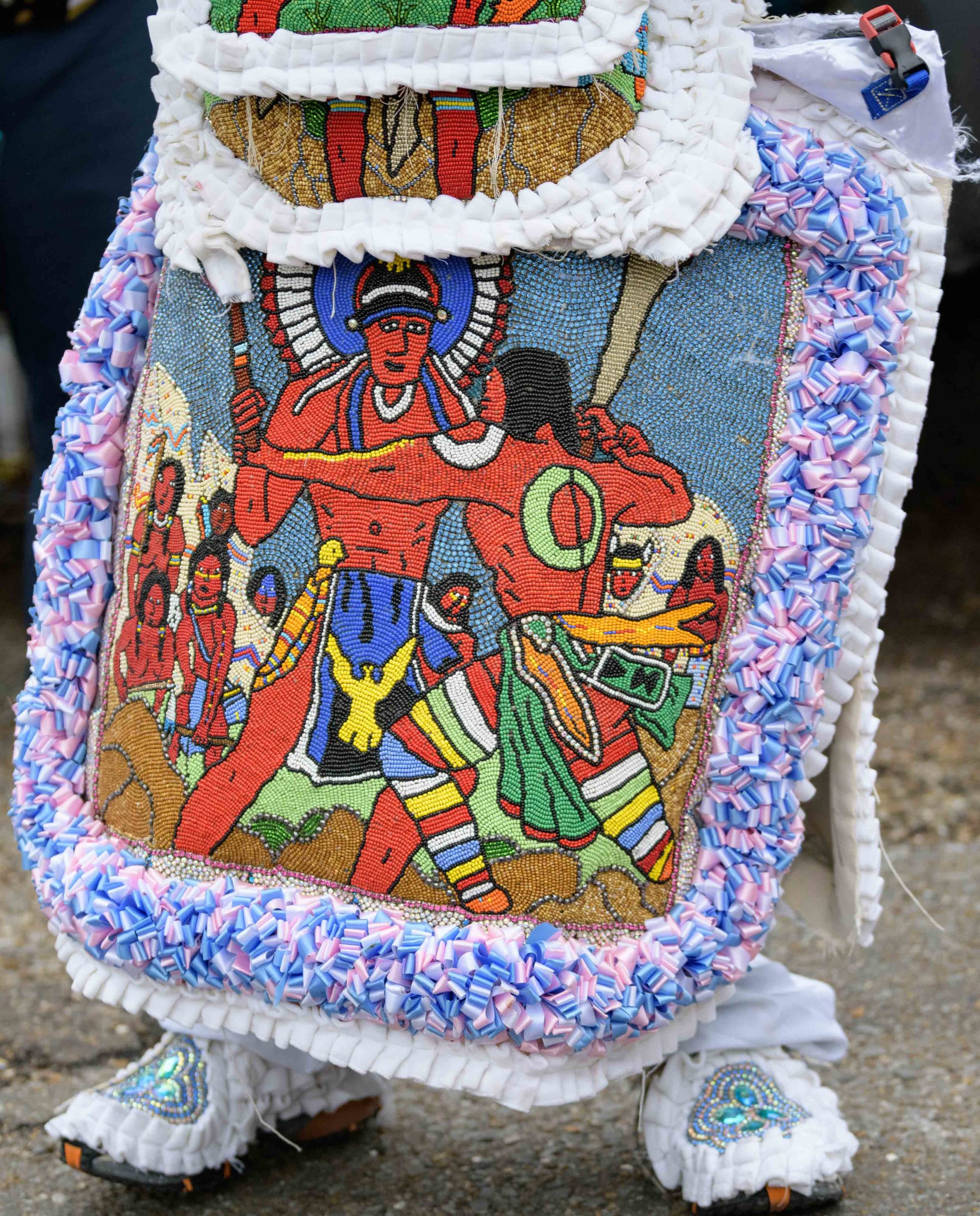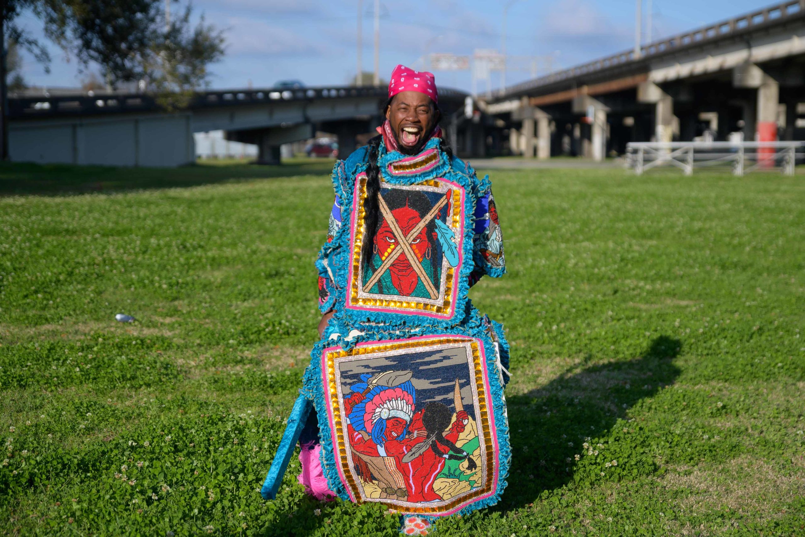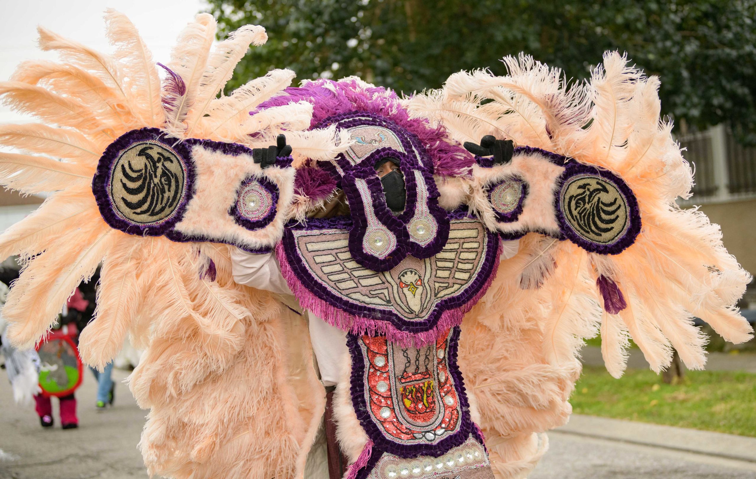 Grammy nominated trumpeter and Spy Boy Eric “Iammusic” Gordon, Jr. displayed a spear that said “MASK UP” as he met up with a small group Mardi Indians near Hunter’s Field in the 7th Ward, a traditional spot for Black Masking Indians to gather on Mardi Gras Feb. 16, 2021. Other Carnival Indians in attendance included Golden Blades Flag Boy Dan Edwards, in blue and pink feathers, Golden Blades Spy Boy K-Nine, Alphonse Feliciana, and in her first time masking, Yellow Pocahontas Big Queen Dianne Honore Destrehan. Destrehan normally comes out as a baby doll on Mardi Gras but with the tutelage of Yellow Pocahontas Big Chief Darryl Montana she sewed her first suit and it was pretty, pretty. She said her fingers will never be the same after they received numerous pin and needle pricks from sewing the suit. Normally the Indians would congregate under the Claiborne bridge in the Lafitte-Treme neighborhood but the mayor fenced off the overpass because of the concern of large crowds gatherings. The first known Carnival Indian gang started around the 1880s with the Creole Wild West led by Chief Becate Batiste, a Creole who was part Choctaw, French, and African-American. Indian suits often depict stories with sewn beads of Native Americans battling the United States cavalry, cowboys, or conquistadors. Other Indian gangs are more influenced by West African and Afro-Caribbean cultures and their suits can have shells, glass, and geometric patterns, while others like the Yellow Pocahontas have three-dimensional beaded structures sometimes representing animals or other sculptures protruding from the suit.