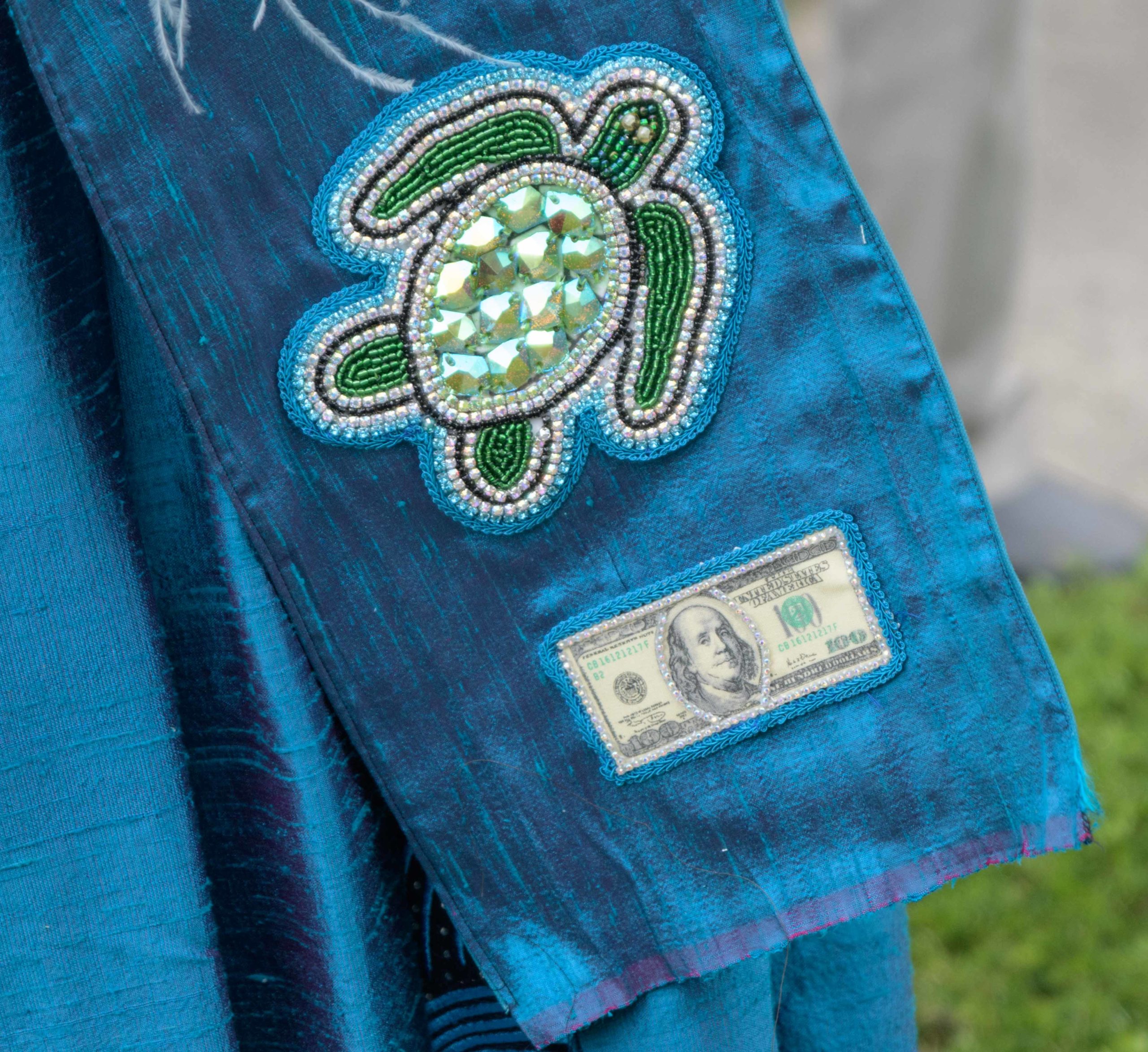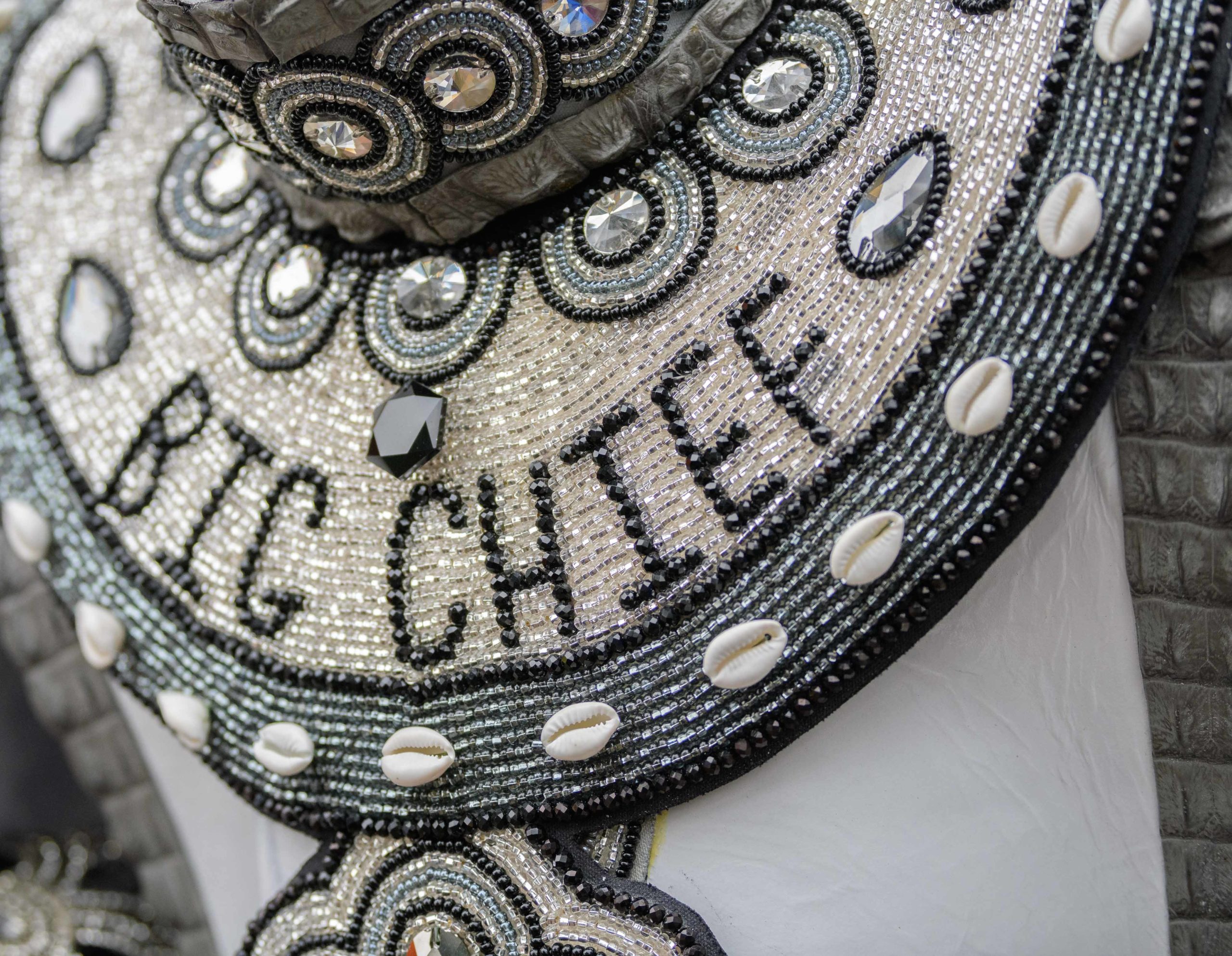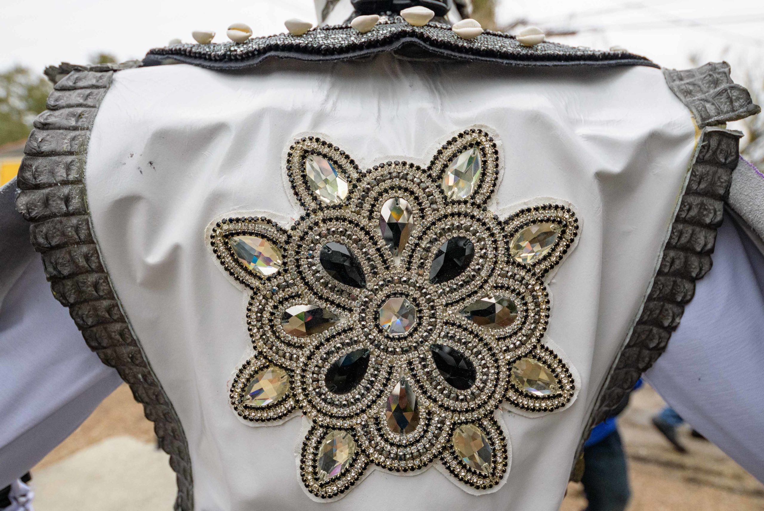 Grammy nominated trumpeter and Spy Boy Eric “Iammusic” Gordon, Jr. displayed a spear that said “MASK UP” as he met up with a small group Mardi Indians near Hunter’s Field in the 7th Ward, a traditional spot for Black Masking Indians to gather on Mardi Gras Feb. 16, 2021. Other Carnival Indians in attendance included Golden Blades Flag Boy Dan Edwards, in blue and pink feathers, Golden Blades Spy Boy K-Nine, Alphonse Feliciana, and in her first time masking, Yellow Pocahontas Big Queen Dianne Honore Destrehan. Destrehan normally comes out as a baby doll on Mardi Gras but with the tutelage of Yellow Pocahontas Big Chief Darryl Montana she sewed her first suit and it was pretty, pretty. She said her fingers will never be the same after they received numerous pin and needle pricks from sewing the suit. Normally the Indians would congregate under the Claiborne bridge in the Lafitte-Treme neighborhood but the mayor fenced off the overpass because of the concern of large crowds gatherings. The first known Carnival Indian gang started around the 1880s with the Creole Wild West led by Chief Becate Batiste, a Creole who was part Choctaw, French, and African-American. Indian suits often depict stories with sewn beads of Native Americans battling the United States cavalry, cowboys, or conquistadors. Other Indian gangs are more influenced by West African and Afro-Caribbean cultures and their suits can have shells, glass, and geometric patterns, while others like the Yellow Pocahontas have three-dimensional beaded structures sometimes representing animals or other sculptures protruding from the suit.