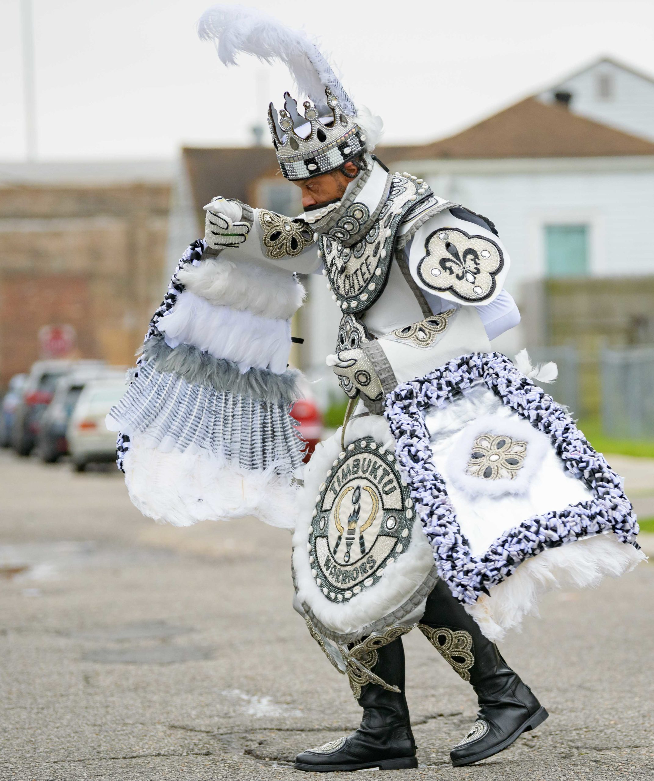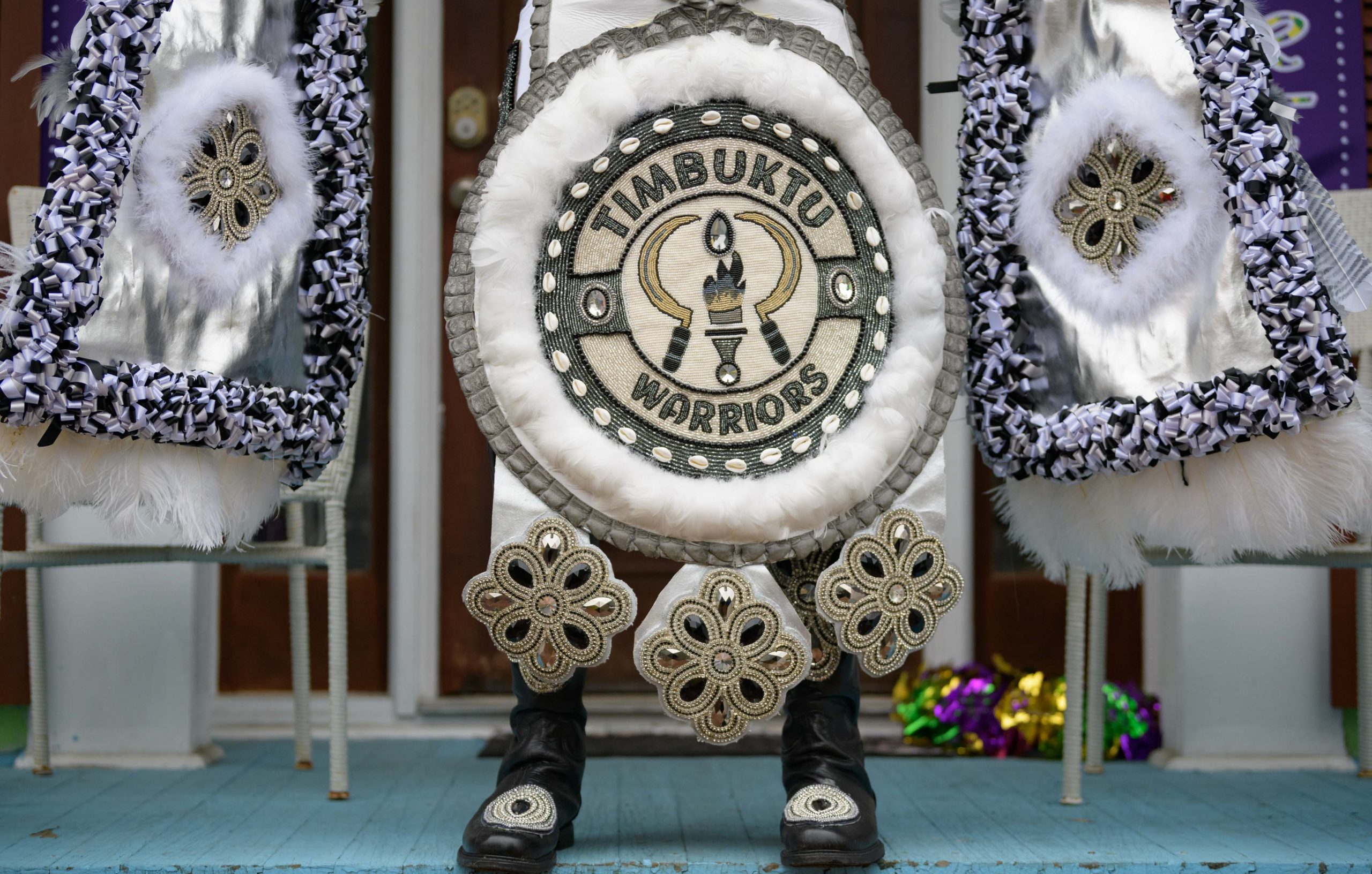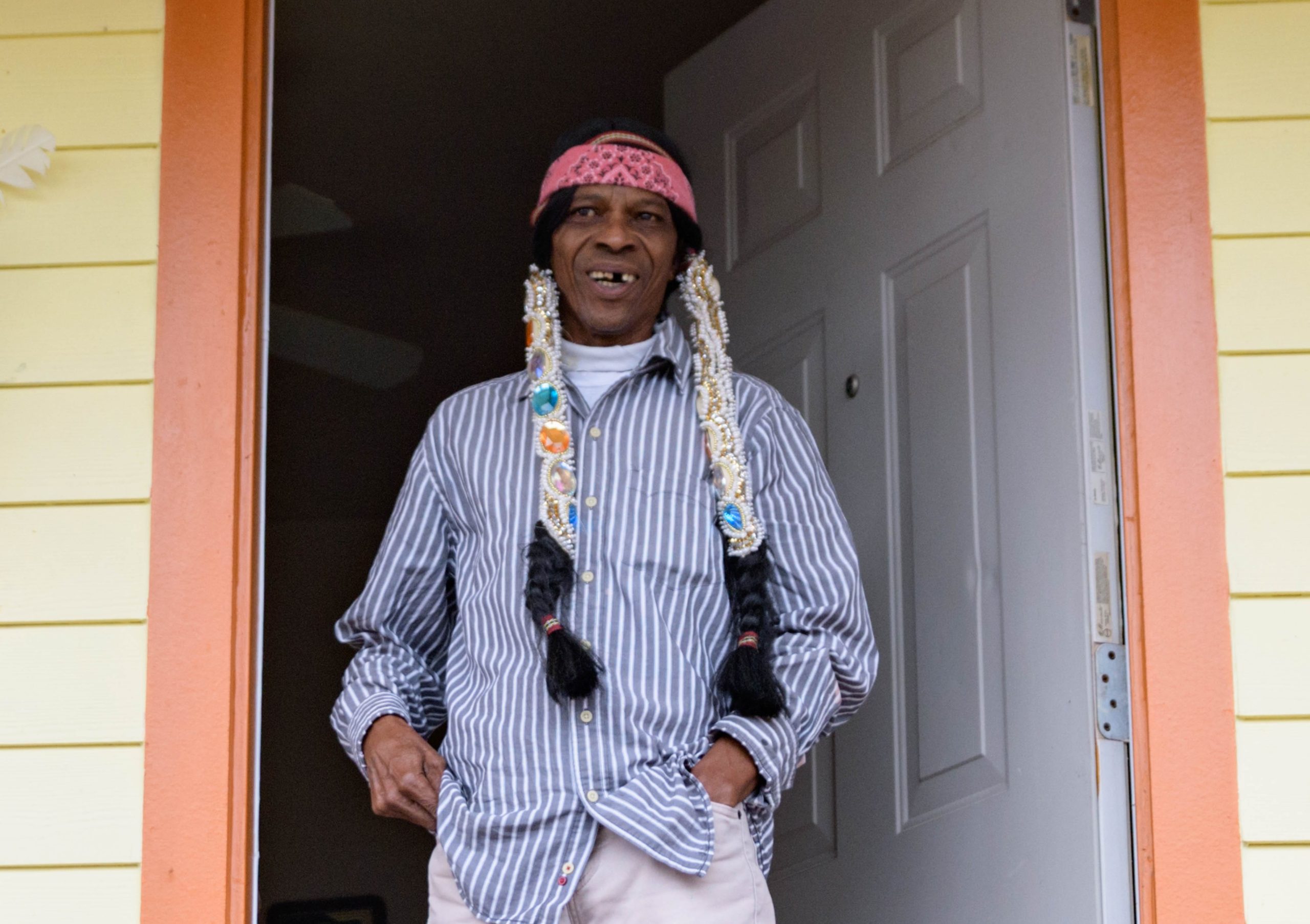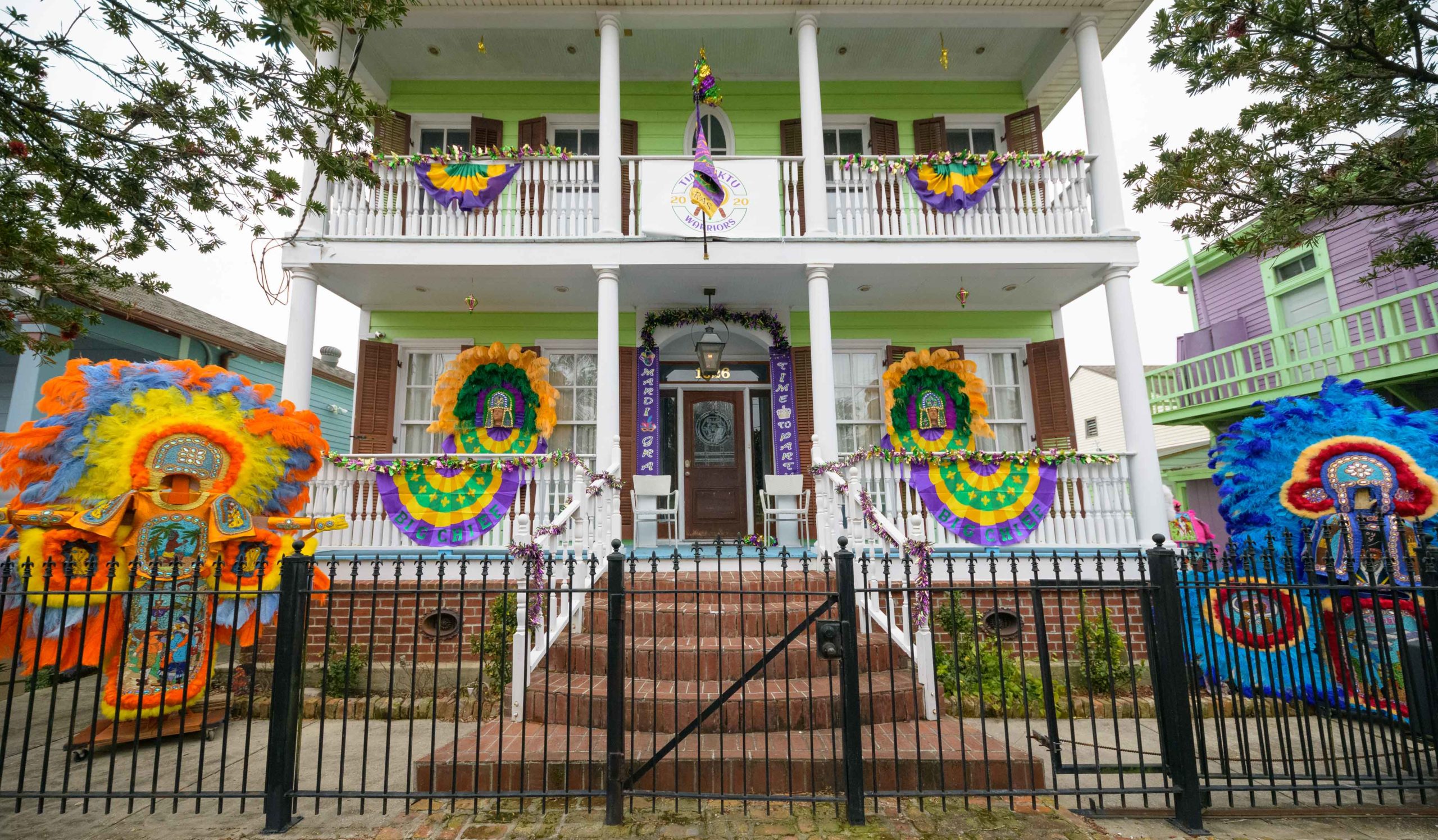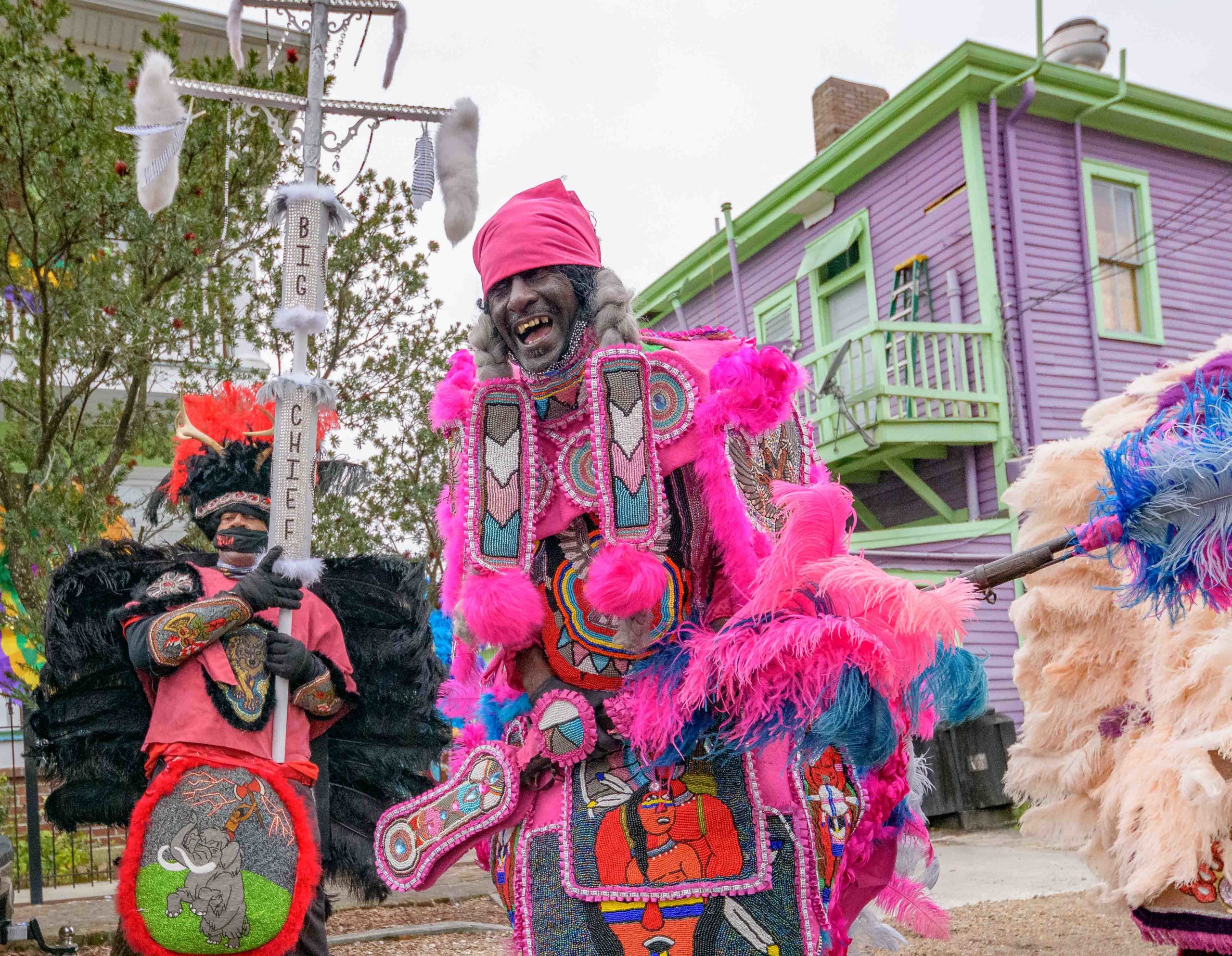 Early that mornin’ a house float came to life on Mardi Gras as Big Chief Dow Edwards of the Timbuktu Warriors paraded around the block of his home on Amelia Street in the Riverside neighborhood in New Orleans on Fat Tuesday, Feb 16, 2021. The weeks leading up to Mardi Gras Big Chief Dow displayed suits from his time as Spy Boy for the Mohawk Hunters as his house float. The Krewe of House Floats is an initiative to decorate homes during the Carnival season because of the cancellation and postponement of parades and gatherings for Mardi Gras 2021 due to the COVID-19 pandemic. Avoiding a crowd and staying off Magazine Street, Big Chief Dow and his gang / tribe of Black Masking Carnival Indians greeted neighbors from a safe distance while being masked up for the COVID-19 pandemic. @BigChiefDow was accompanied by his War Chief Bennie “Stickman” Russell, pink feathers, 3rd Chief Roderick Mitchell, light pink and purple, Second chief James Payne, white feathers, Gang Flag Milton Wright, green feathers, and wild man Jeffery Vincent, red and black feathers.