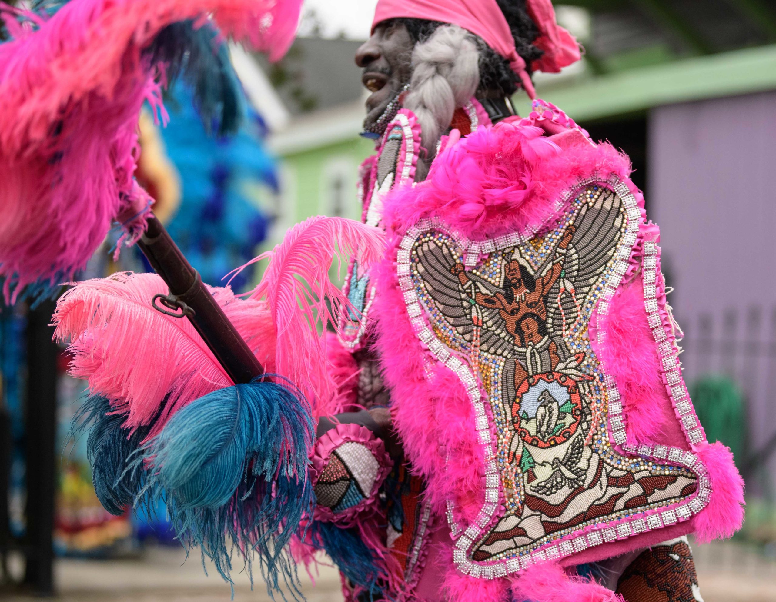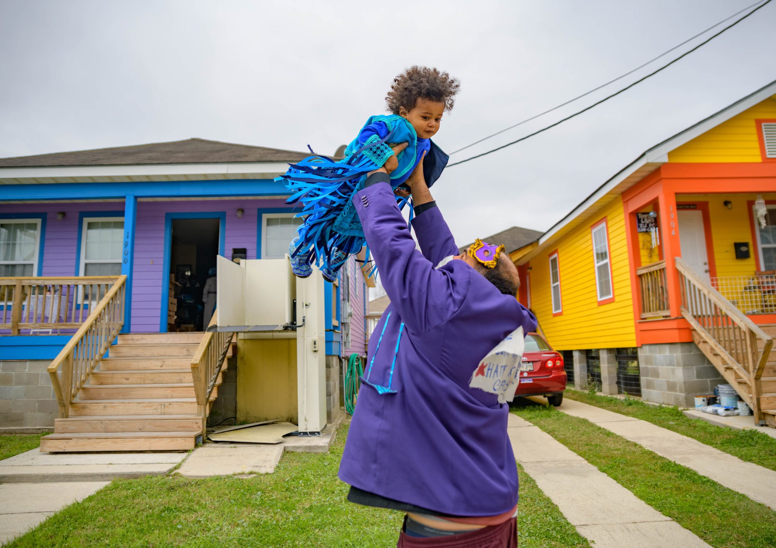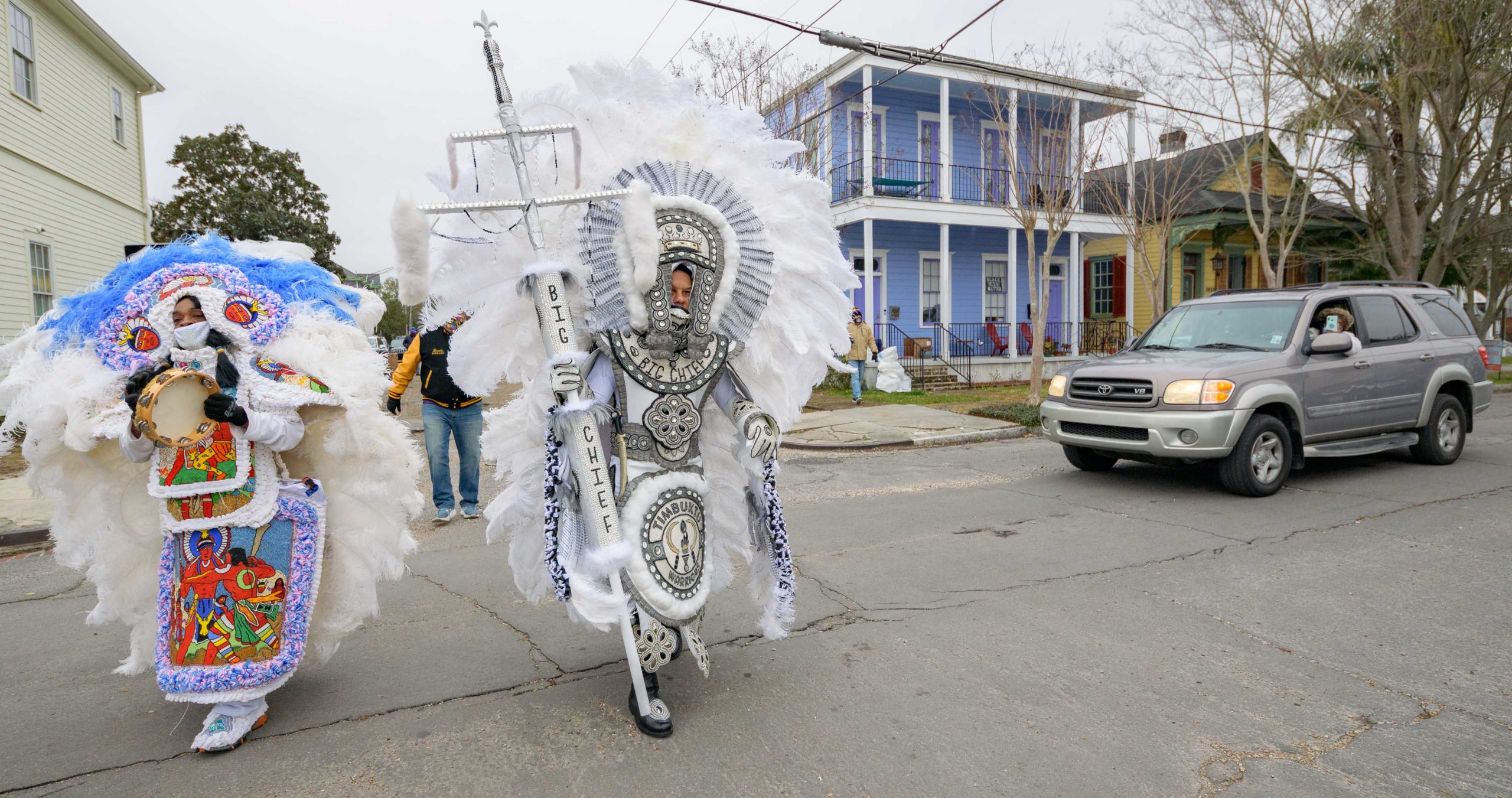 Guardians of the Flame Maroon Queen Cherice Harrison-Nelson led a procession around Musicians Village in the Upper 9th Ward as she honored the late Guardians Consul Chief Joseph Jenkins on Mardi Gras, Feb. 16, 2021. A tiny Guardians of the Flame Mardi Gras Indian Deliam Frazier, 18 months, made his debut with the tribe. After leaving his former home the Guardians traveled to other neighbors including Al “Carnival Time” Johnson, who waved and sang from a safe distance from his home in the Upper 9th Ward. Harrison-Nelson’s father was Big Chief Donald Harrison Sr. of the Guardians of the Flame and a former Big Chief for the Creole Wild West Indians gang. This group is believed to be one of the first Mardi Gras Indian gangs founded in the 1880s by Becate Batiste, a Seventh Ward Creole of African-American, French, and Choctaw heritage. Maroon Queen Cherice honors “Maroons” who escaped slavery plantations in Southeast Louisiana and mingled with local Native American tribes. Her machete is a symbol for the maroons who used it to cut through the brush and for protection.