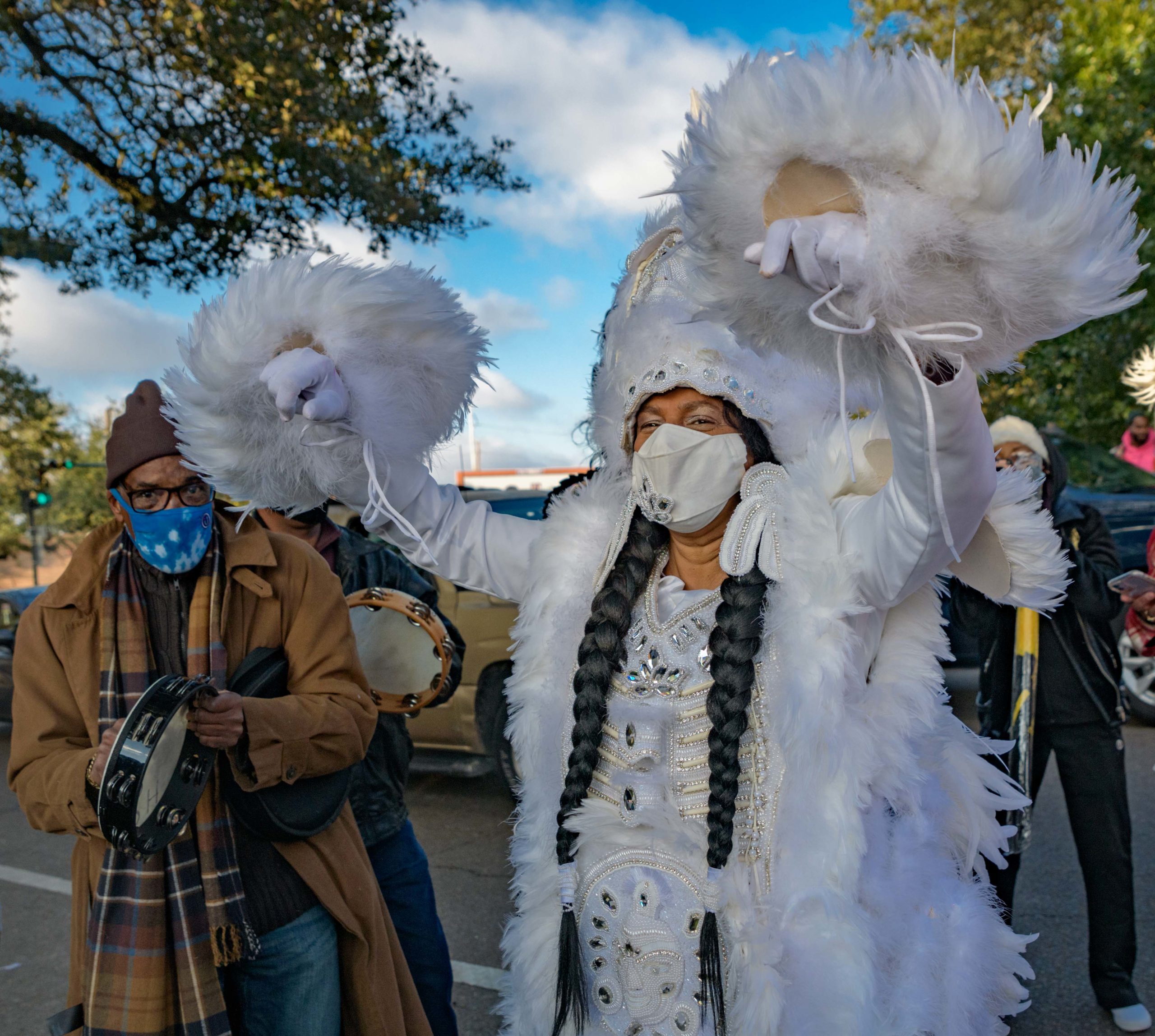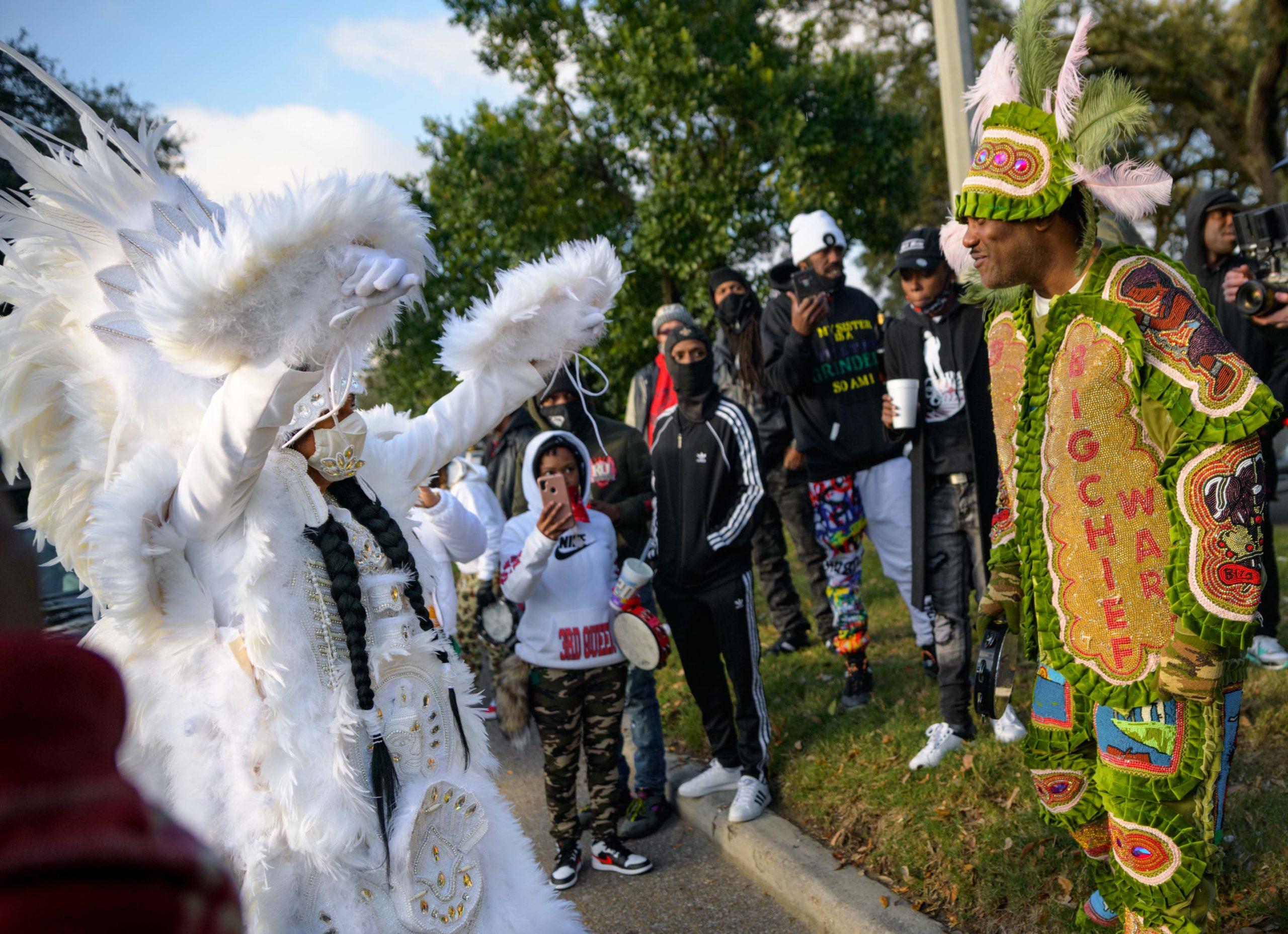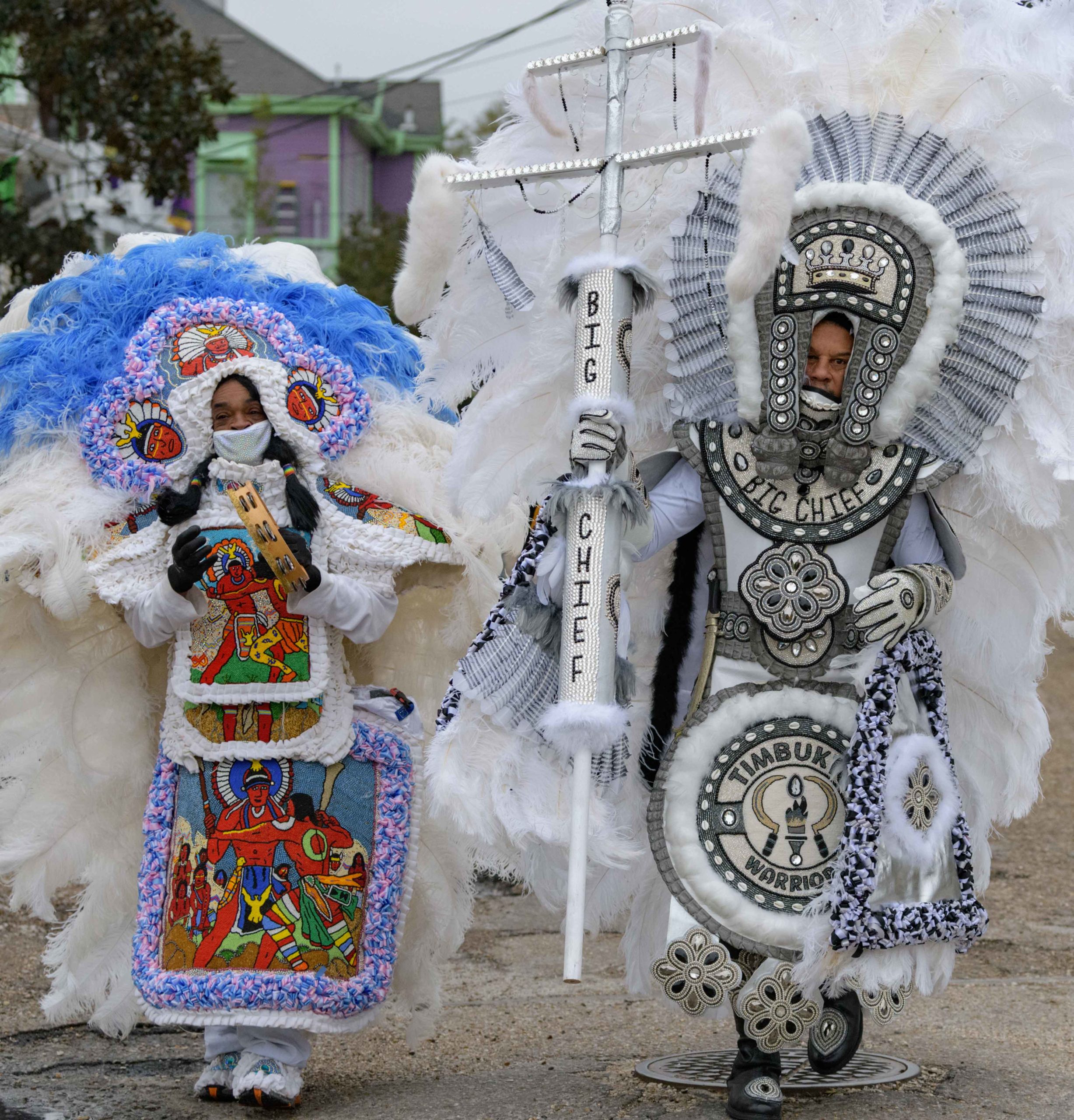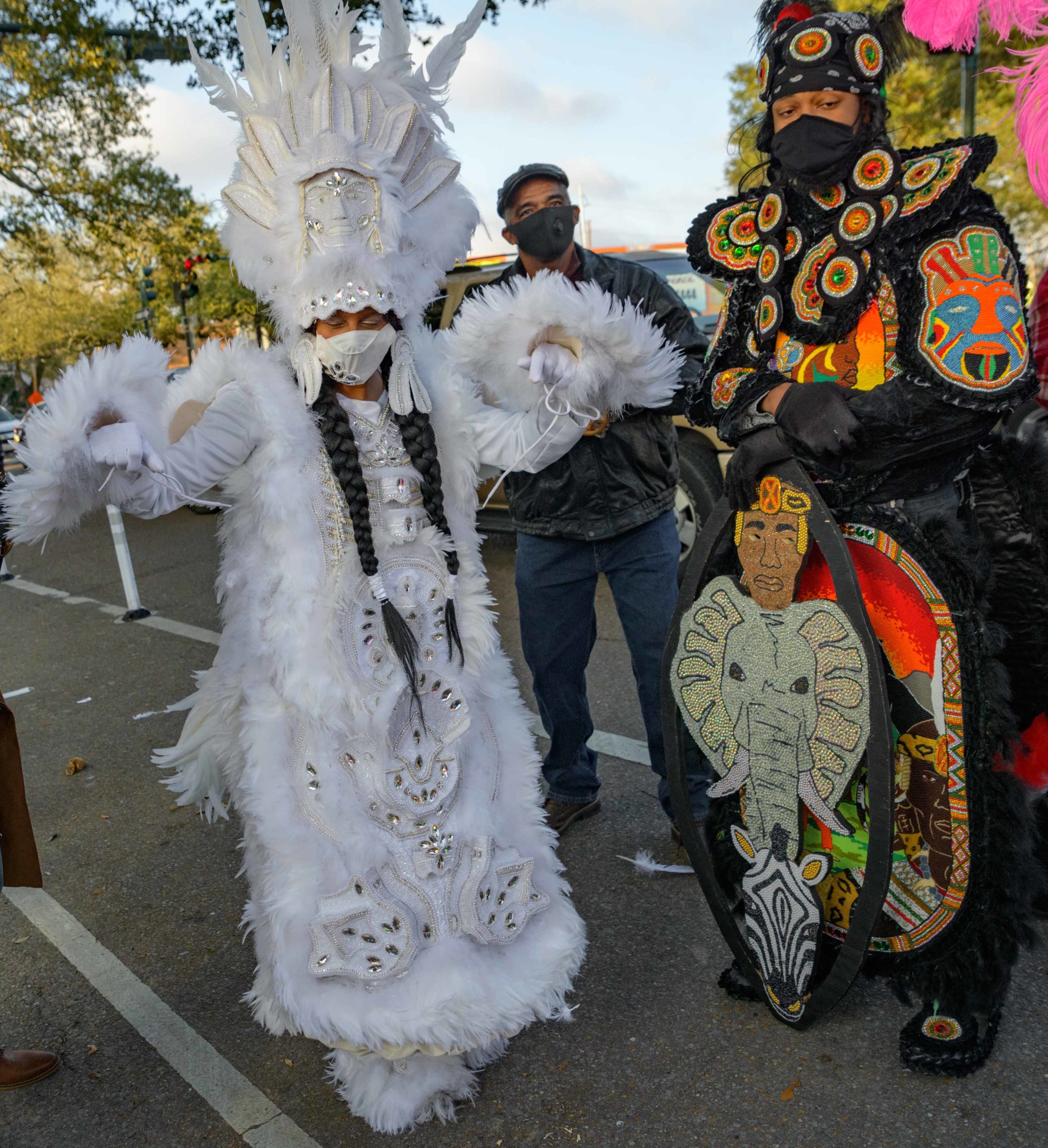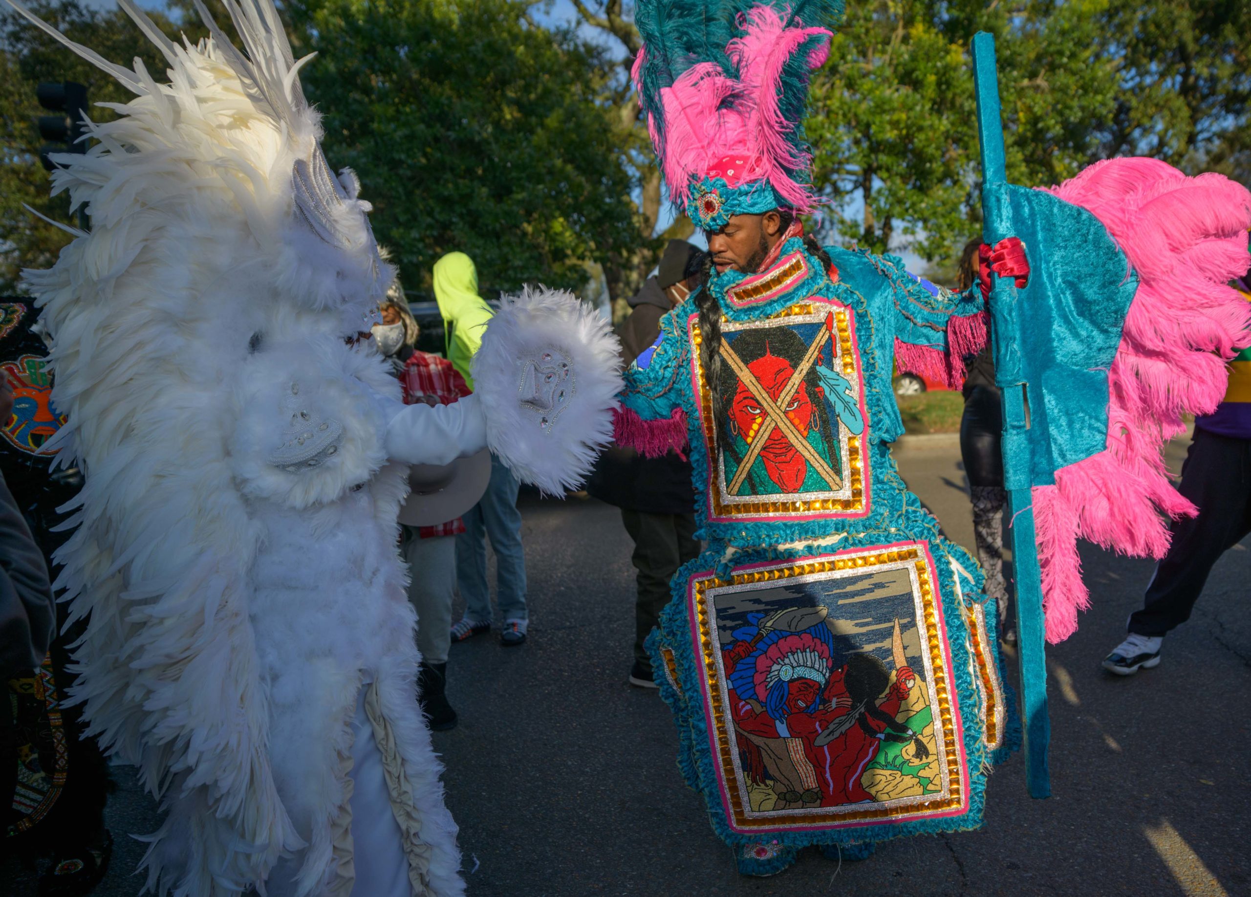 Grammy nominated trumpeter and Spy Boy Eric “Iammusic” Gordon, Jr. displayed a spear that said “MASK UP” as he met up with a small group Mardi Indians near Hunter’s Field in the 7th Ward, a traditional spot for Black Masking Indians to gather on Mardi Gras Feb. 16, 2021. Other Carnival Indians in attendance included Golden Blades Flag Boy Dan Edwards, in blue and pink feathers, Golden Blades Spy Boy K-Nine, Alphonse Feliciana, and in her first time masking, Yellow Pocahontas Big Queen Dianne Honore Destrehan. Destrehan normally comes out as a baby doll on Mardi Gras but with the tutelage of Yellow Pocahontas Big Chief Darryl Montana she sewed her first suit and it was pretty, pretty. She said her fingers will never be the same after they received numerous pin and needle pricks from sewing the suit. Normally the Indians would congregate under the Claiborne bridge in the Lafitte-Treme neighborhood but the mayor fenced off the overpass because of the concern of large crowds gatherings. The first known Carnival Indian gang started around the 1880s with the Creole Wild West led by Chief Becate Batiste, a Creole who was part Choctaw, French, and African-American. Indian suits often depict stories with sewn beads of Native Americans battling the United States cavalry, cowboys, or conquistadors. Other Indian gangs are more influenced by West African and Afro-Caribbean cultures and their suits can have shells, glass, and geometric patterns, while others like the Yellow Pocahontas have three-dimensional beaded structures sometimes representing animals or other sculptures protruding from the suit. Photo by Matthew Hinton