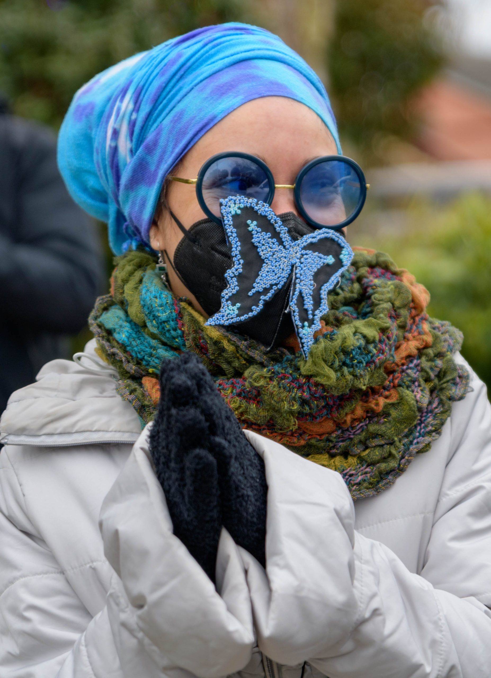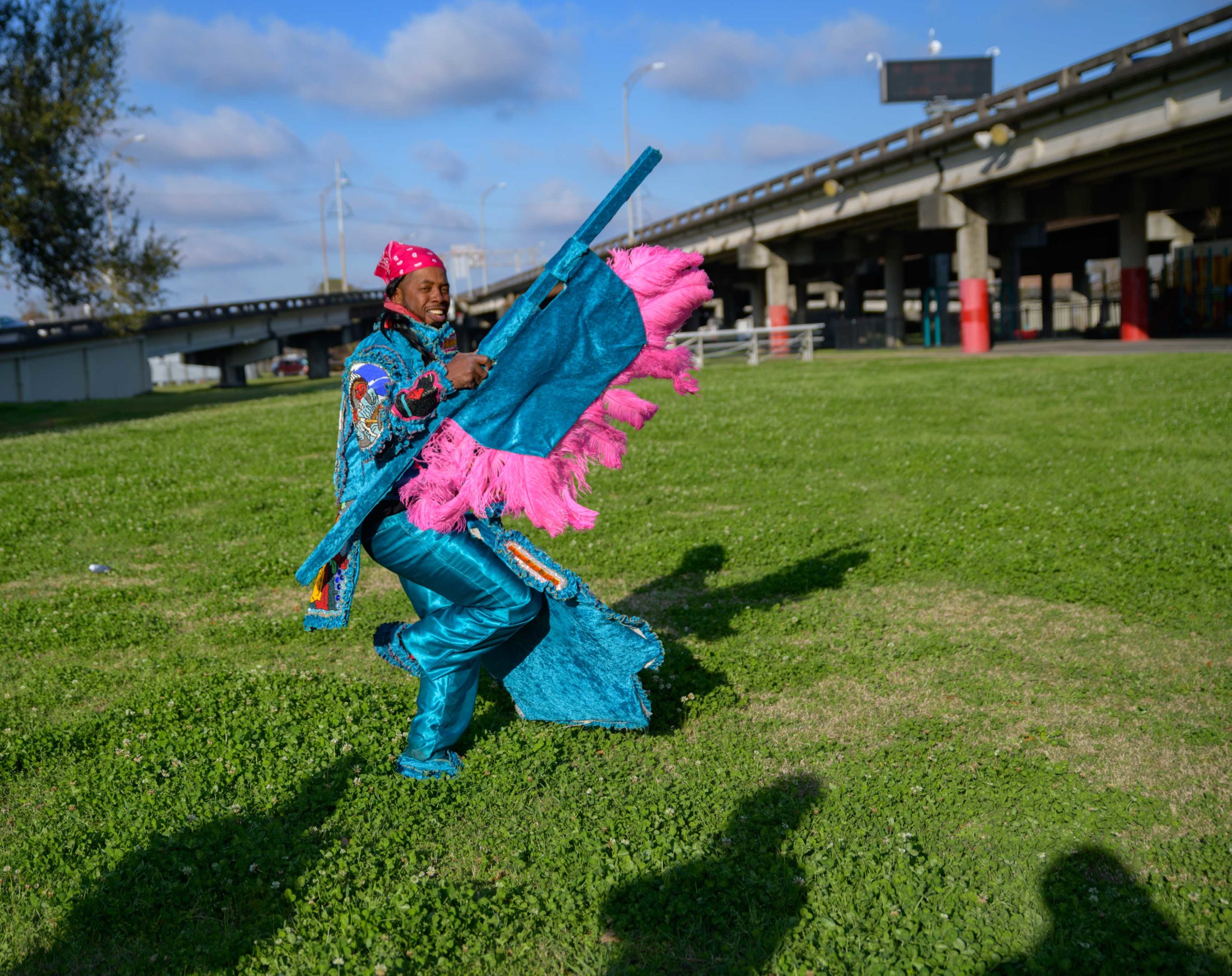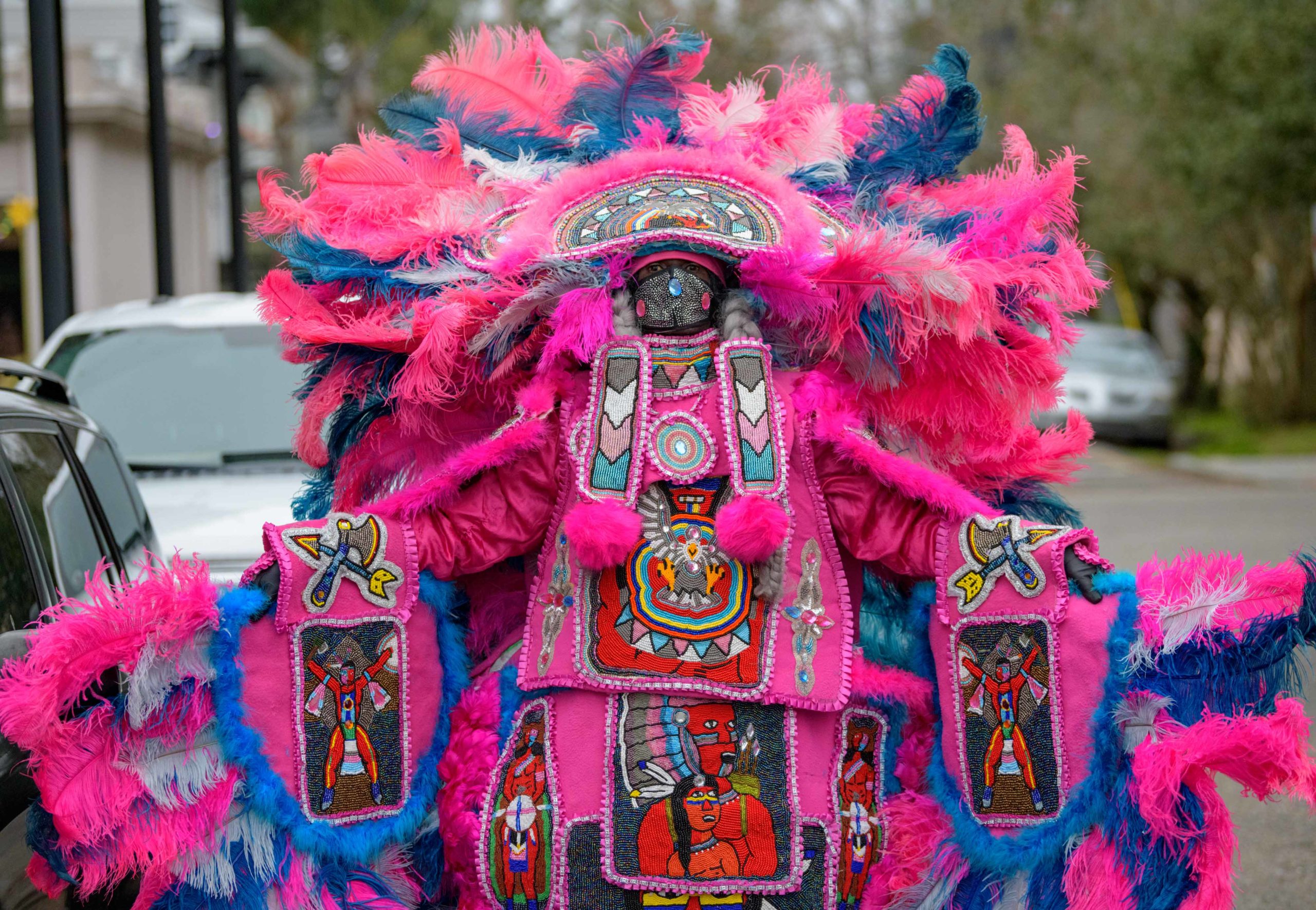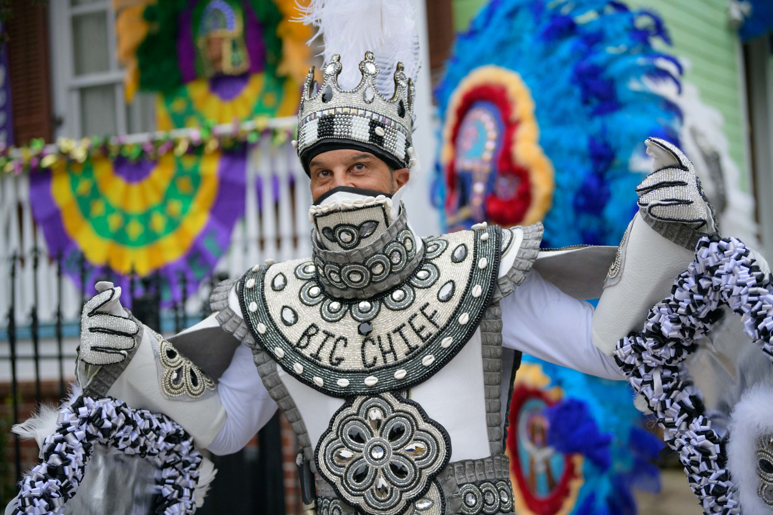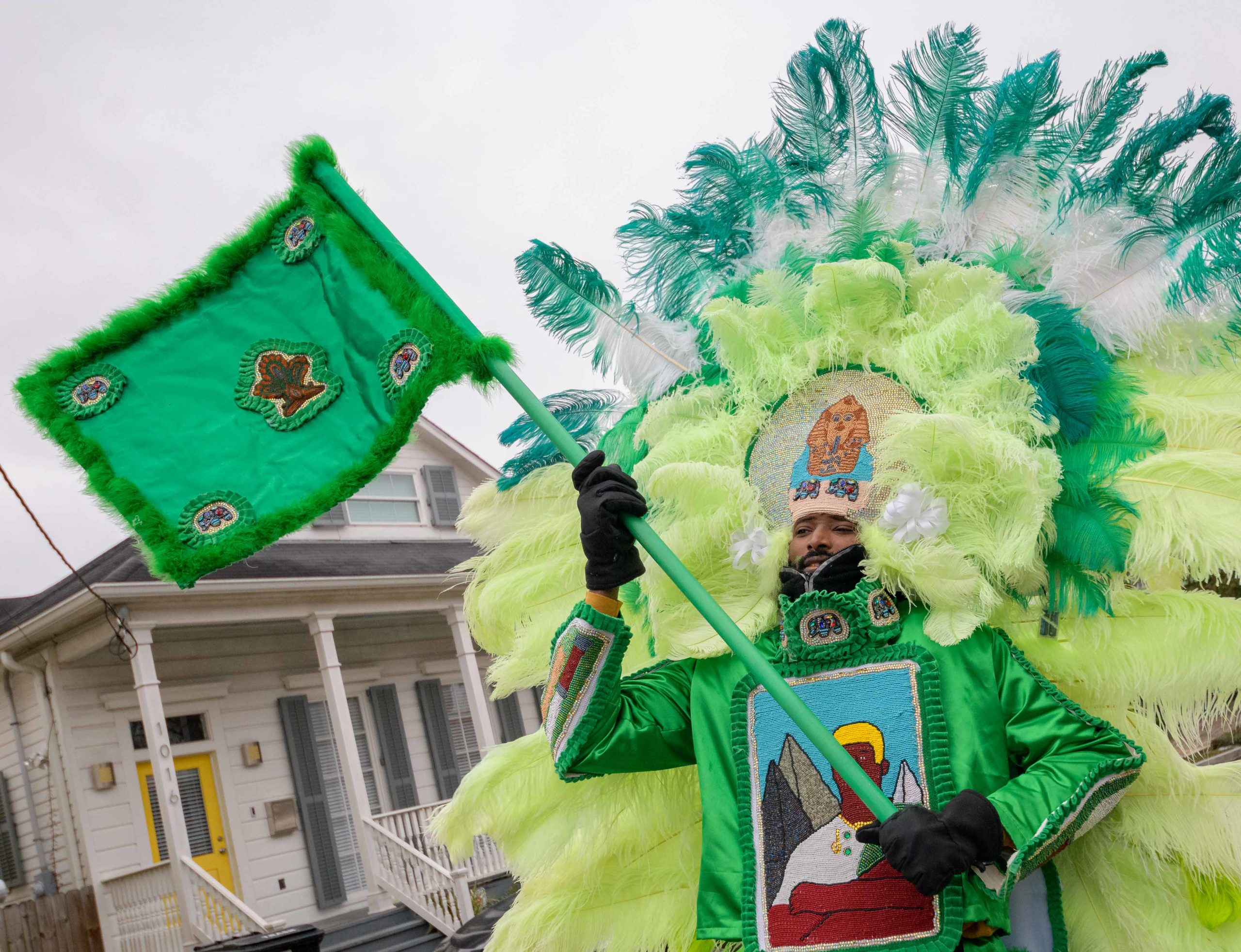 Grammy nominated trumpeter and Spy Boy Eric “Iammusic” Gordon, Jr. displayed a spear that said “MASK UP” as he met up with a small group Mardi Indians near Hunter’s Field in the 7th Ward, a traditional spot for Black Masking Indians to gather on Mardi Gras Feb. 16, 2021. Other Carnival Indians in attendance included Golden Blades Flag Boy Dan Edwards, in blue and pink feathers, Golden Blades Spy Boy K-Nine, Alphonse Feliciana, and in her first time masking, Yellow Pocahontas Big Queen Dianne Honore Destrehan. Destrehan normally comes out as a baby doll on Mardi Gras but with the tutelage of Yellow Pocahontas Big Chief Darryl Montana she sewed her first suit and it was pretty, pretty. She said her fingers will never be the same after they received numerous pin and needle pricks from sewing the suit. Normally the Indians would congregate under the Claiborne bridge in the Lafitte-Treme neighborhood but the mayor fenced off the overpass because of the concern of large crowds gatherings. The first known Carnival Indian gang started around the 1880s with the Creole Wild West led by Chief Becate Batiste, a Creole who was part Choctaw, French, and African-American. Indian suits often depict stories with sewn beads of Native Americans battling the United States cavalry, cowboys, or conquistadors. Other Indian gangs are more influenced by West African and Afro-Caribbean cultures and their suits can have shells, glass, and geometric patterns, while others like the Yellow Pocahontas have three-dimensional beaded structures sometimes representing animals or other sculptures protruding from the suit. Photo by Matthew Hinton