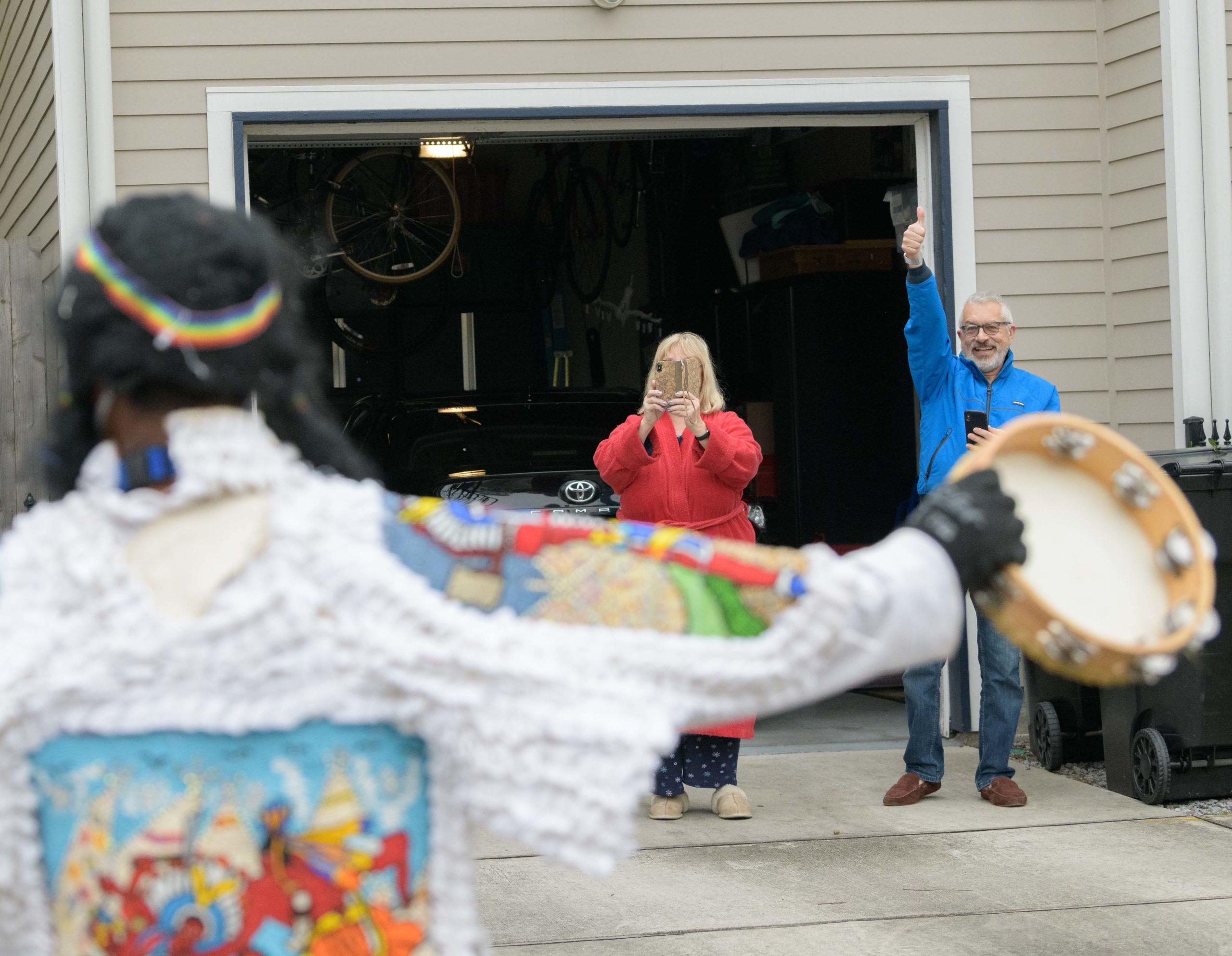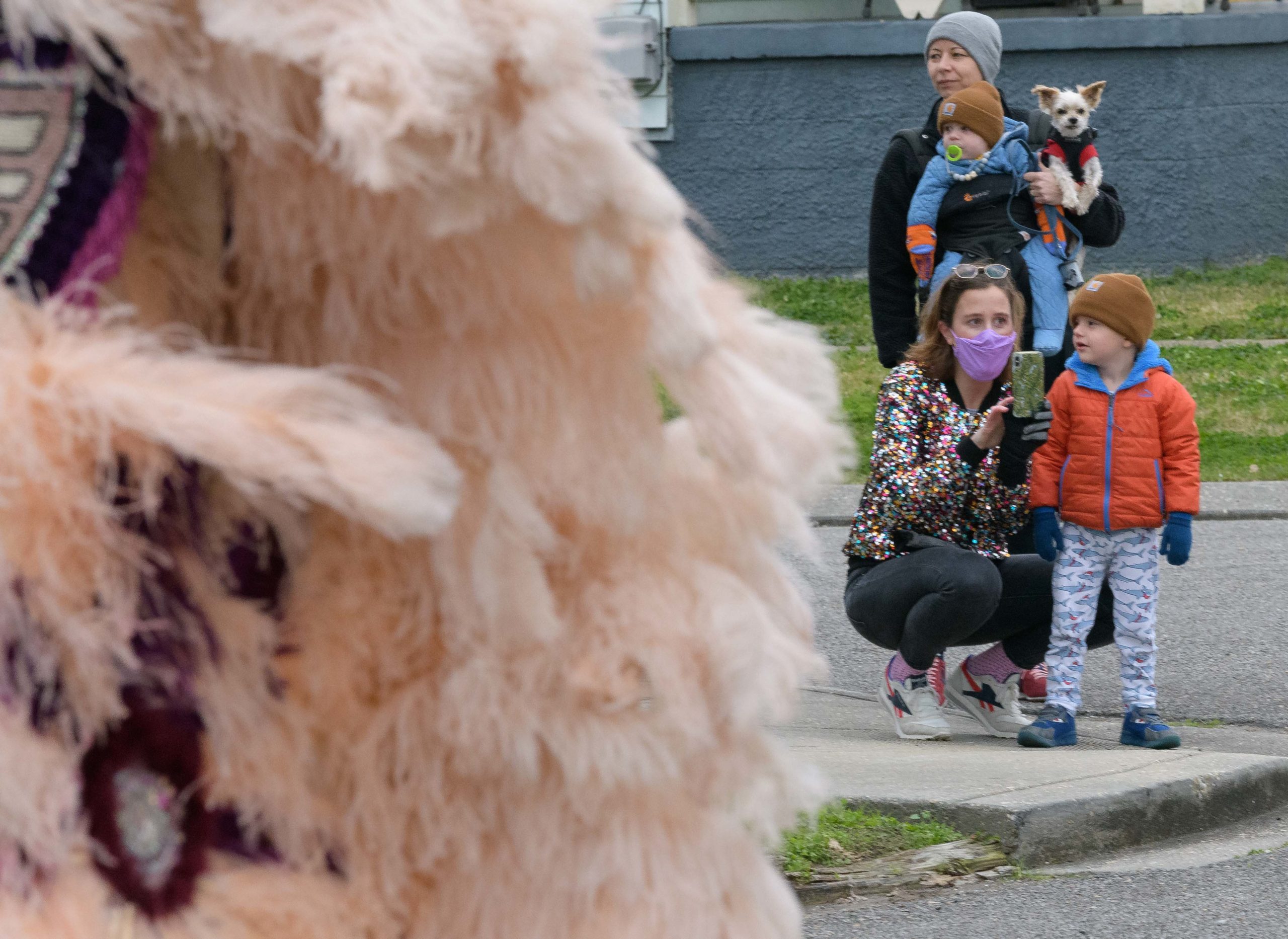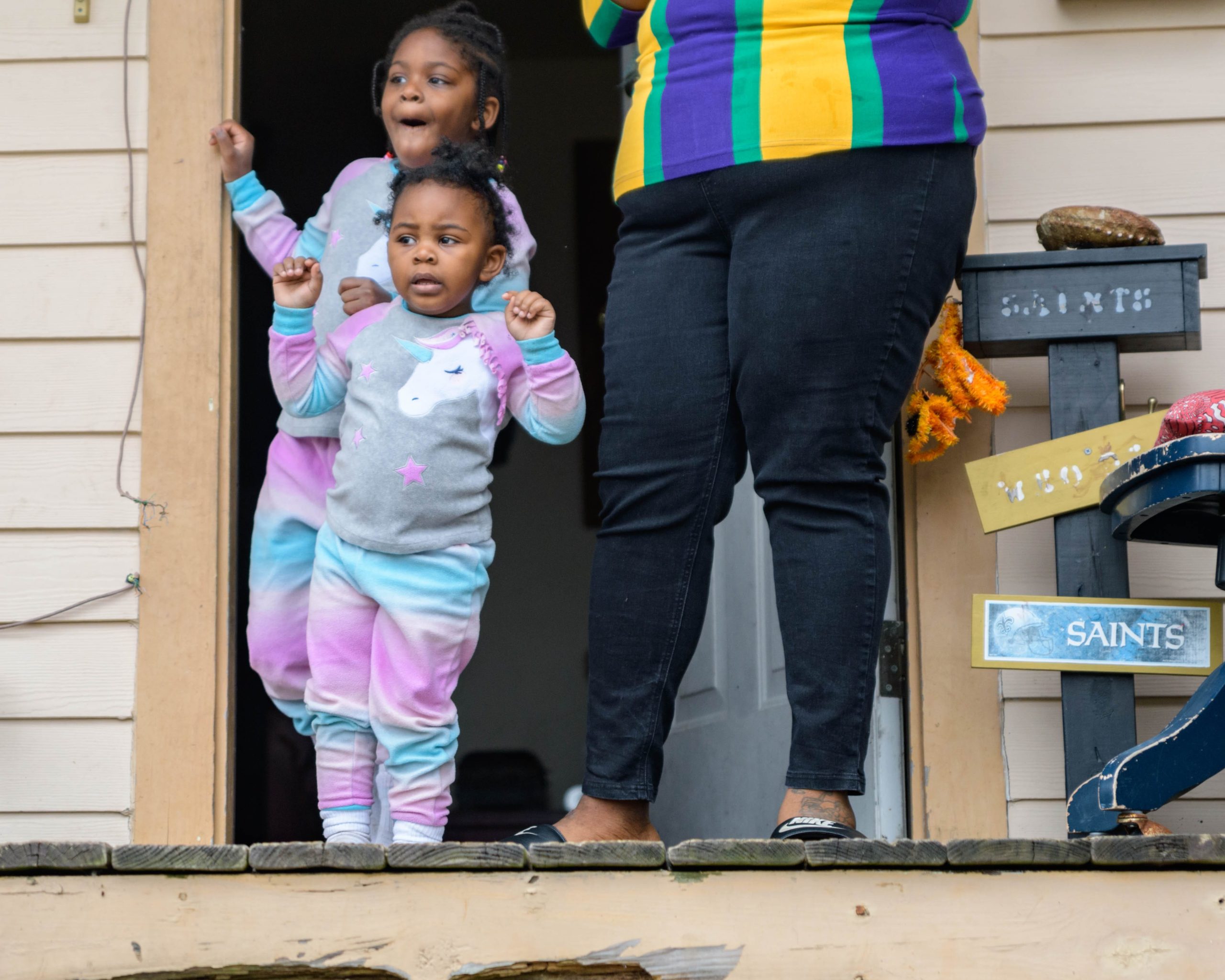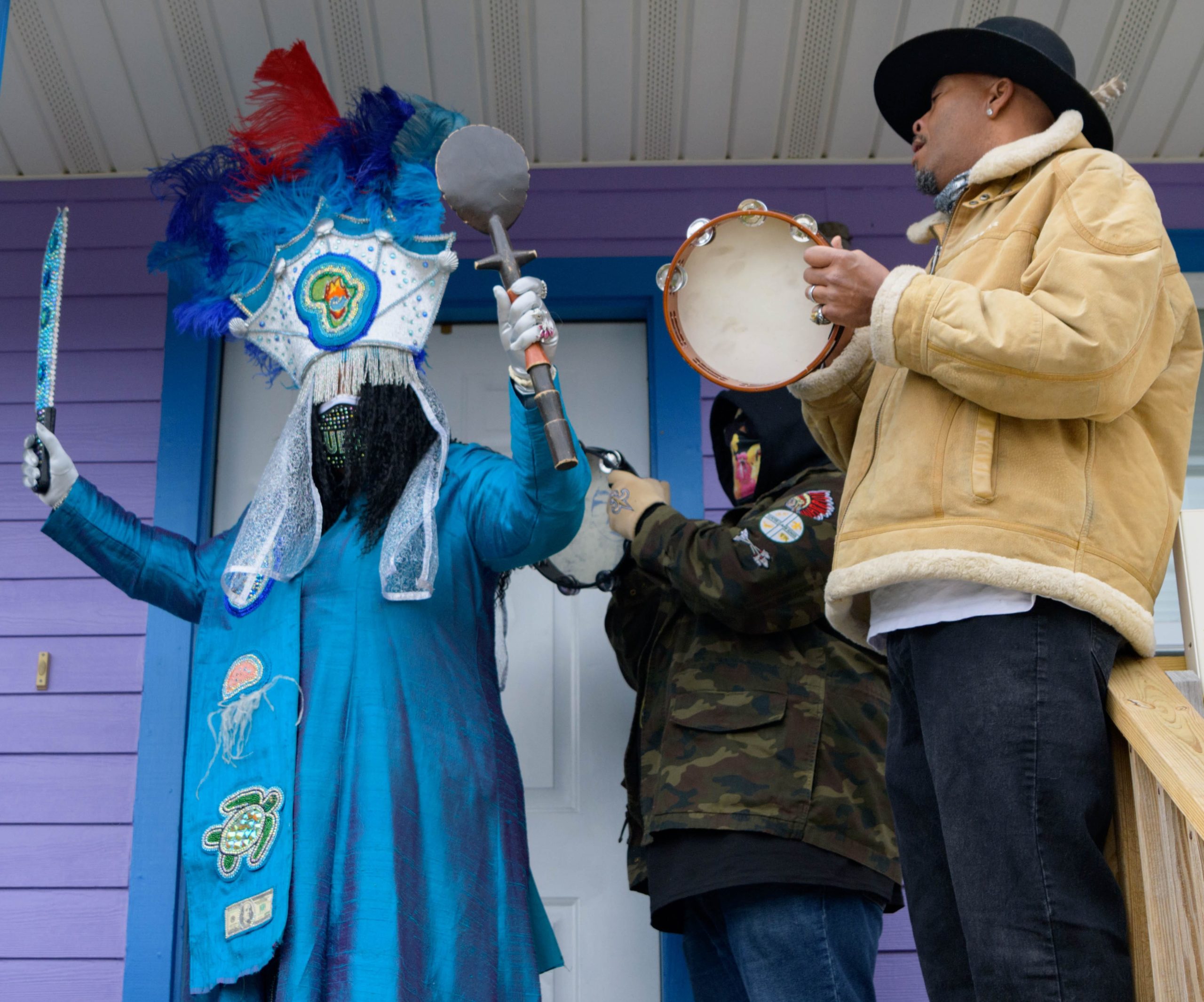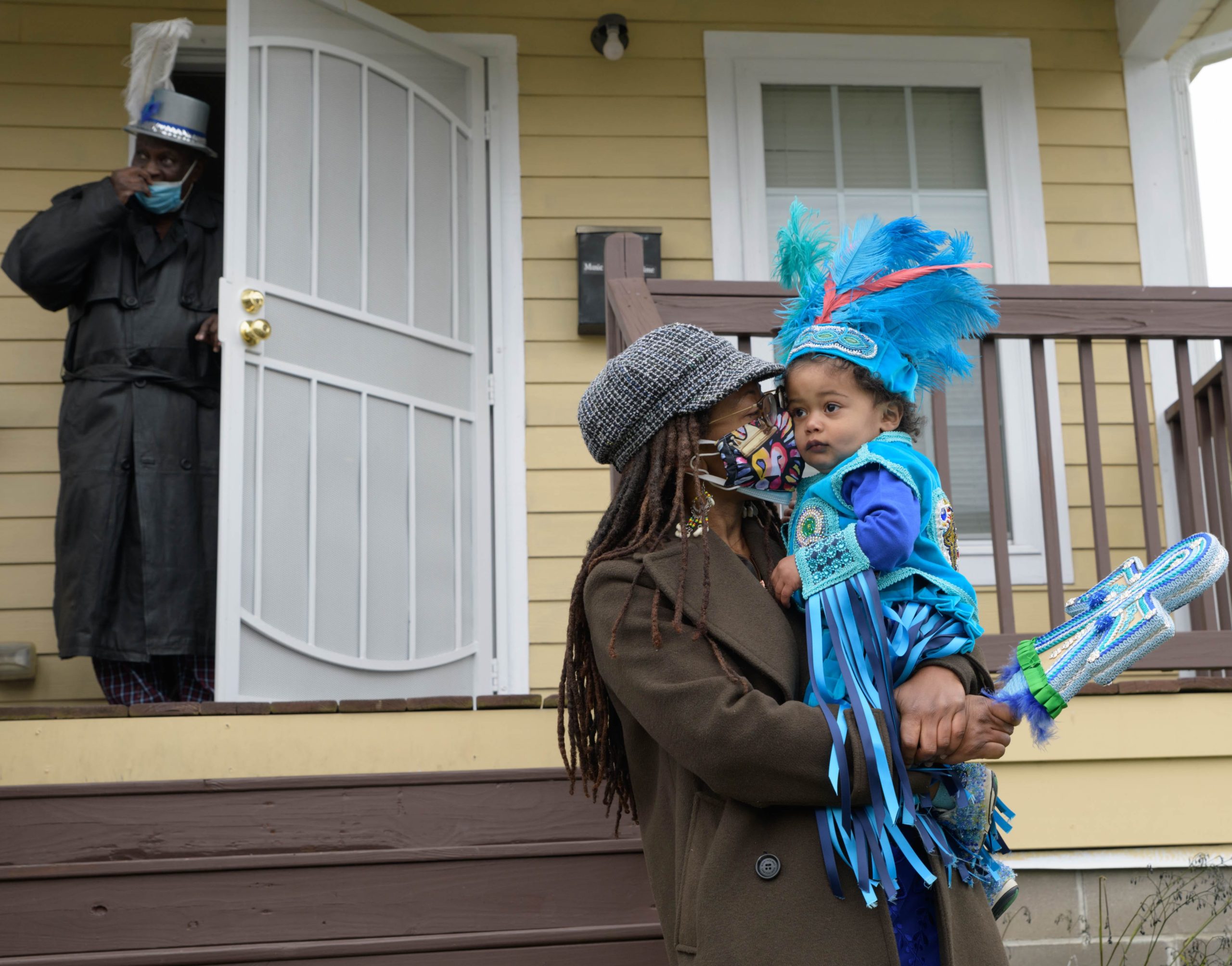 Guardians of the Flame Maroon Queen Cherice Harrison-Nelson led a procession around Musicians Village in the Upper 9th Ward as she honored the late Guardians Consul Chief Joseph Jenkins on Mardi Gras, Feb. 16, 2021. A tiny Guardians of the Flame Mardi Gras Indian Deliam Frazier, 18 months, made his debut with the tribe. After leaving his former home the Guardians traveled to other neighbors including Al Carnival Time Johnson, who waved and sang from a safe distance from his home in the Upper 9th Ward. Harrison-Nelsons father was Big Chief Donald Harrison Sr. of the Guardians of the Flame and a former Big Chief for the Creole Wild West Indians gang. This group is believed to be one of the first Mardi Gras Indian gangs founded in the 1880s by Becate Batiste, a Seventh Ward Creole of African-American, French, and Choctaw heritage. Maroon Queen Cherice honors Maroons who escaped slavery plantations in Southeast Louisiana and mingled with local Native American tribes. Her machete is a symbol for the maroons who used it to cut through the brush and for protection. Photo by Matthew Hinton