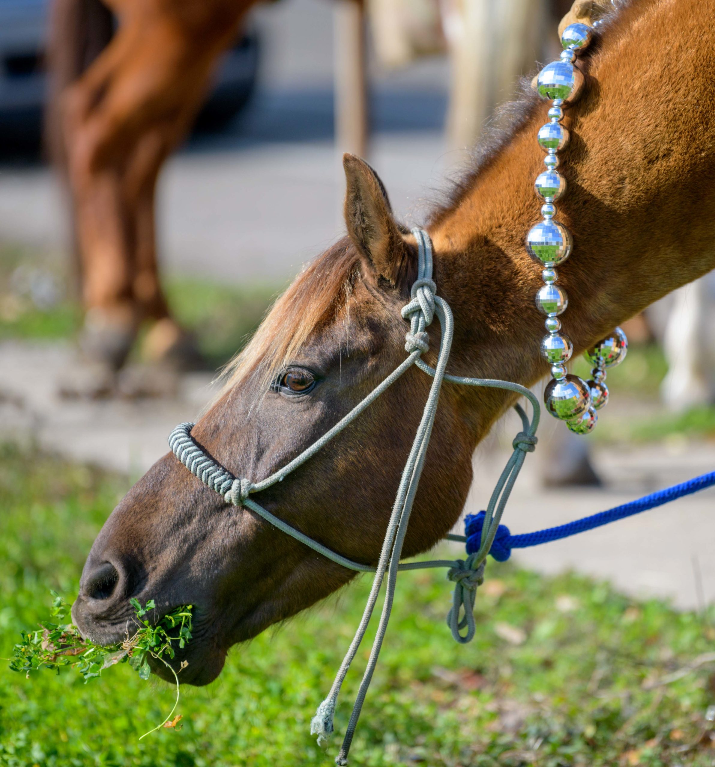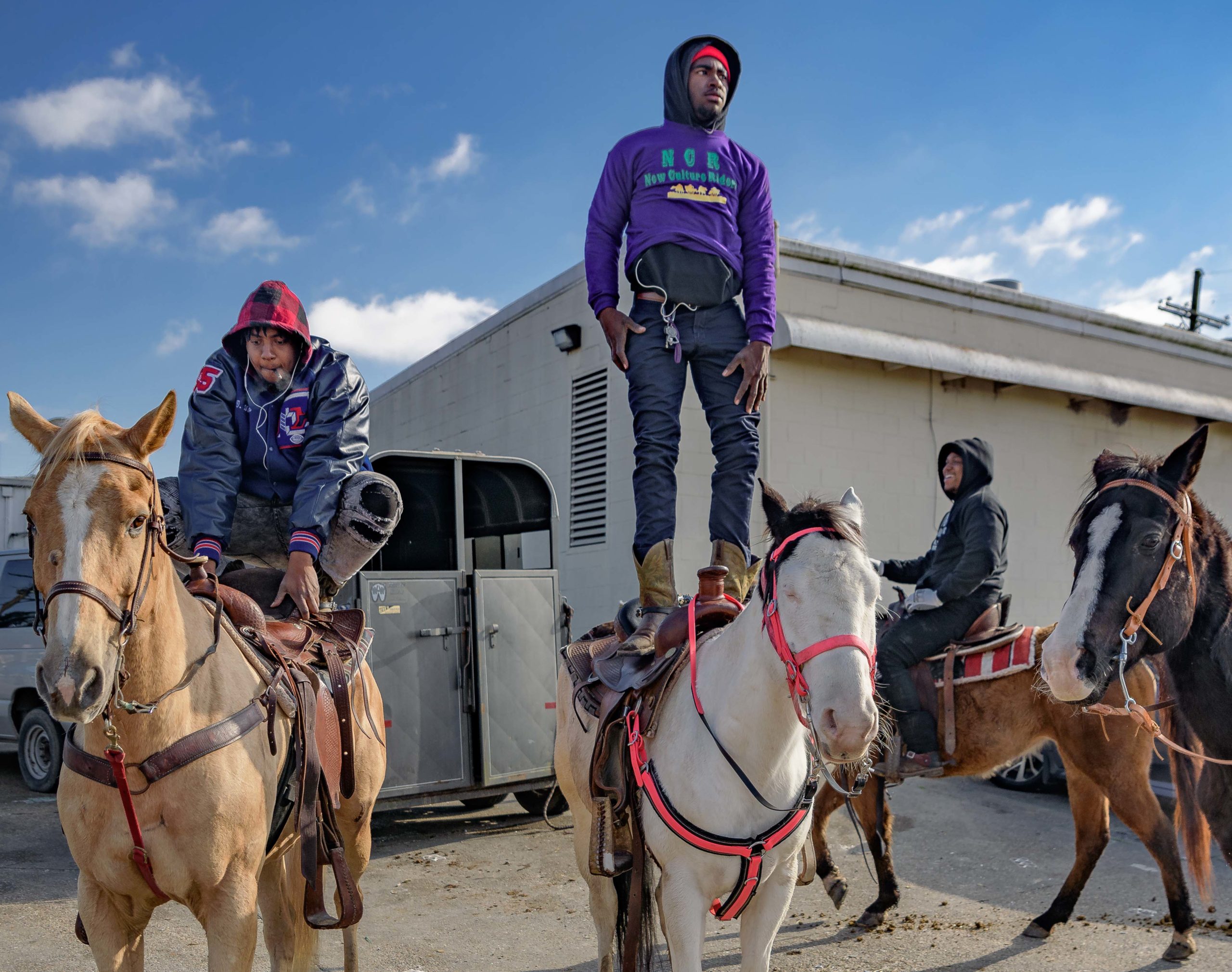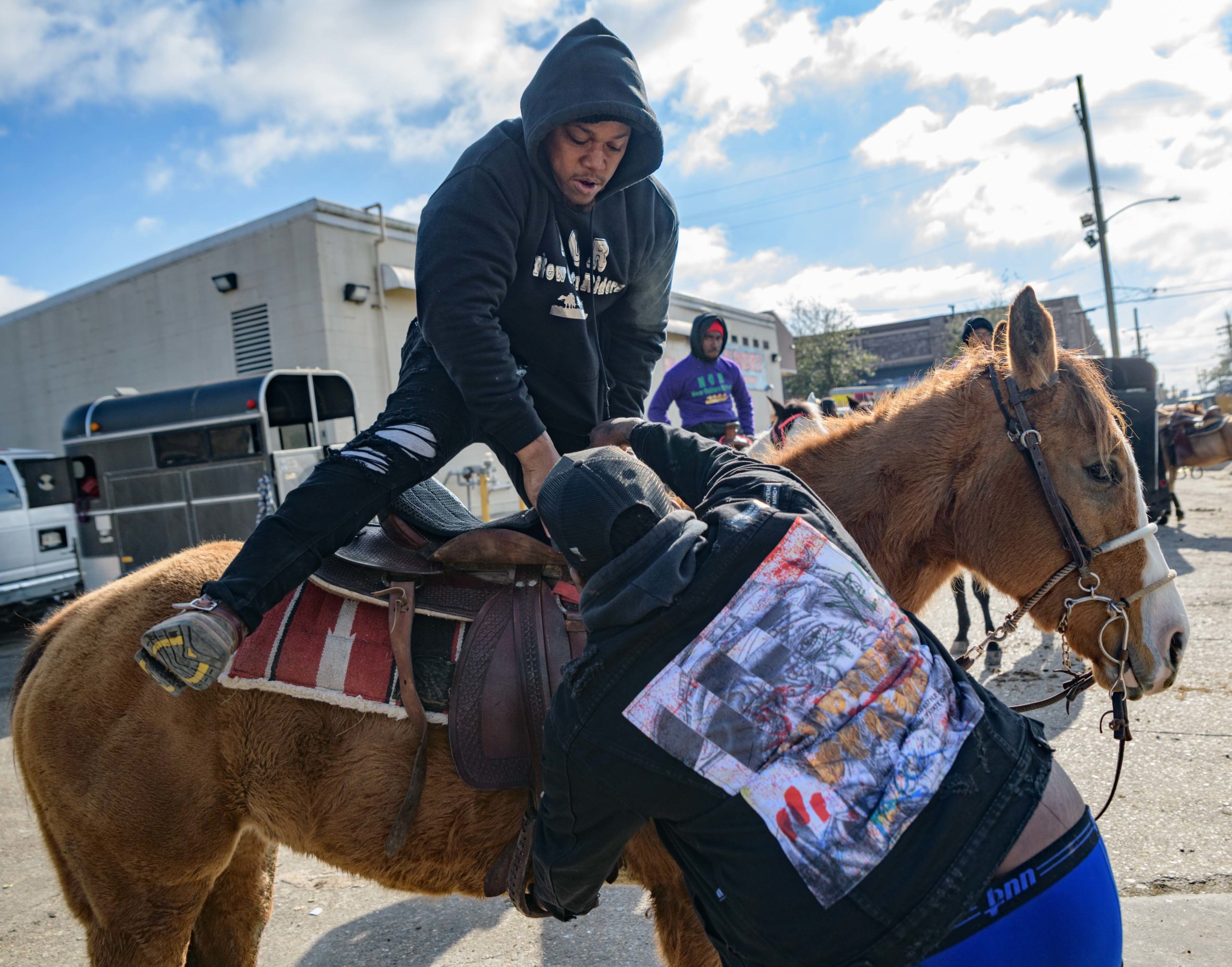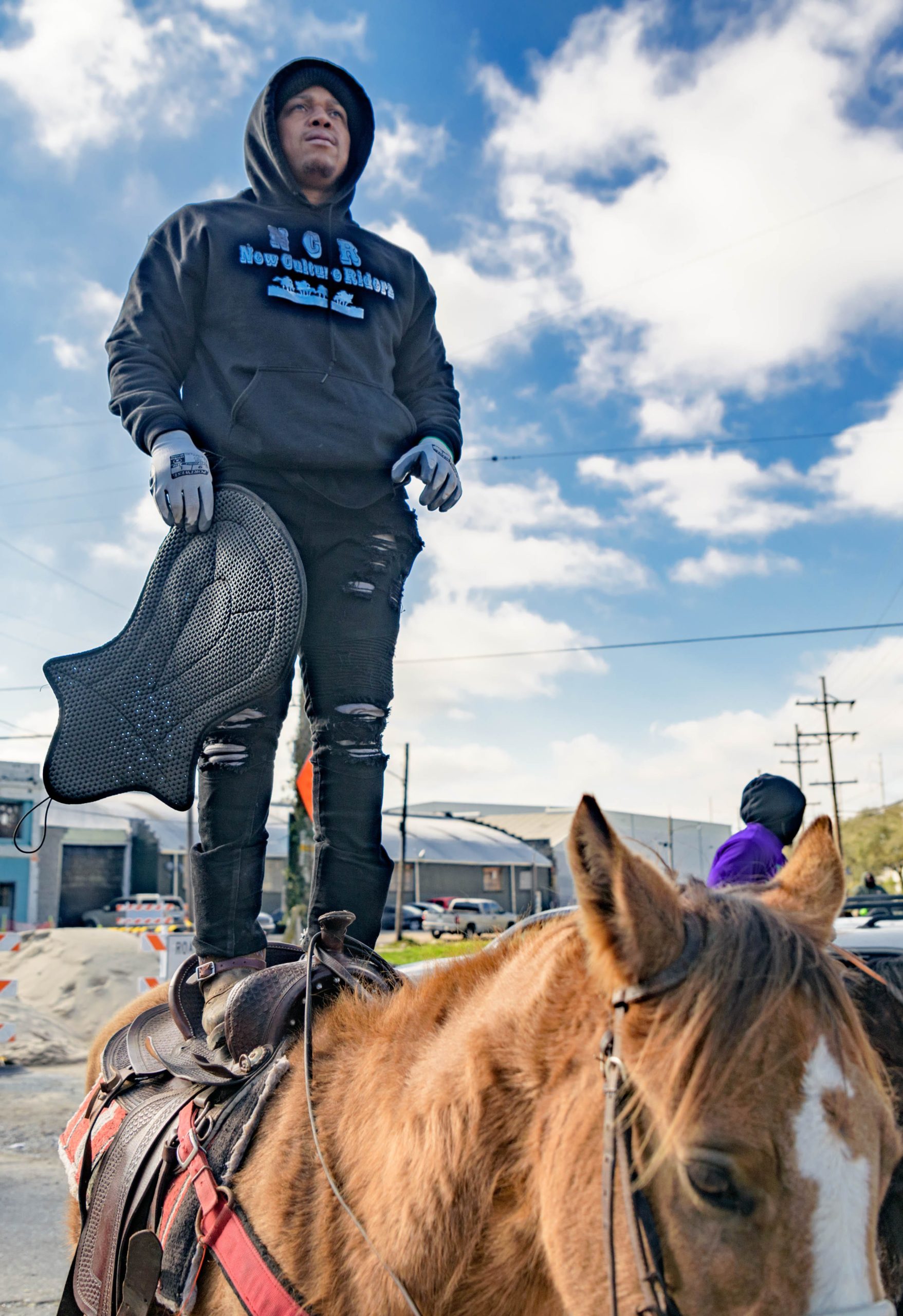 Tyree Encalade with the New Culture Riderz stands on his horse, Lola, in the Central City neighborhood before the group including members of the Crescent City Cowboys rode through the streets on Mardi Gras, Feb. 16, 2021. Photo by Matthew Hinton
