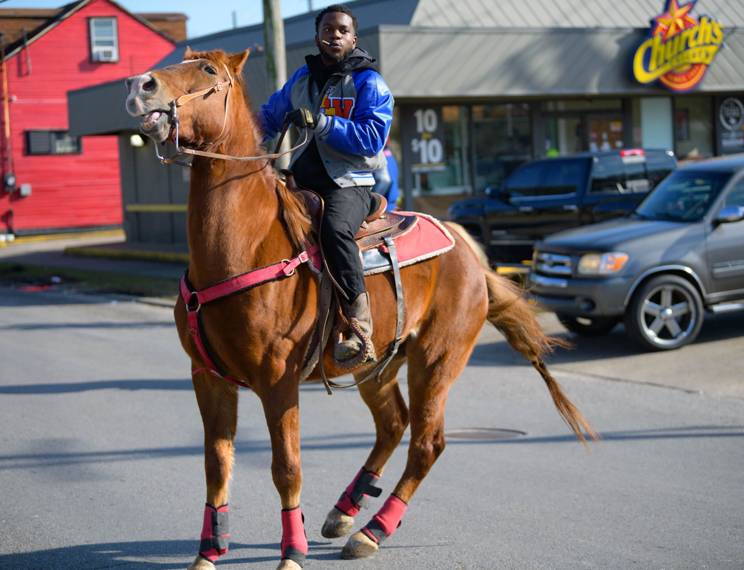 Tyree Encalade with the New Culture Riderz stands on his horse, Lola, in the Central City neighborhood before the group including members of the Crescent City Cowboys rode through the streets on Mardi Gras, Feb. 16, 2021.