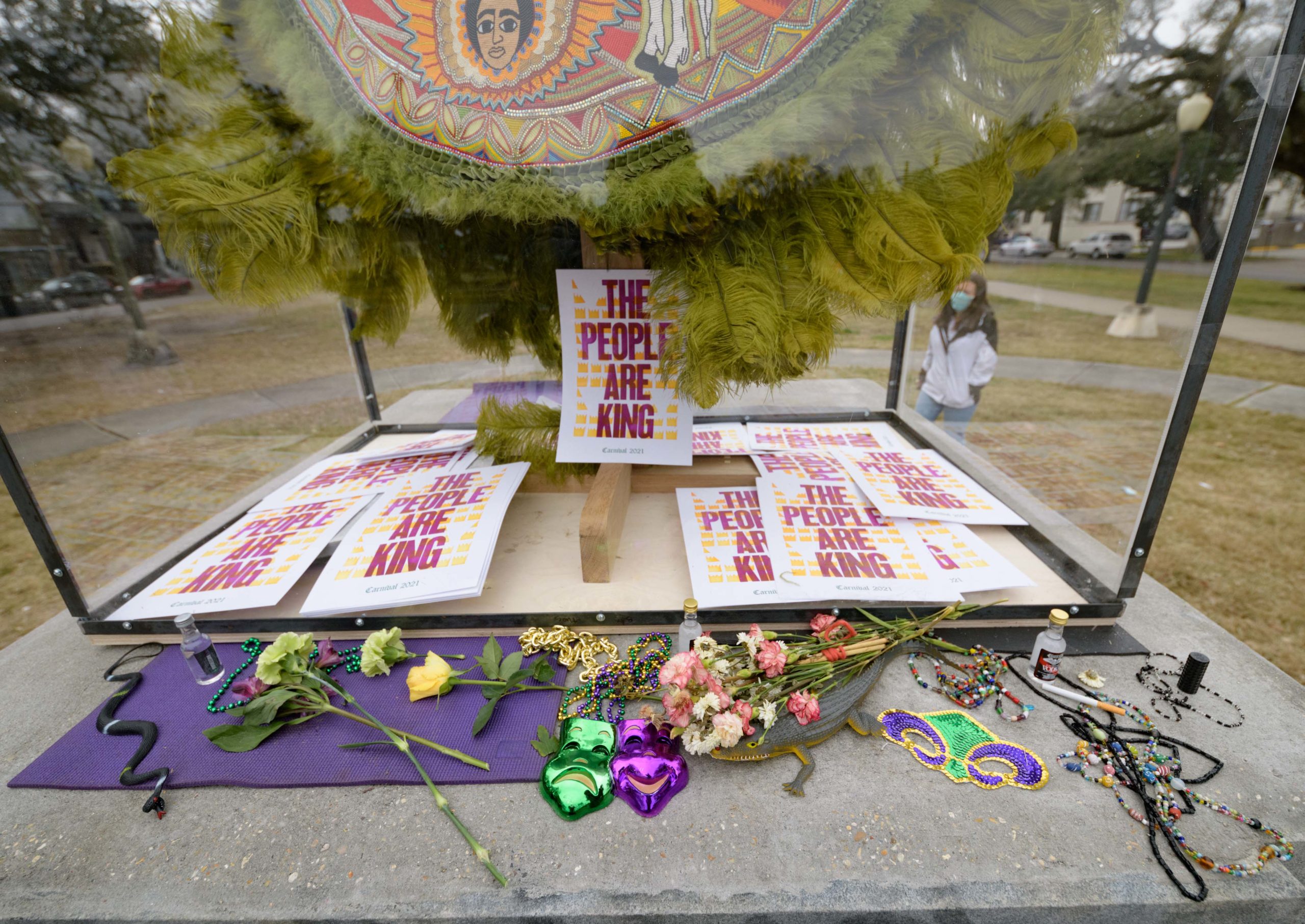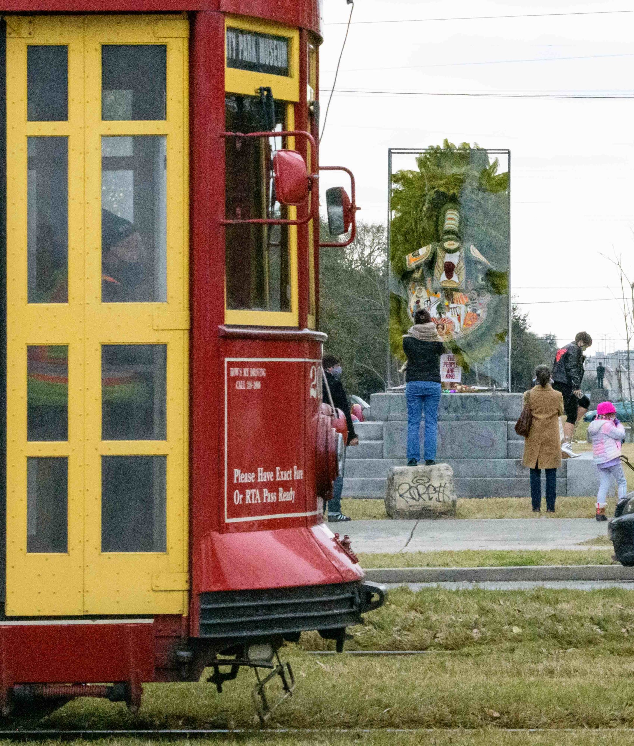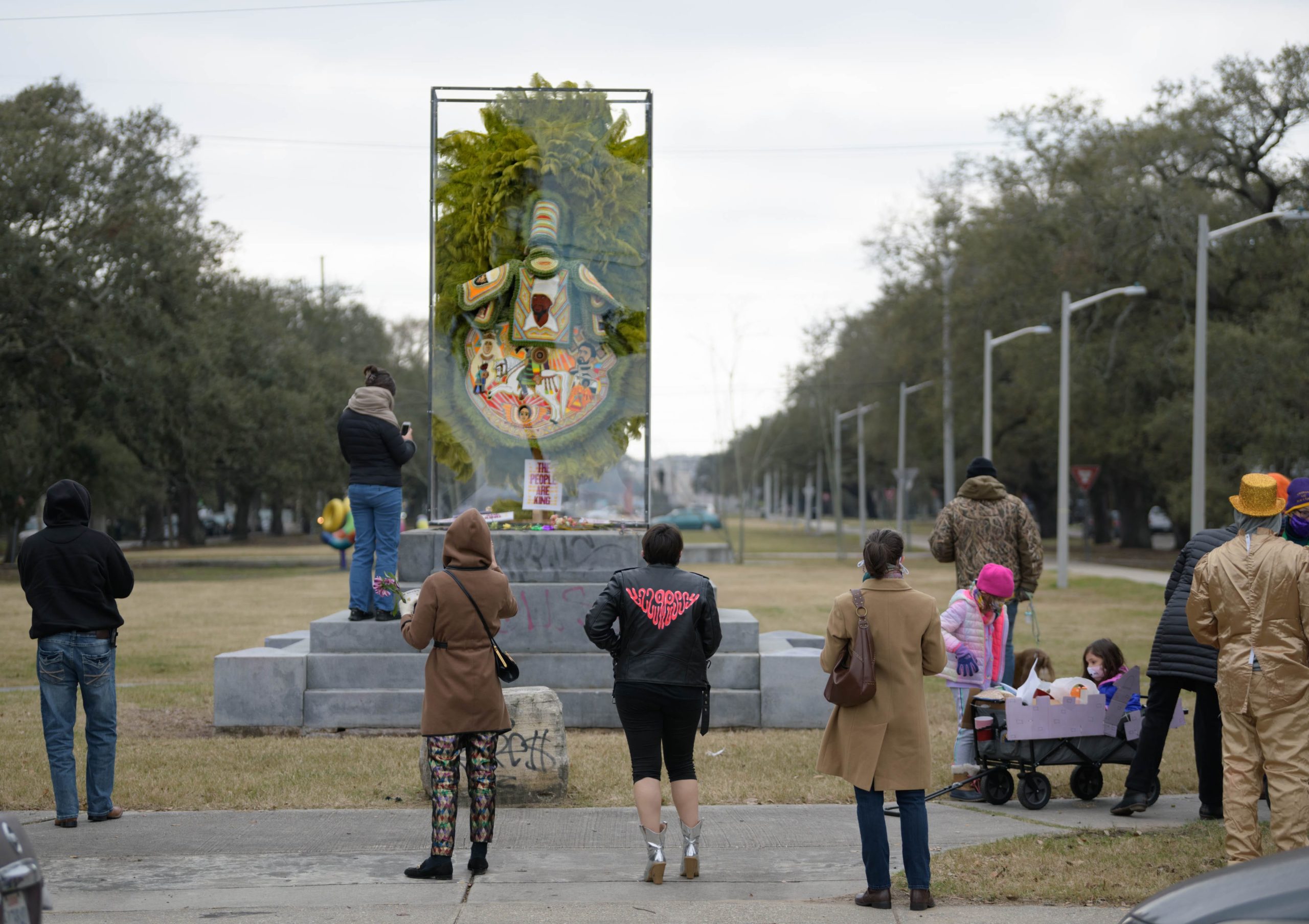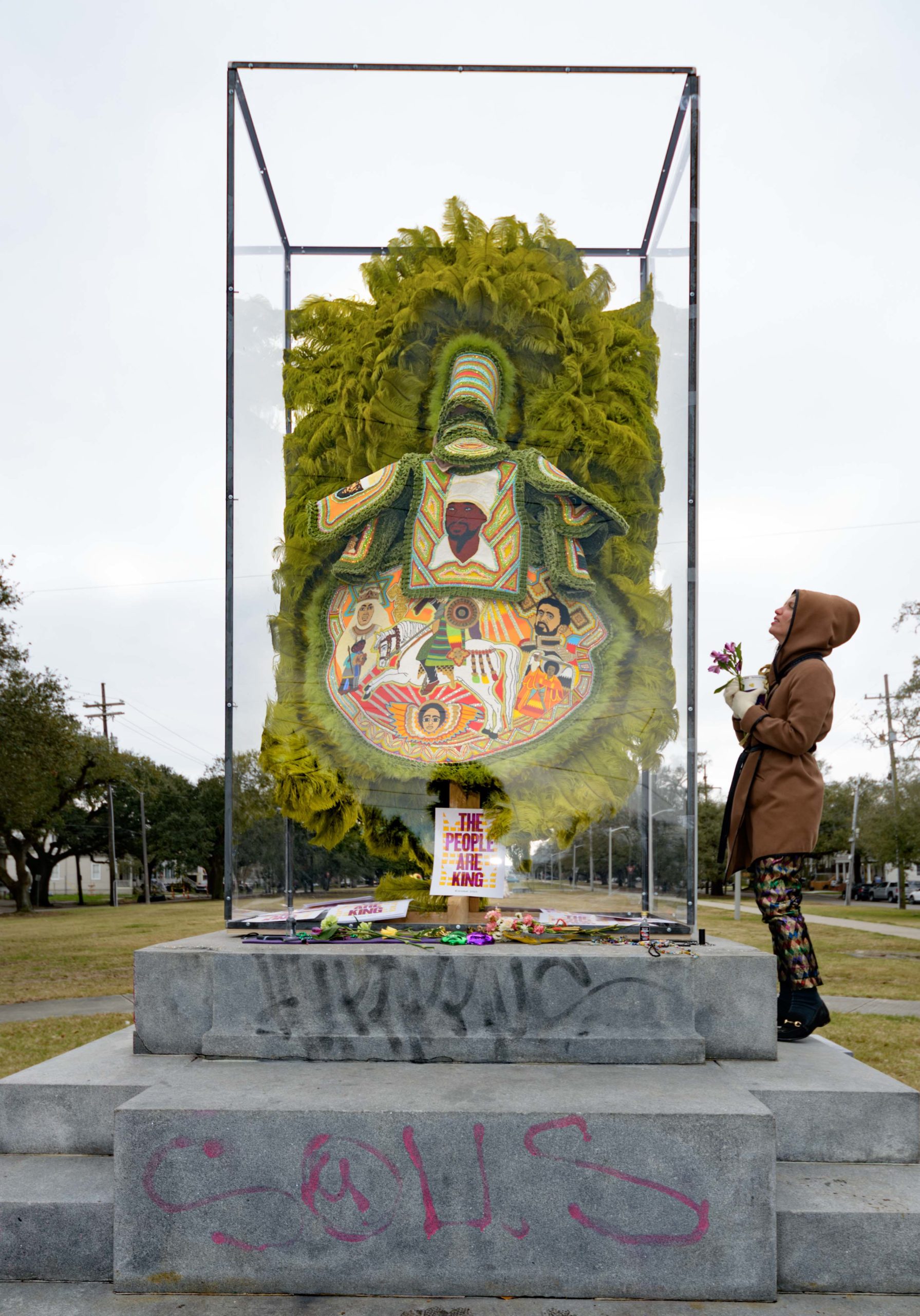 On Mardi Gras Feb. 16, 2021. Big Chief Demond Melancon (@qadamawi) installed one of his Mardi Gras Indian suits on a pedestal that formerly held a statue of the traitor and leader of the short-lived Confederacy, Jefferson Davis. The Davis statue was removed in 2017 having been erected not after the Civil War but in the early 20th Century during the racist Jim Crow era that segregated the South and disenfranchised black voters. The Davis statue was located on Jefferson Davis Parkway in Mid-City but has been renamed Norman C Francis Parkway in honor of Dr. Francis who is the former president of Xavier University, a historical black Catholic University, located a mile from this pedestal. Photo by Matthew Hinton