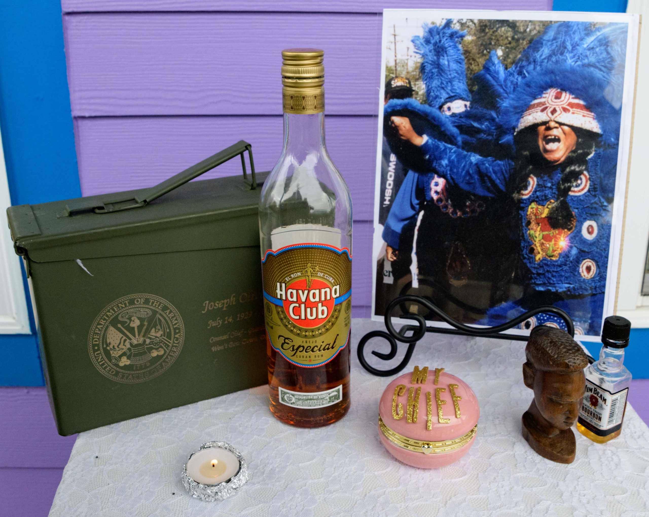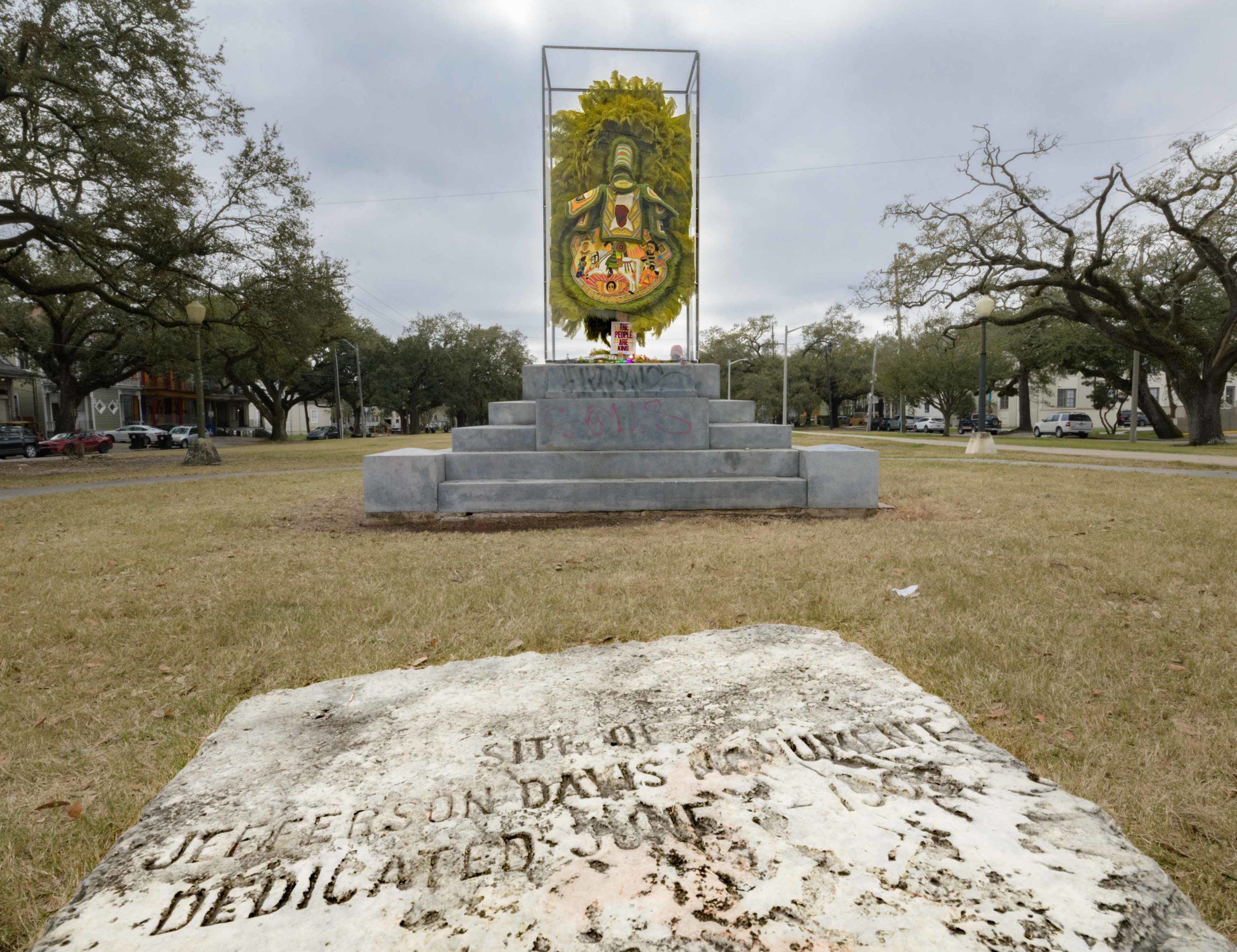 On Mardi Gras Feb. 16, 2021. Big Chief Demond Melancon (@qadamawi) installed one of his Mardi Gras Indian suits on a pedestal that formerly held a statue of the traitor and leader of the short-lived Confederacy, Jefferson Davis. The Davis statue was removed in 2017 having been erected not after the Civil War but in the early 20th Century during the racist Jim Crow era that segregated the South and disenfranchised black voters. The Davis statue was located on Jefferson Davis Parkway in Mid-City but has been renamed Norman C Francis Parkway in honor of Dr. Francis who is the former president of Xavier University, a historical black Catholic University, located a mile from this pedestal.