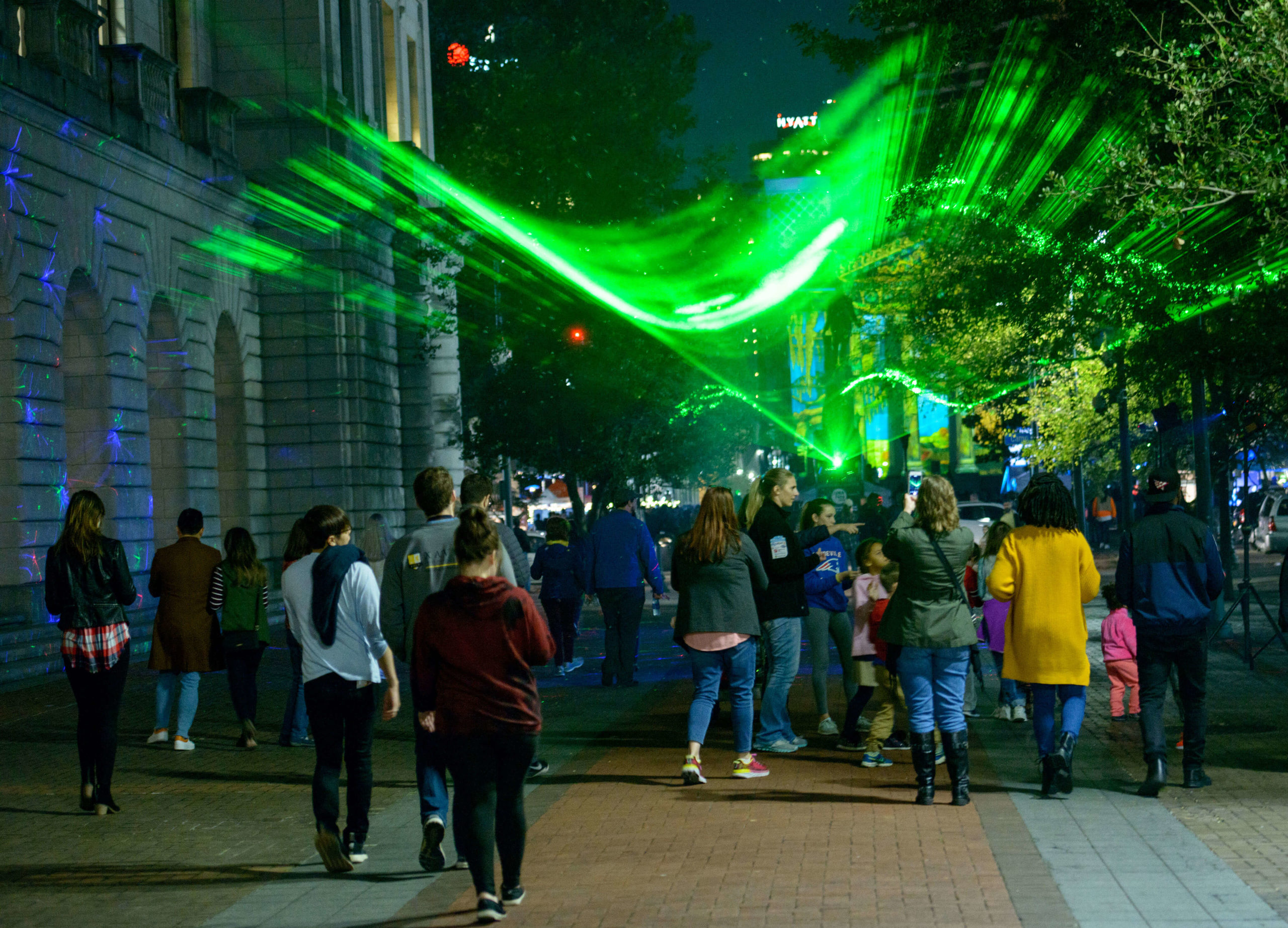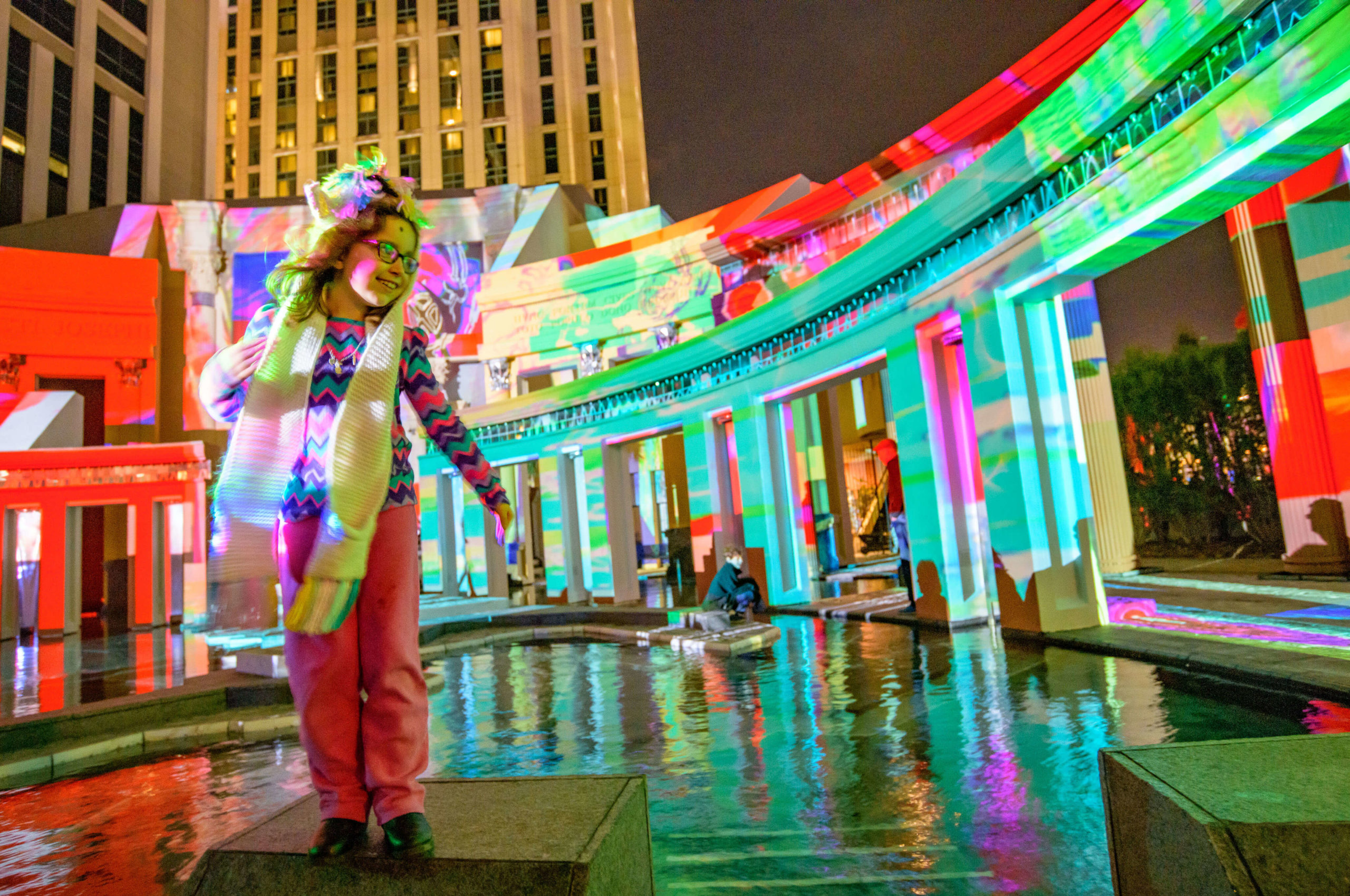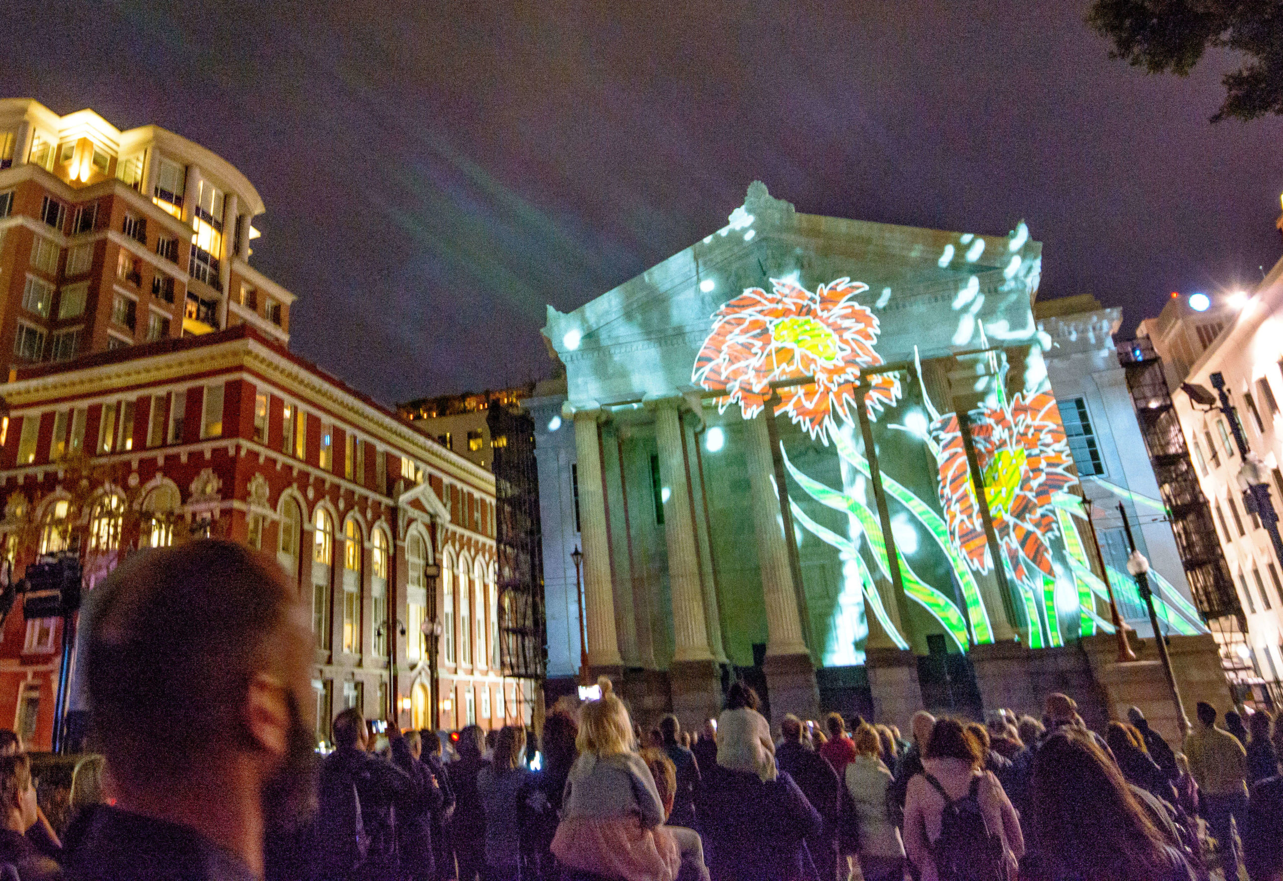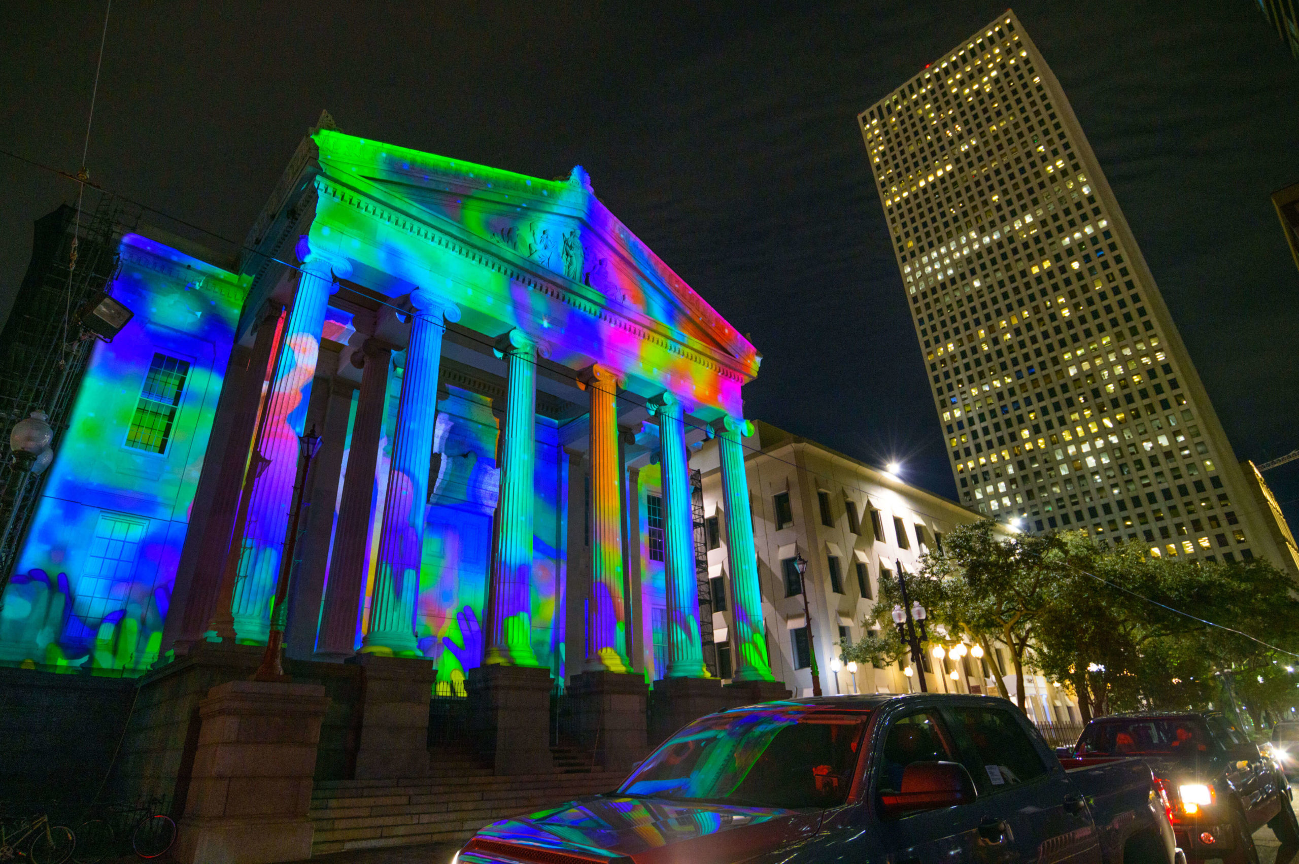 This year’s tricentennial celebration went above and beyond, with two different projections on Gallier Hall and more lights a short walk away, at the Piazza d’Italia. More than 50,000 people flock downtown to watch the Arts Council transform the familiar public space into a giant community art project since its inception five years ago.
