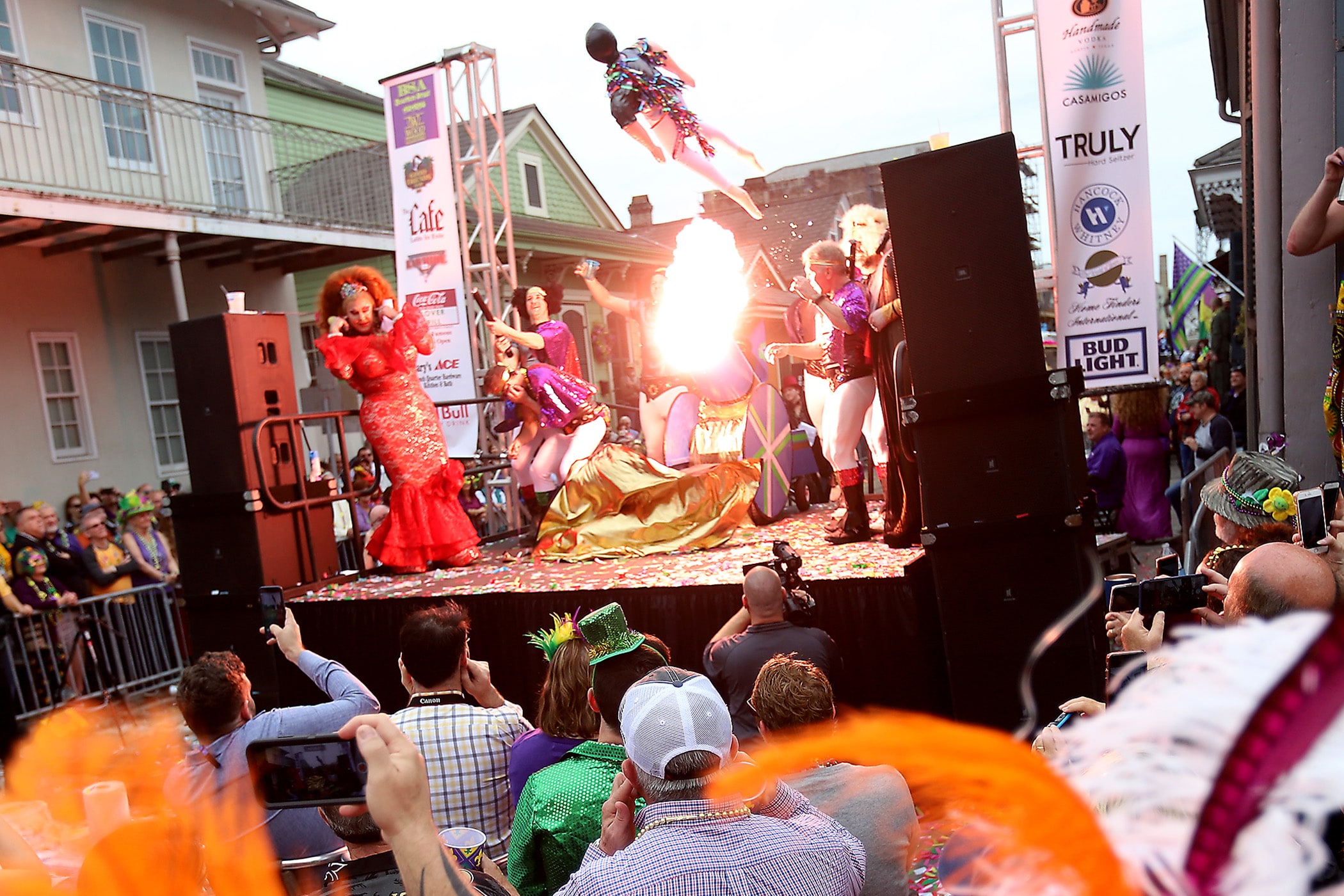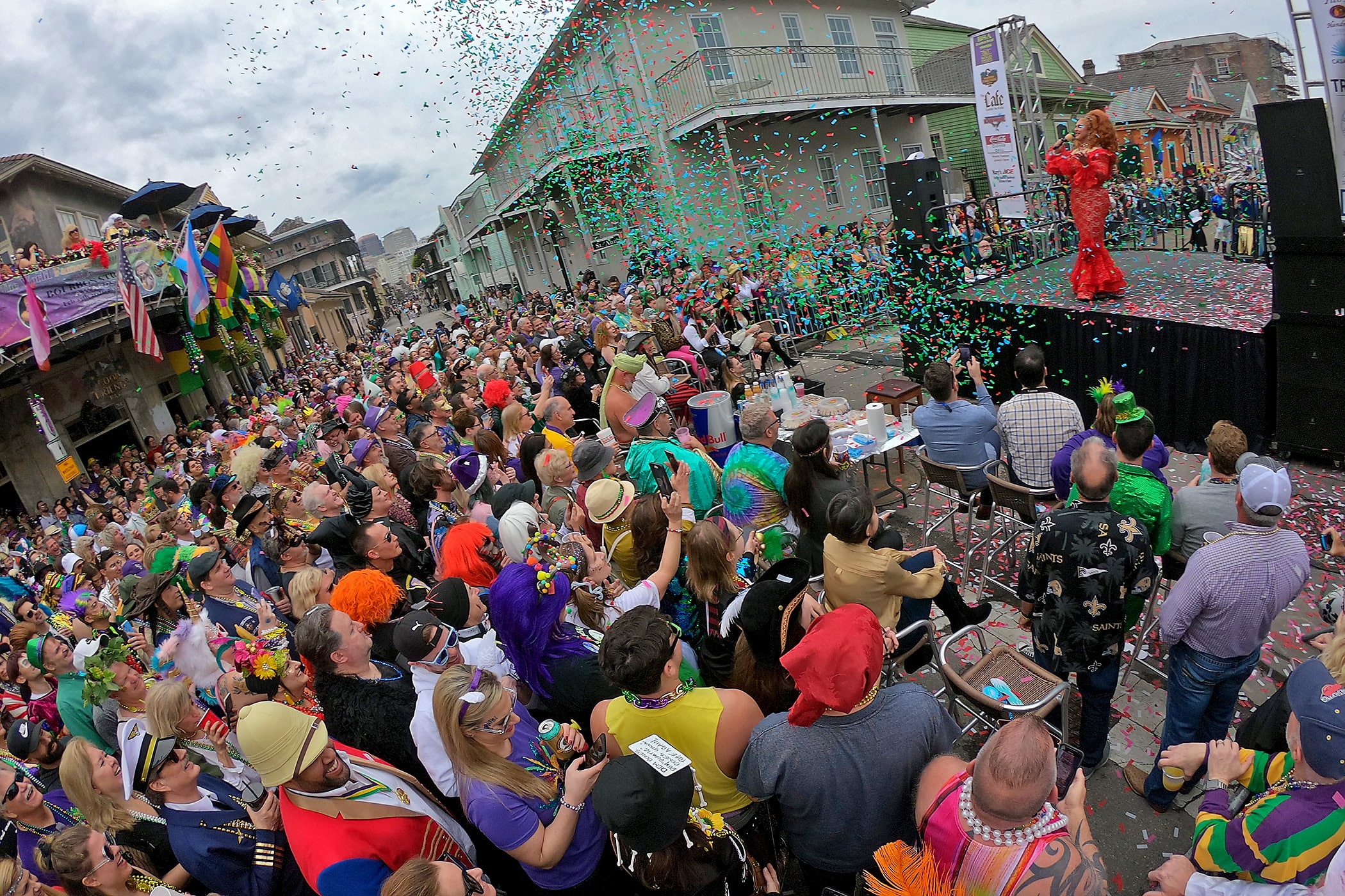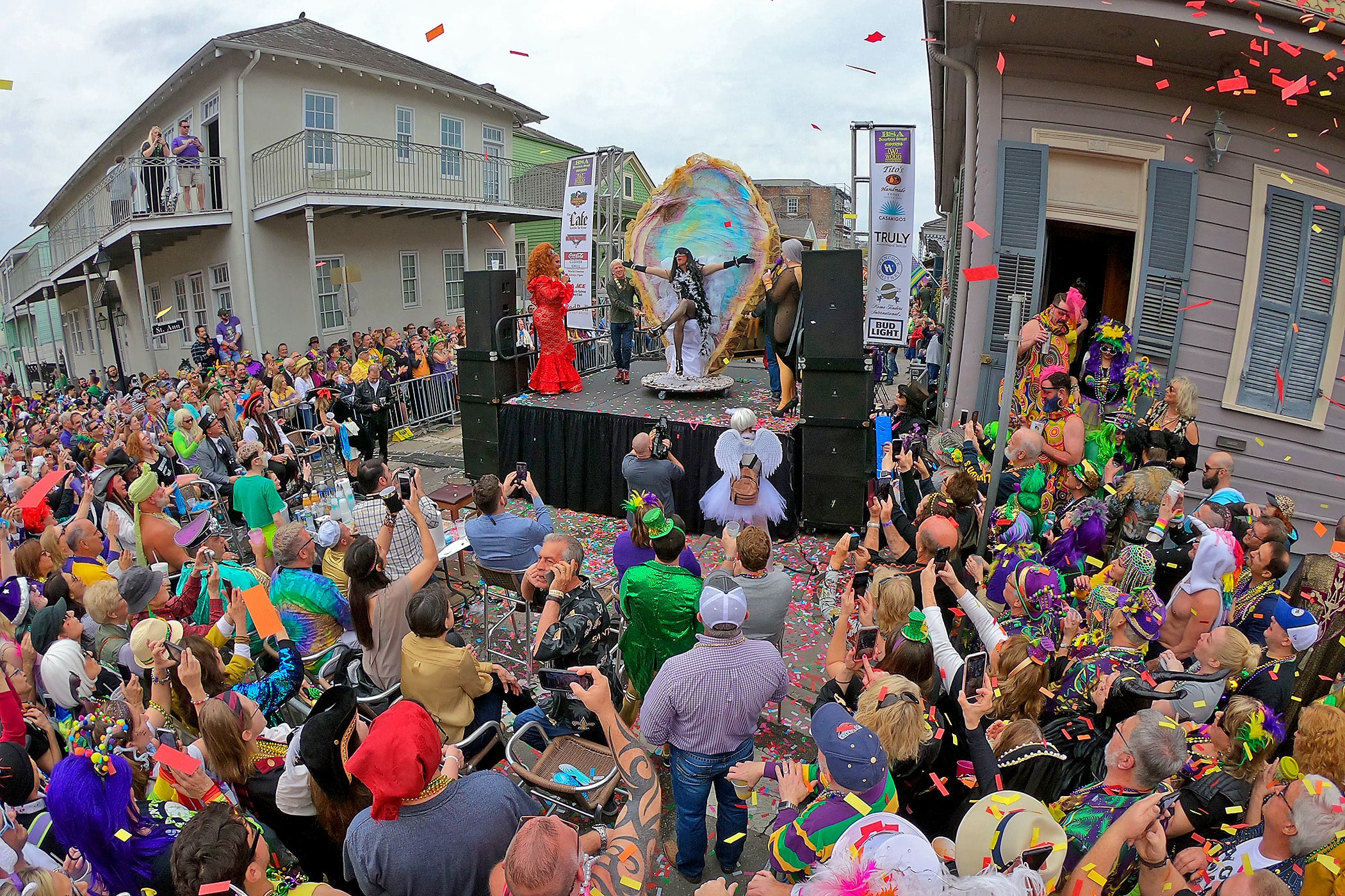Hundreds of people crowd the stage and fill the balconies as costumed competitors compete for prizes in the categories of Drag, Leather, Group, Individual, and Best Overall during the 56th annual Bourbon Street Awards at Dauphine and St. Ann Streets hosted by the Good Friends Bar and the Queens Head Pub on Mardi Gras Day, 2020. (Photo by Michael DeMocker)