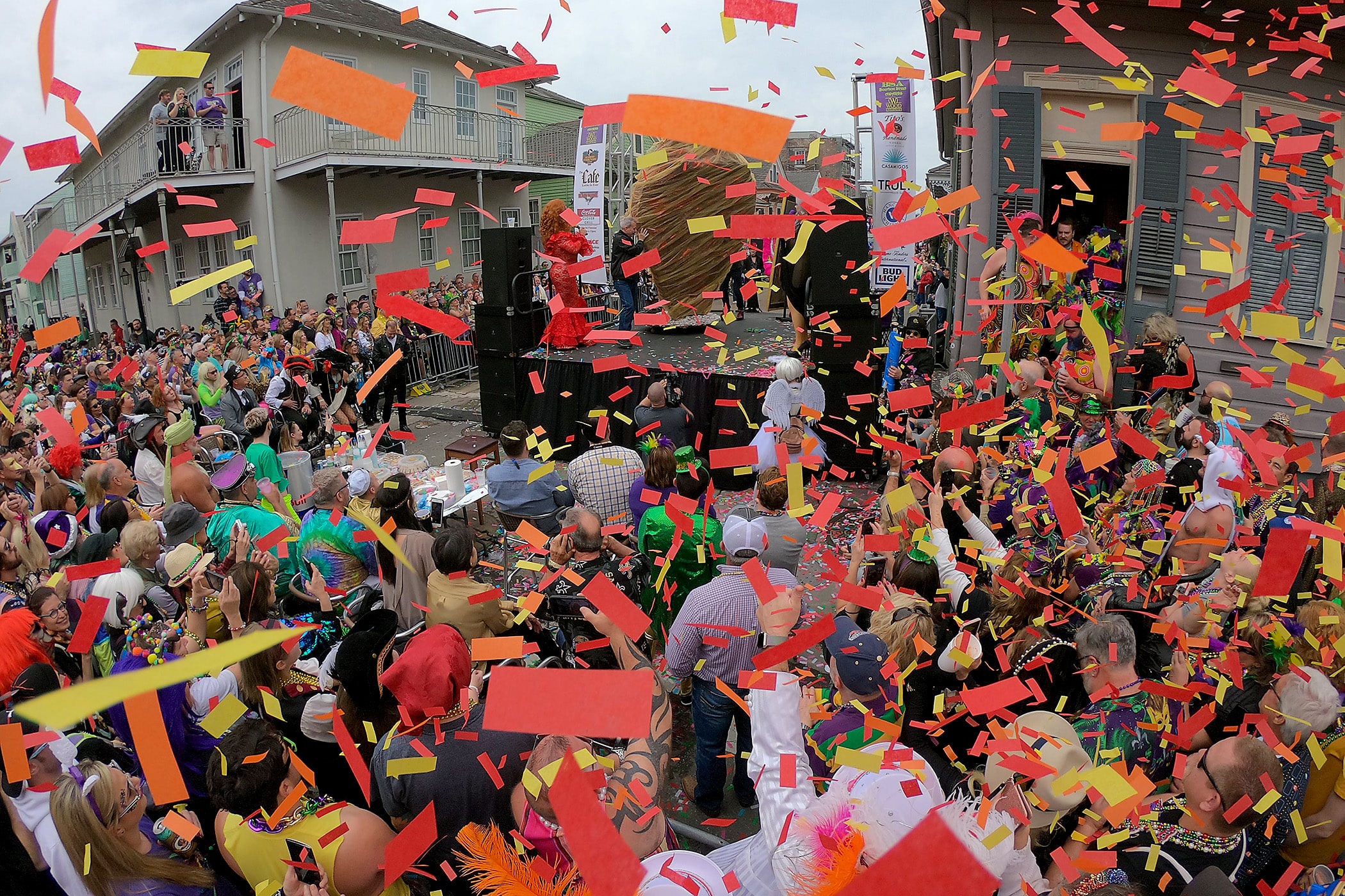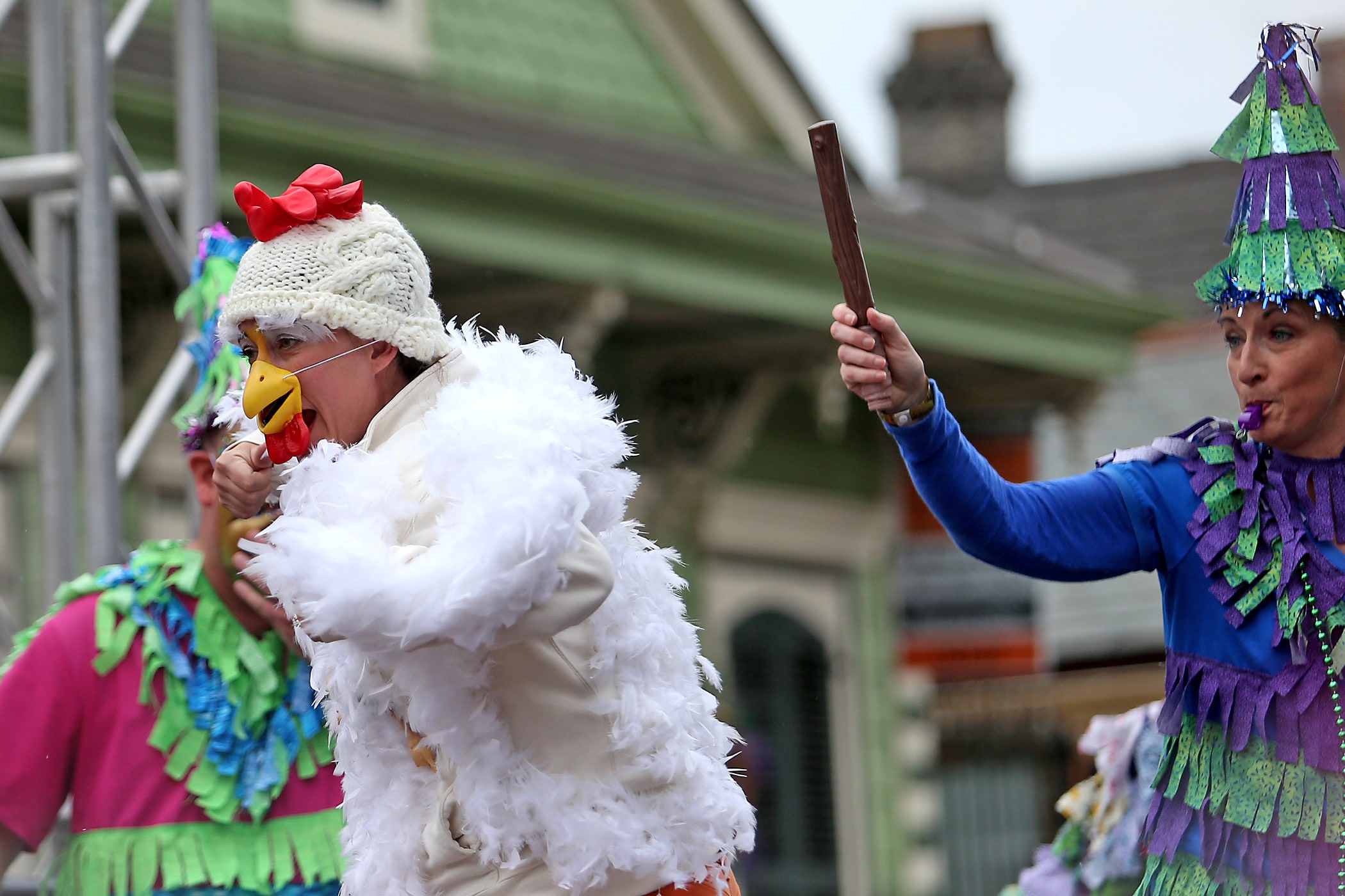 An inflatable doll is “shot” from a cannon during the 56th annual Bourbon Street Awards at Dauphine and St. Ann Streets hosted by the Good Friends Bar and the Queens Head Pub on Mardi Gras Day, 2020. (Photo by Michael DeMocker)