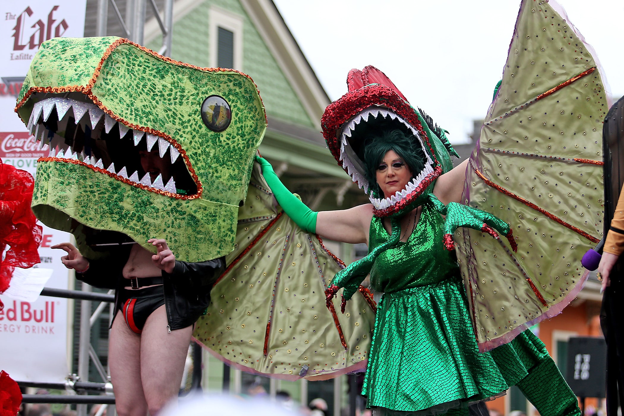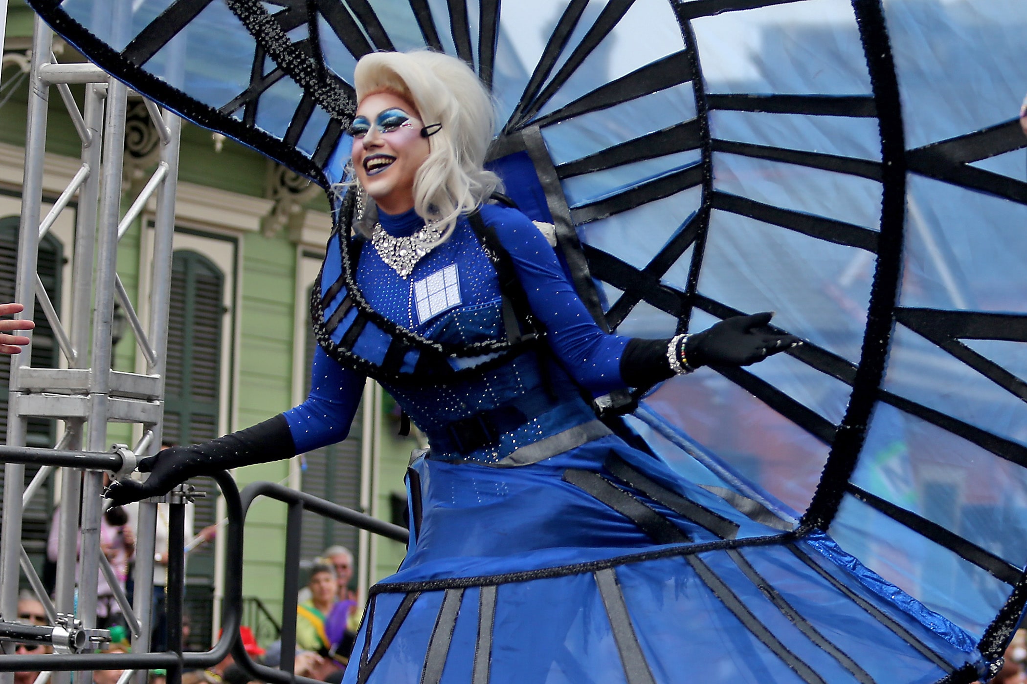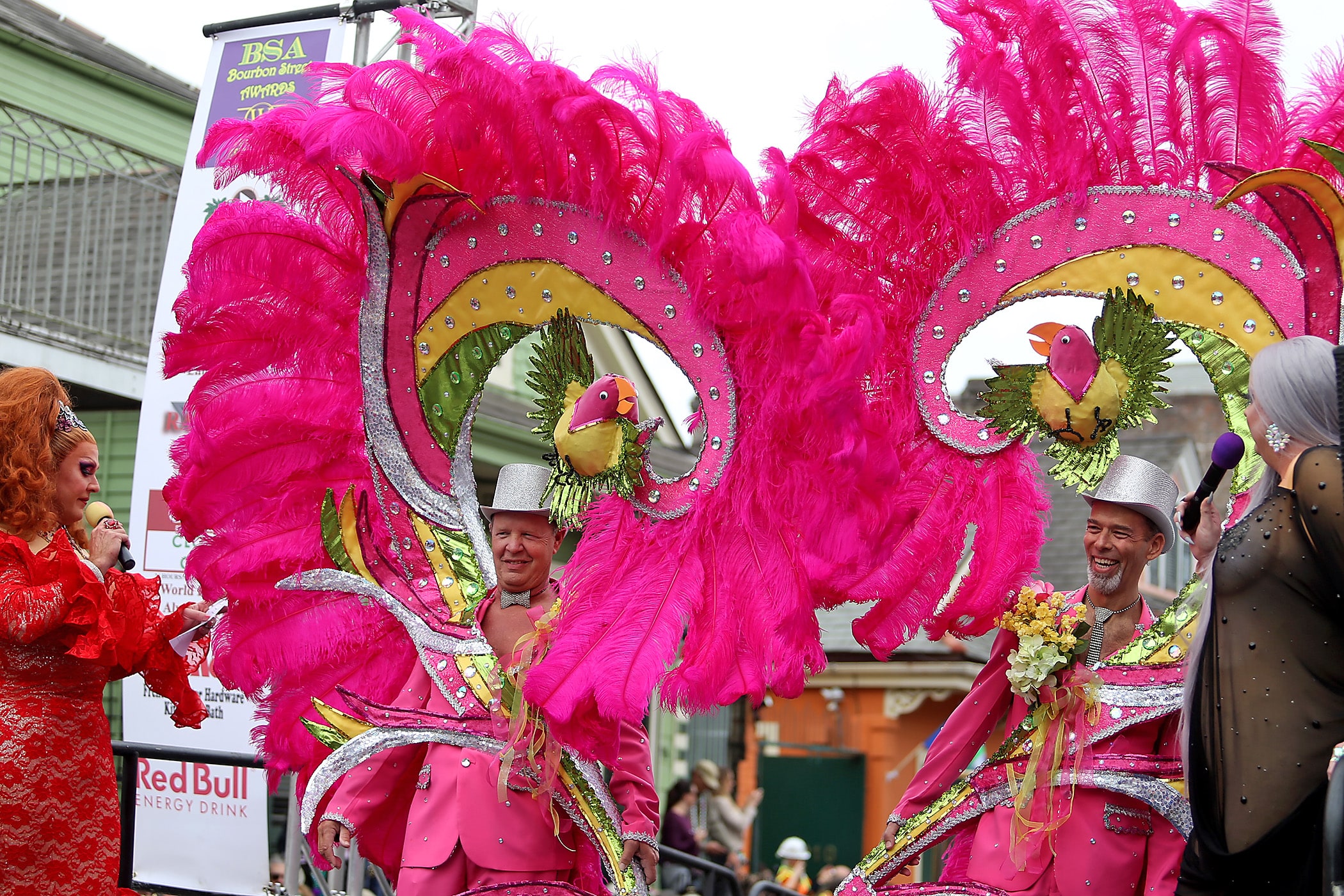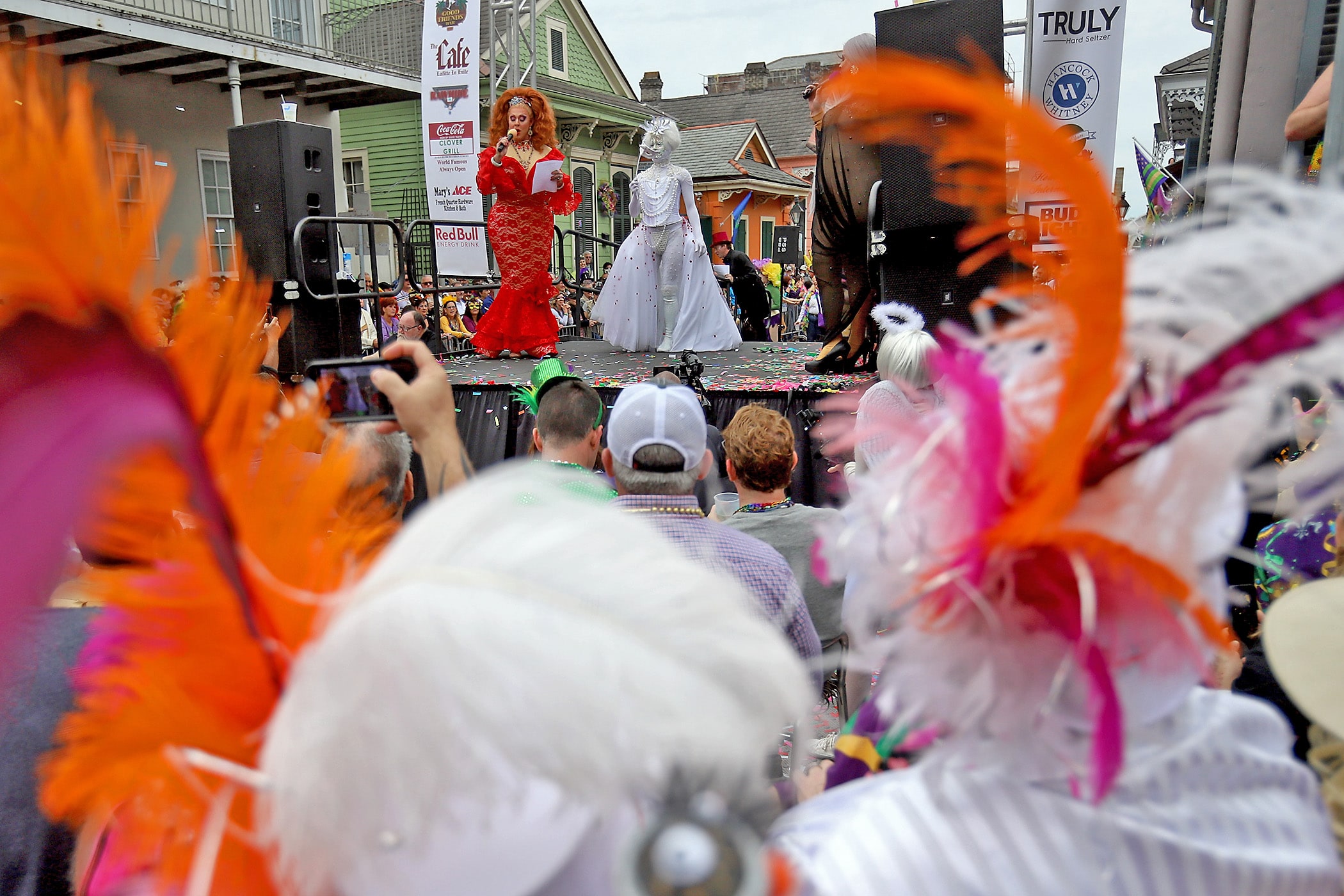 Elaborate and fabulous costumes compete for prizes in the categories of Drag, Leather, Group, Individual, and Best Overall during the 56th annual Bourbon Street Awards at Dauphine and St. Ann Streets hosted by the Good Friends Bar and the Queens Head Pub on Mardi Gras Day, 2020. (Photo by Michael DeMocker)
