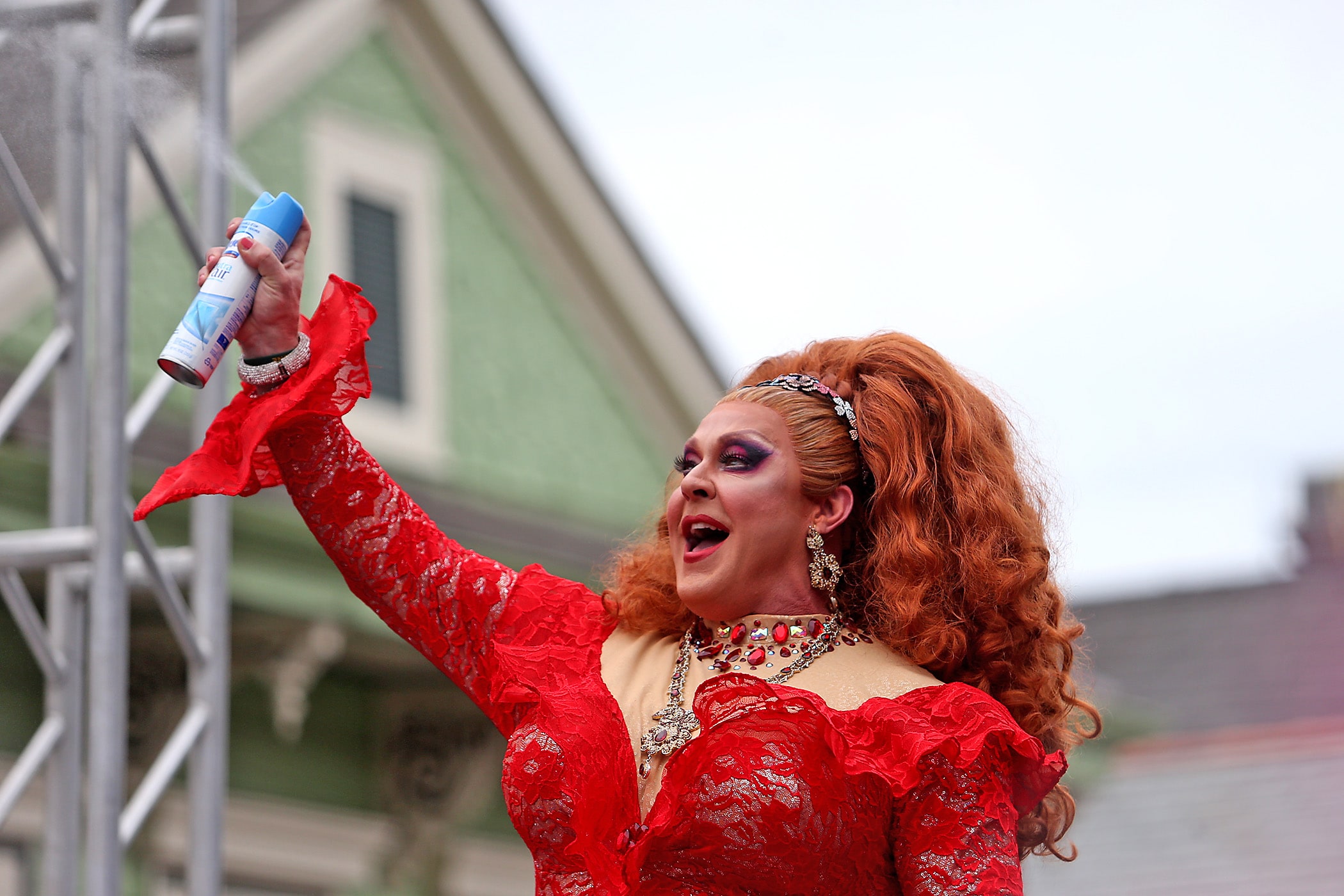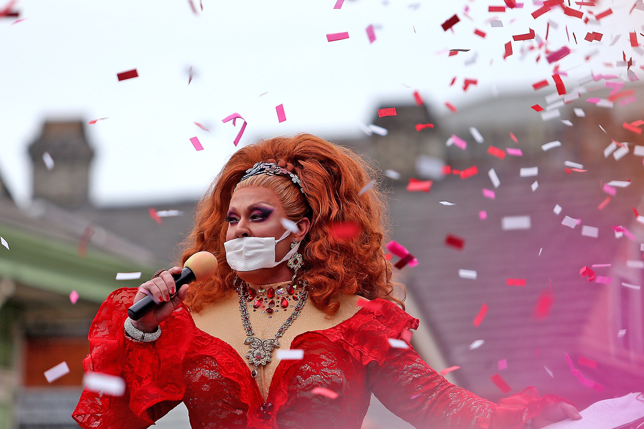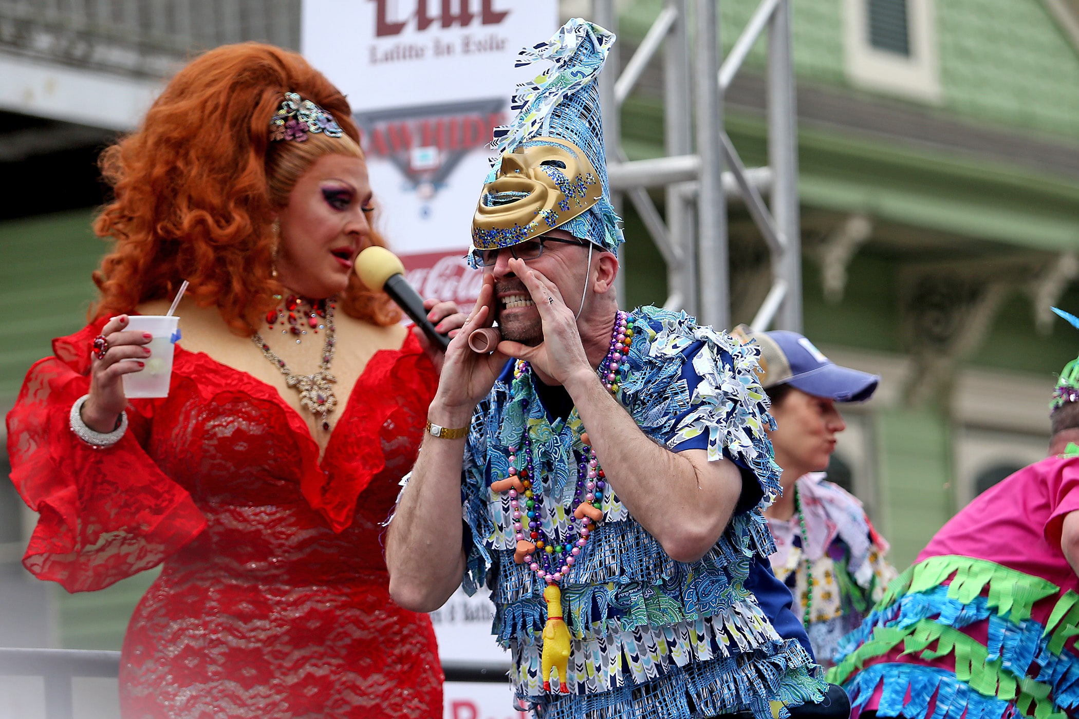 Master of Ceremonies Varla Jean Merman hosts the competition during the 56th annual Bourbon Street Awards at Dauphine and St. Ann Streets hosted by the Good Friends Bar and the Queens Head Pub on Mardi Gras Day, 2020. (Photo by Michael DeMocker)
