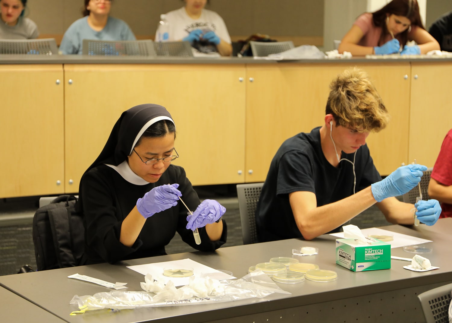 Bacteria lit up the night Thursday as the Zeitgeist Theater was transformed into a bioluminescent wonderland thanks to Dr. Hunter Cole’s unique “Illuminated Living Art” project. With the help of her Loyola students, she painted hundreds of Petri dishes with a special strain of bacteria that glows as it feeds on agar in the dishes. The glowing designs were placed around the darkened theater and affixed to dancers to complete the ethereal experience.