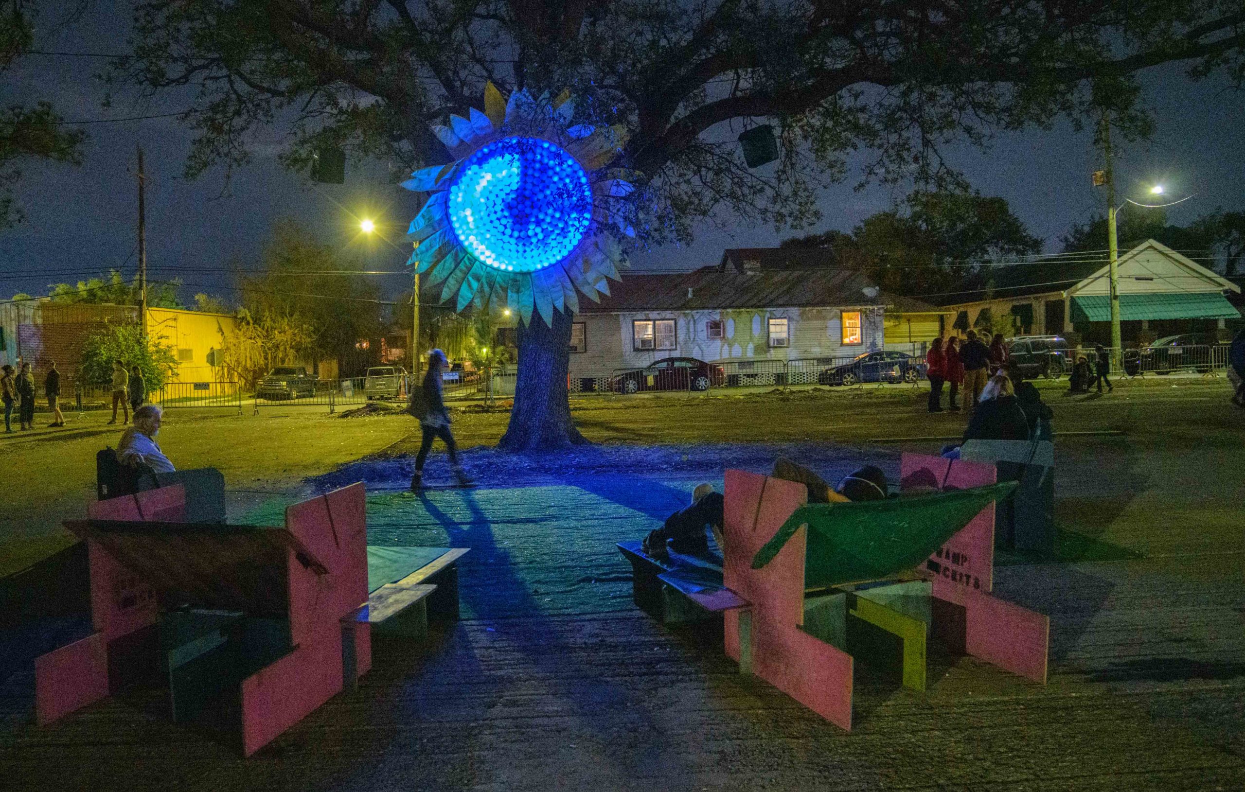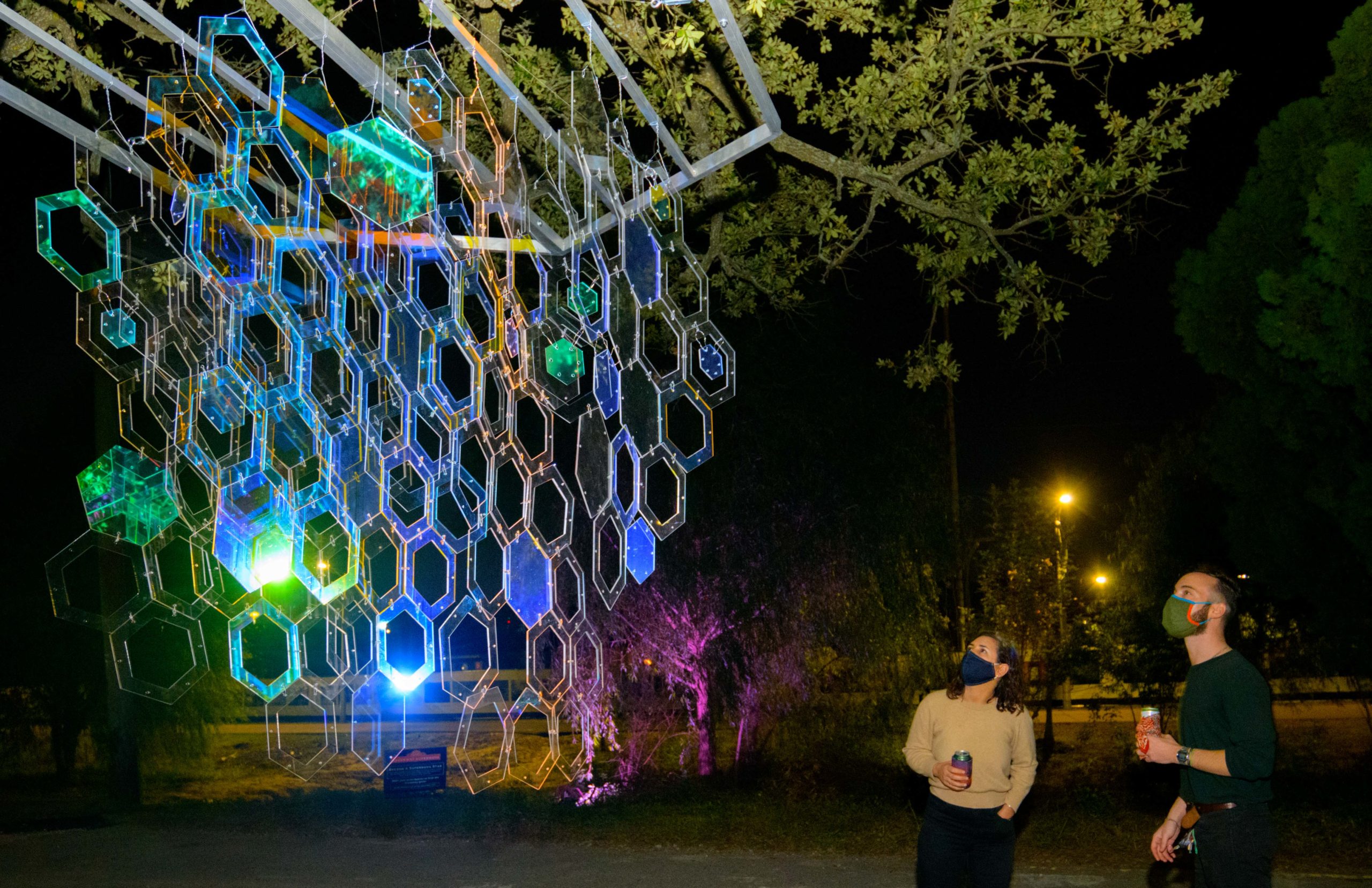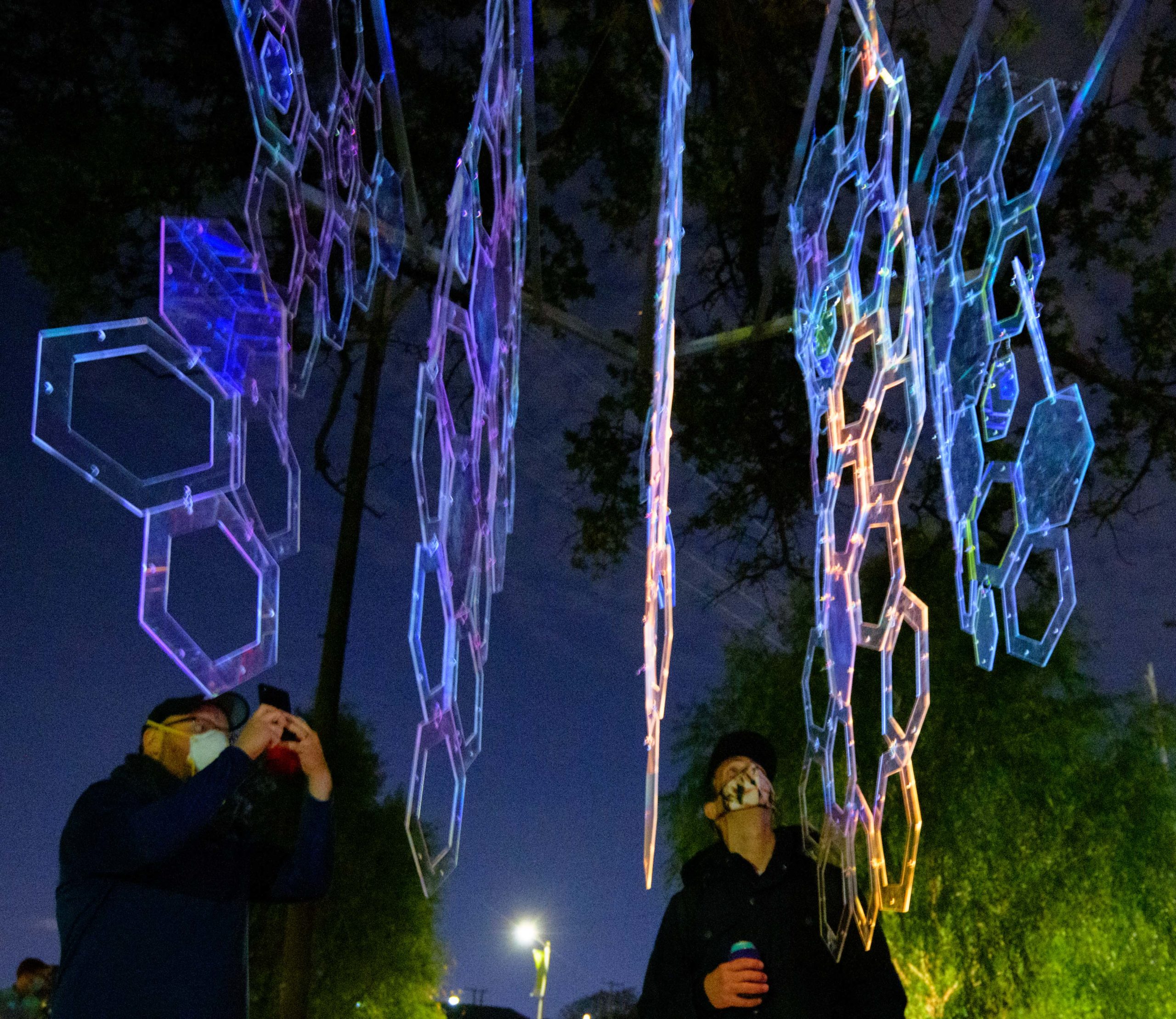 The Alveare Luminoso (Glowing Hive) by Luba Zygarewicz is a series of honeycombed shape panels that make interesting colors in the darkness. According to the Supernova flyer it is “Inspired by the role bees play in sustainability and their complex lives of interdependence for the greater good, this sculpture consists of several vertical layers of hexagons that are suspended from an oak tree and are bathed in amber color light to create a rich ambiance. The multiple acrylic hexagons are individually connected to enhance movement and represent our need for connection, while the fluttering reflections speak of the greater impact we each have on our environment and communities.” Photos by Matthew Hinton