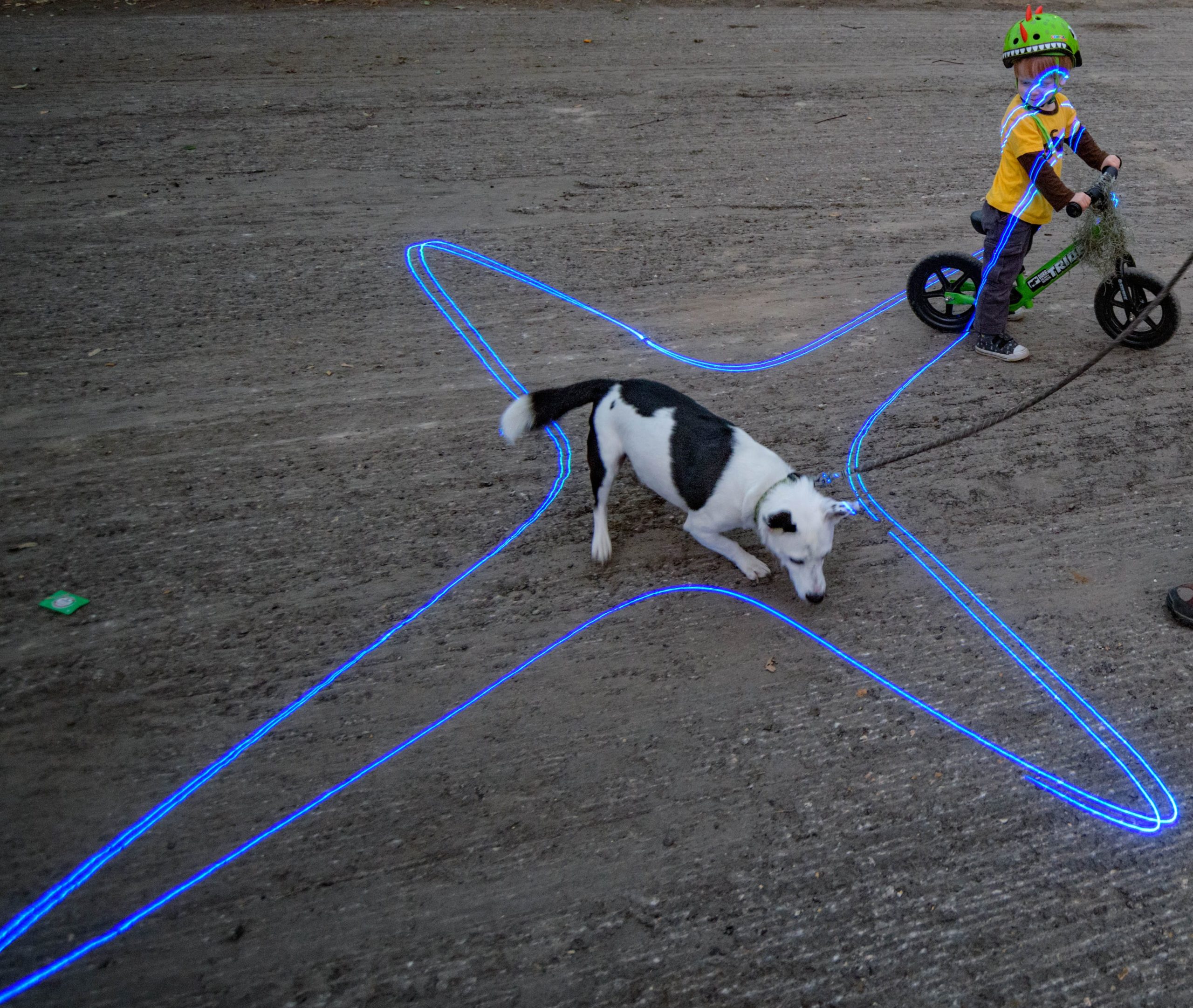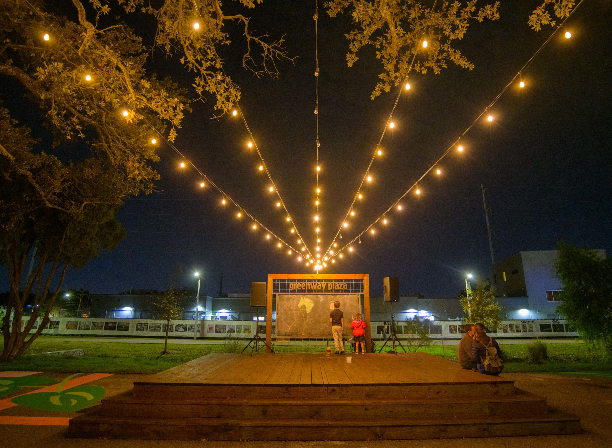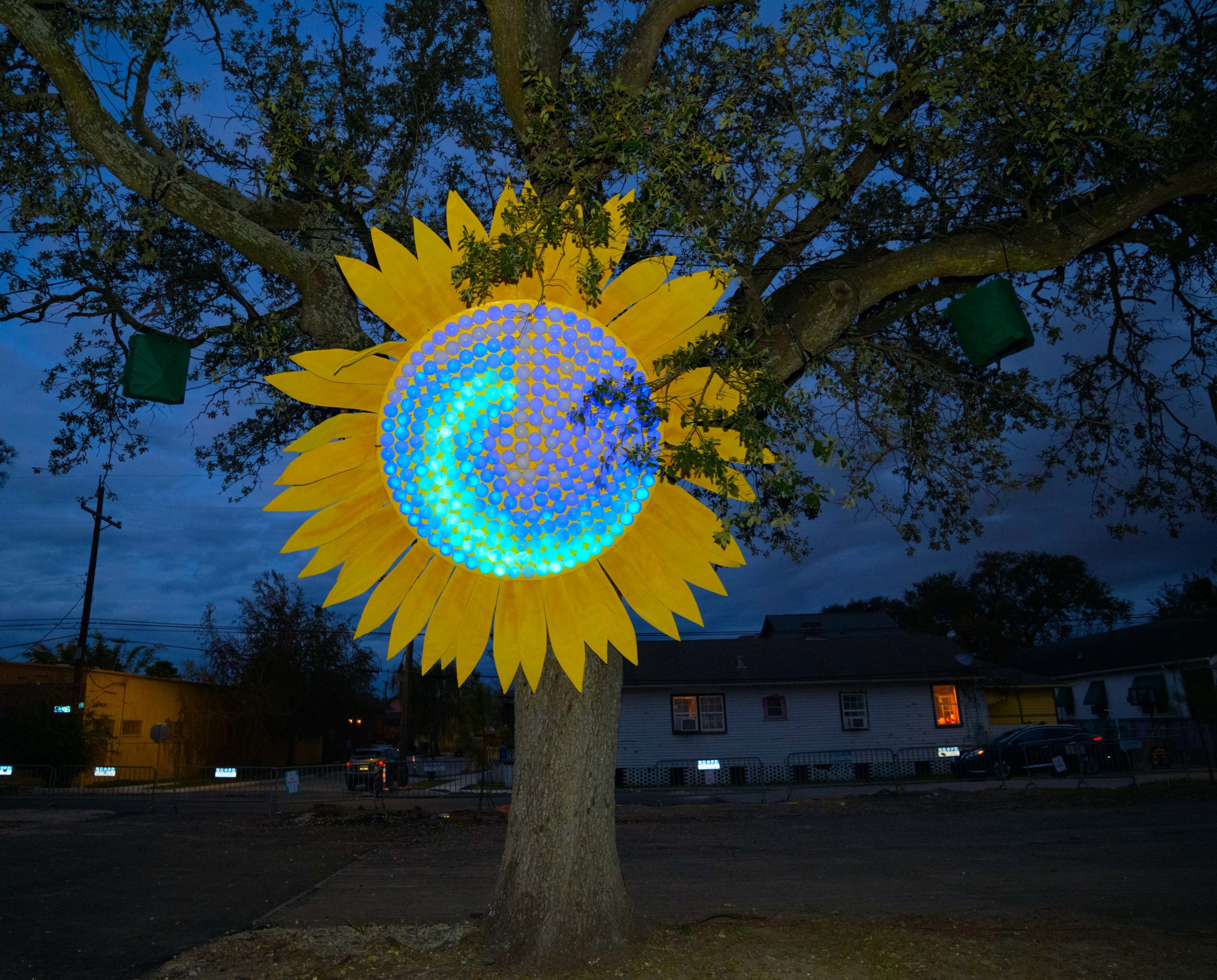 The Alveare Luminoso (Glowing Hive) by Luba Zygarewicz is a series of honeycombed shape panels that make interesting colors in the darkness. According to the Supernova flyer it is “Inspired by the role bees play in sustainability and their complex lives of interdependence for the greater good, this sculpture consists of several vertical layers of hexagons that are suspended from an oak tree and are bathed in amber color light to create a rich ambiance. The multiple acrylic hexagons are individually connected to enhance movement and represent our need for connection, while the fluttering reflections speak of the greater impact we each have on our environment and communities.” Photos by Matthew Hinton