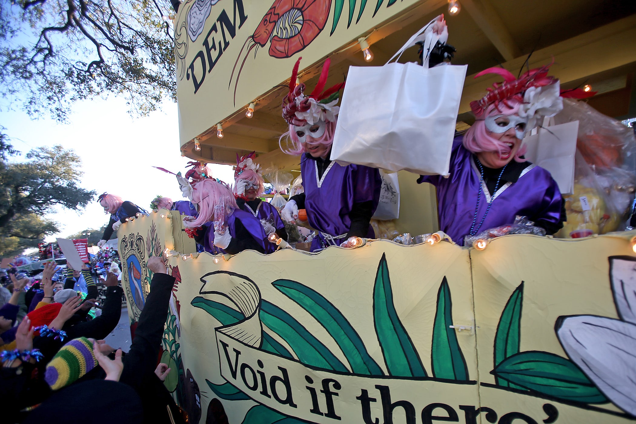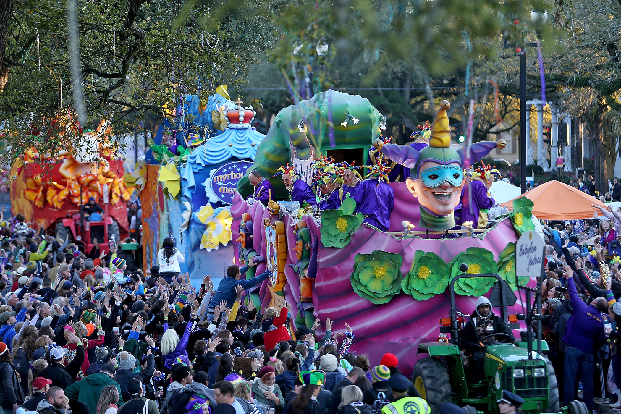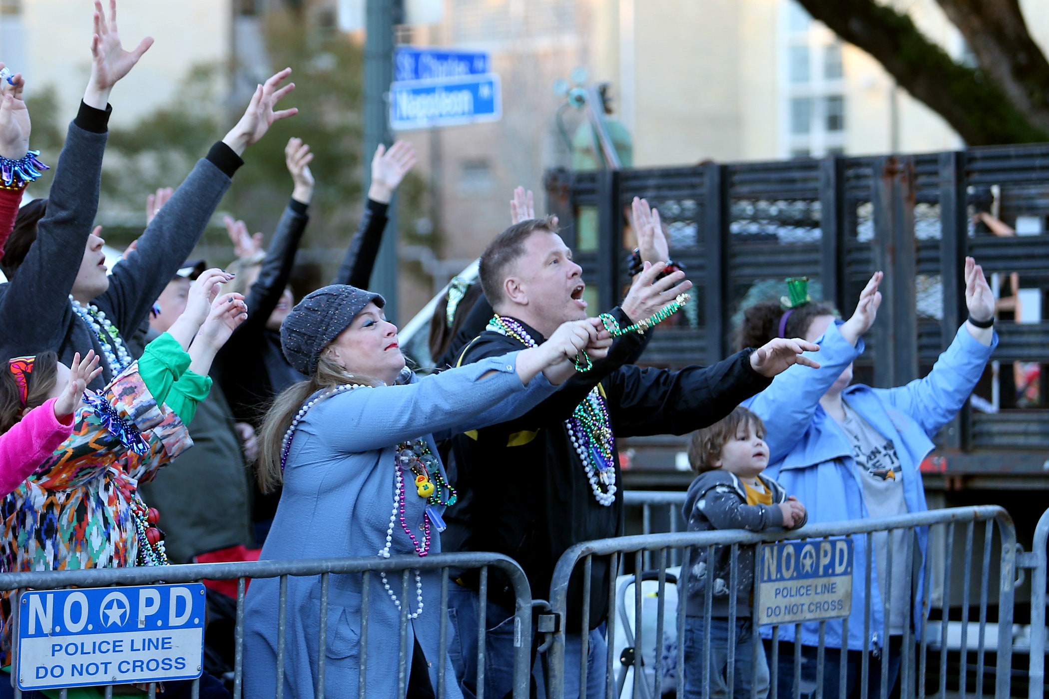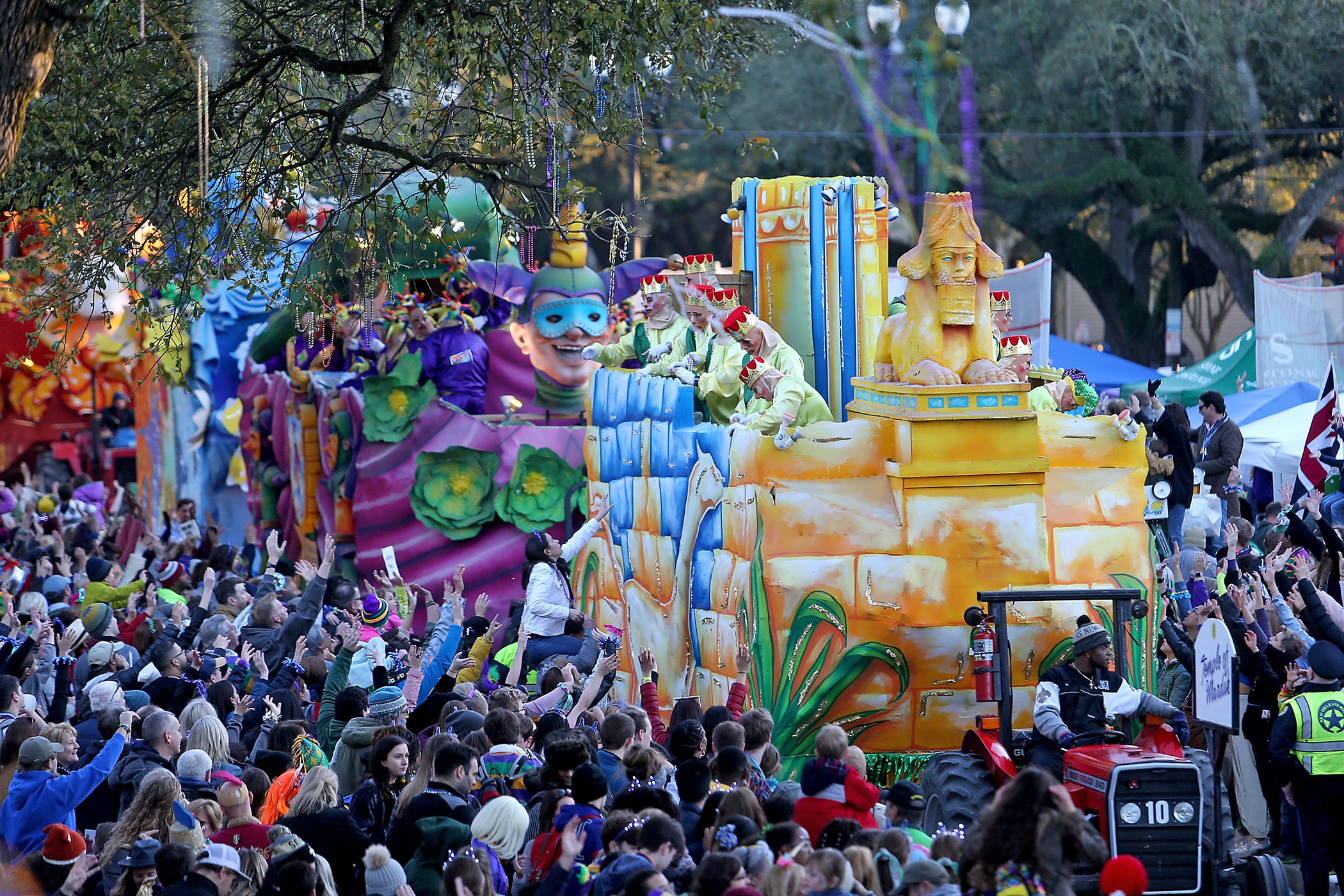 The crowd catches beads on Napoleon Avenue as the 300-plus members of the Knights of Babylon roll down the Uptown parade route with a 27-float parade as they celebrate their 81st anniversary on Friday, February 21, 2020. (Photo by Michael DeMocker)