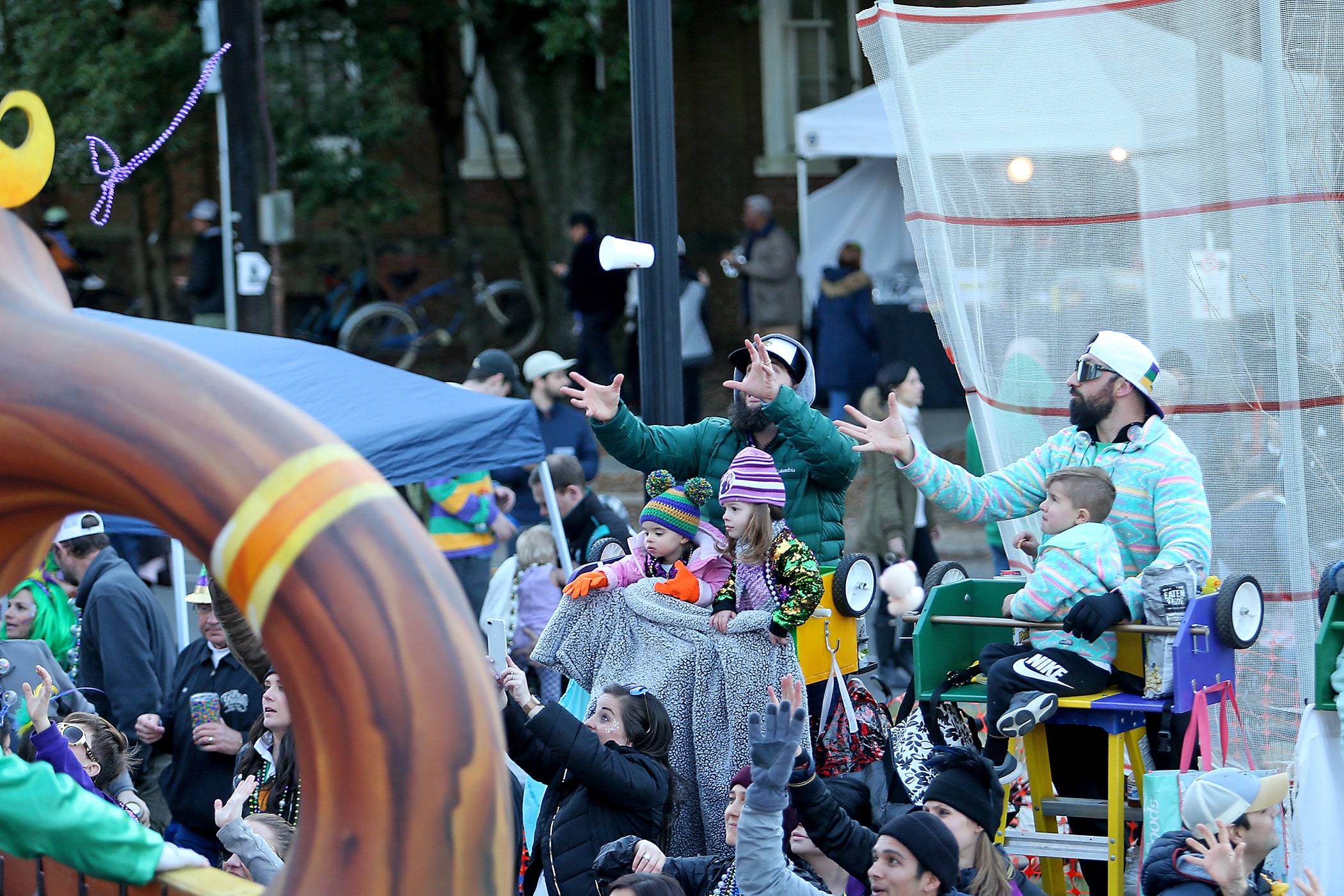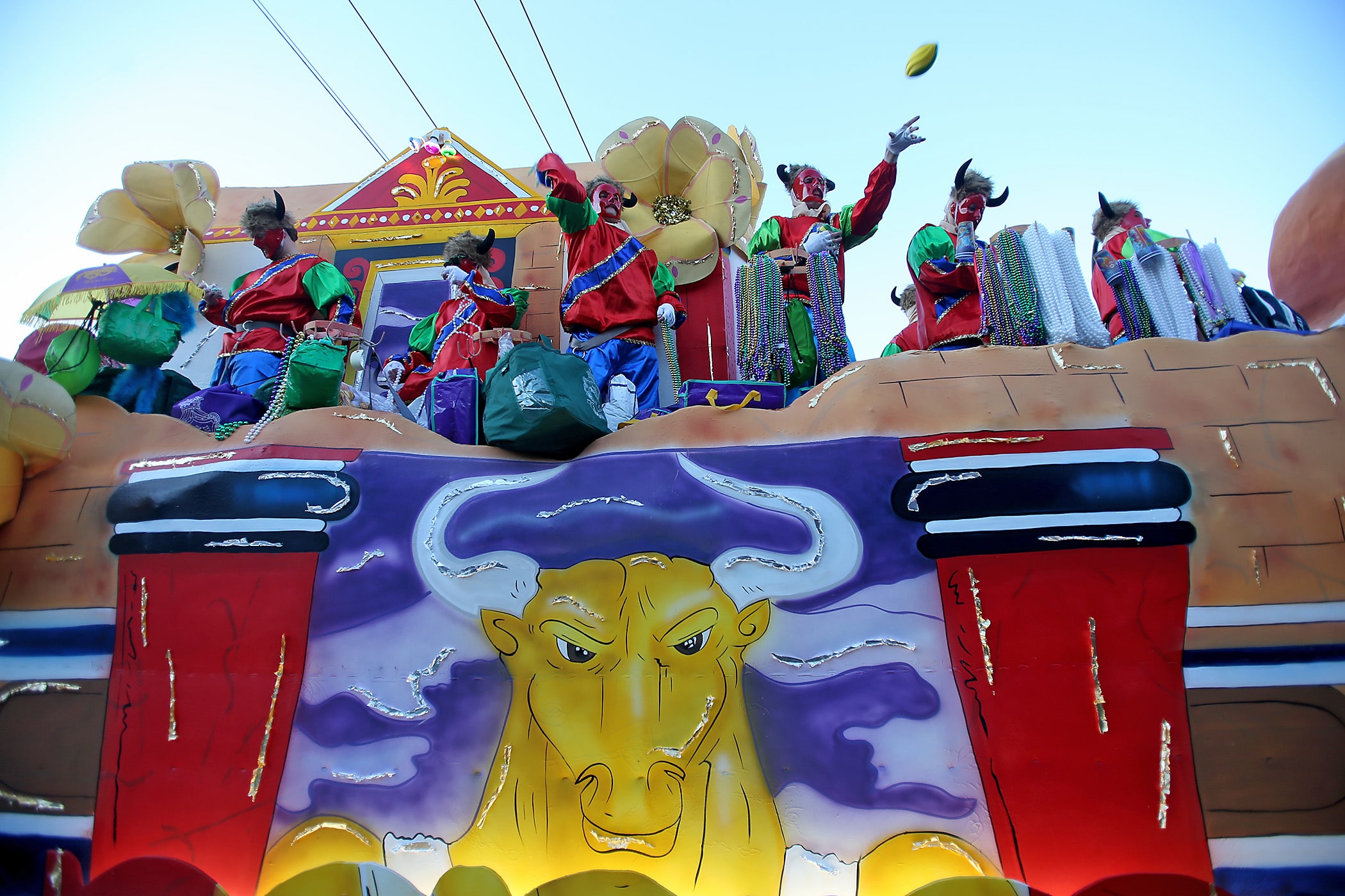 A rider throws to the crowd as the 300-plus members of the Knights of Babylon roll down the Uptown parade route with a 27-float parade as they celebrate their 81st anniversary on Friday, February 21, 2020. (Photo by Michael DeMocker)