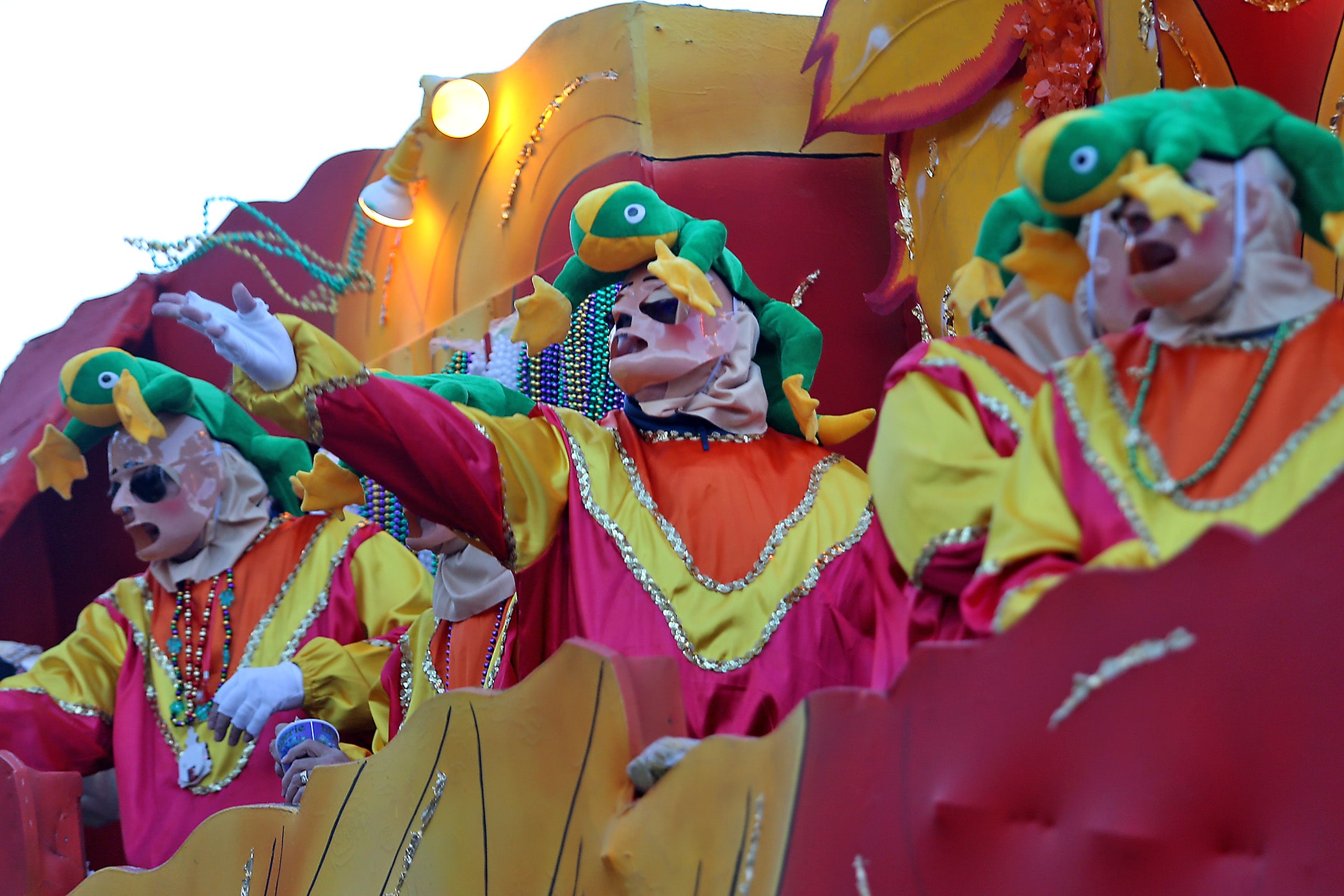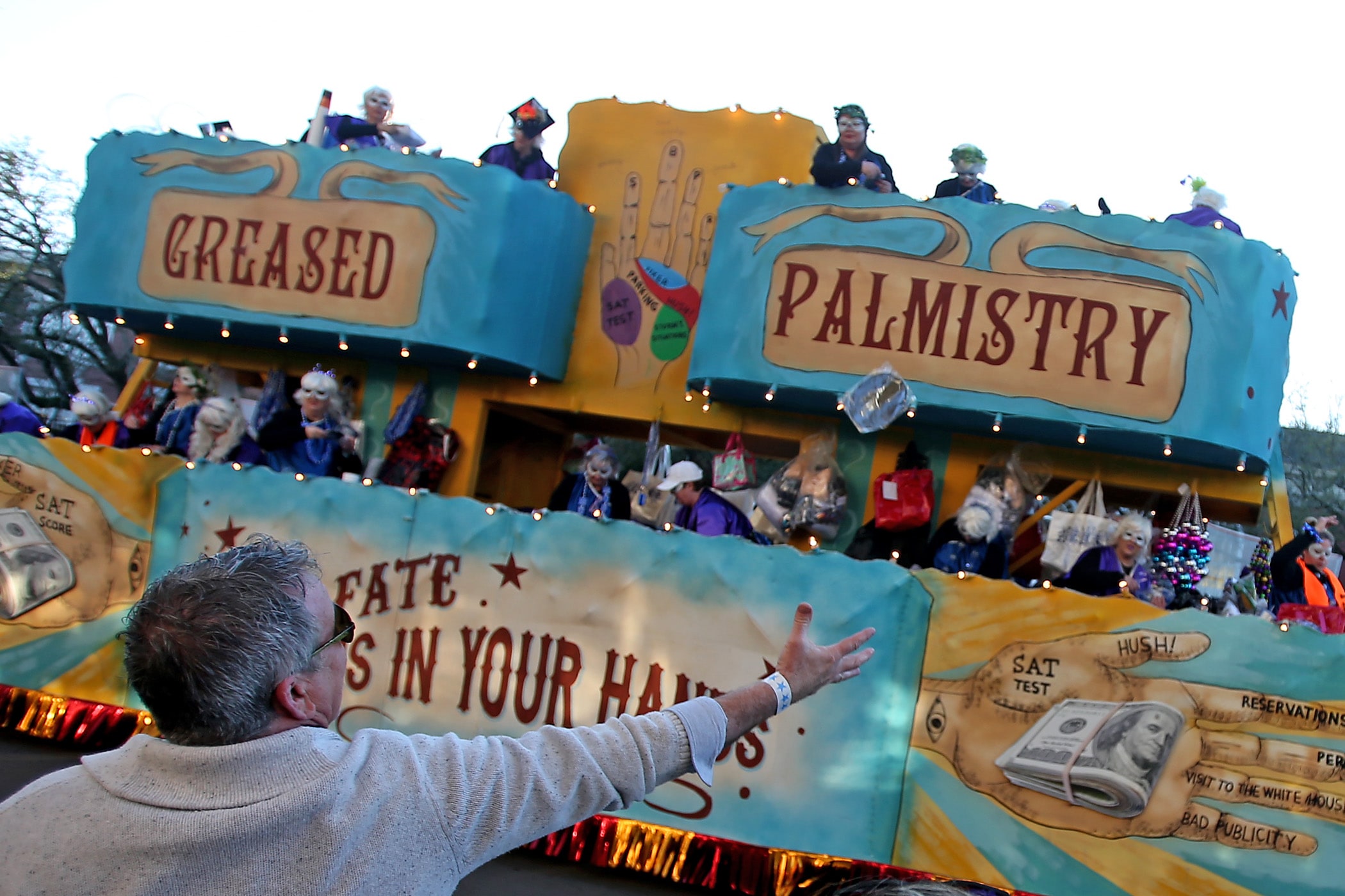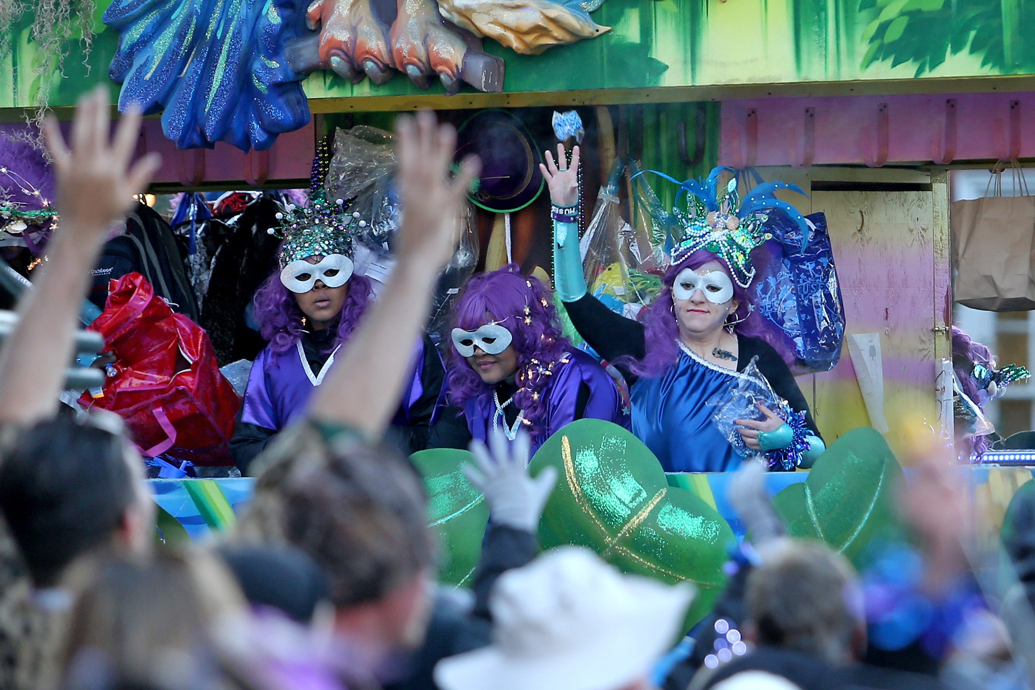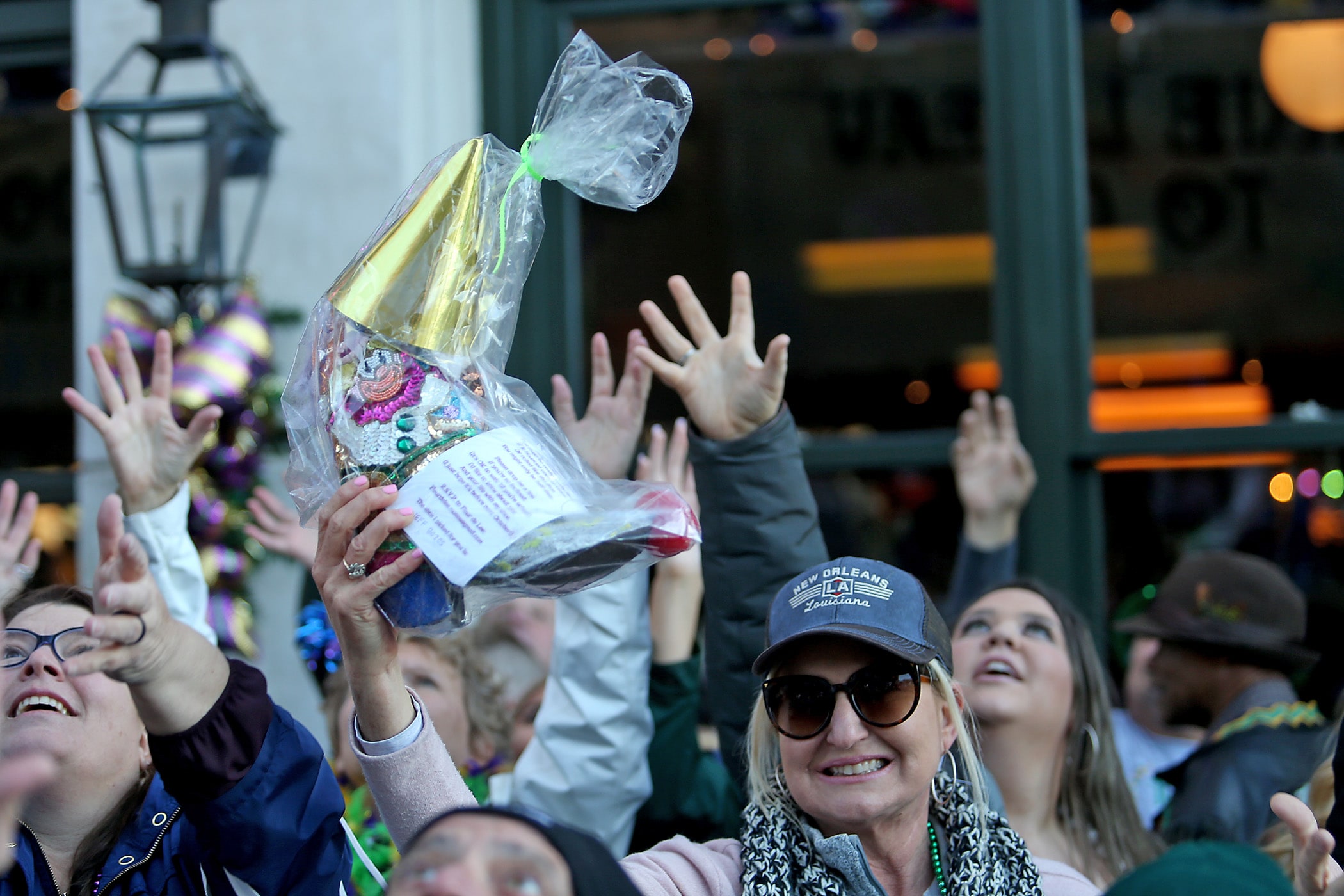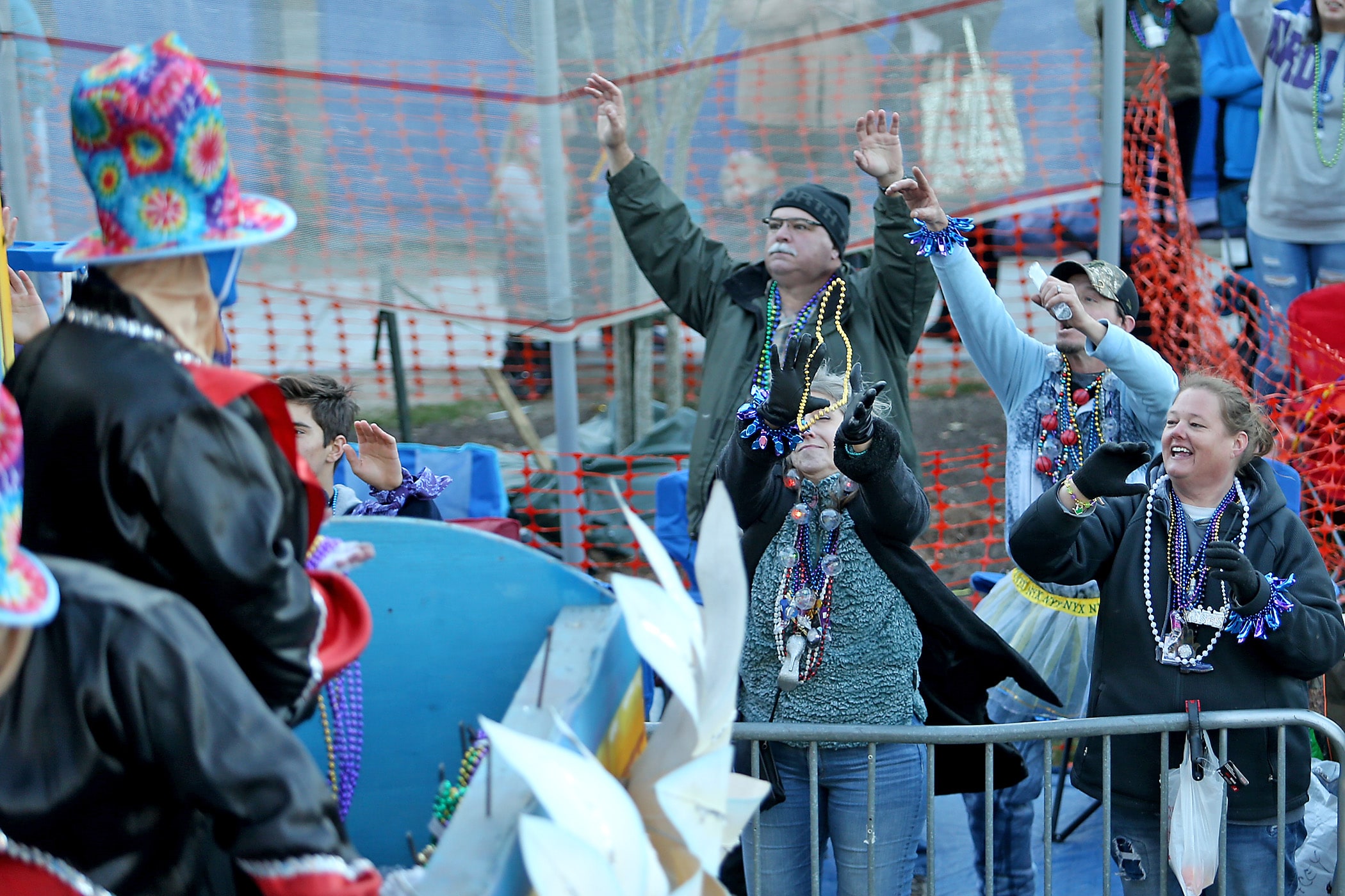 Beads are caught on St. Charles Avenue as the 300-plus members of the Knights of Babylon roll down the Uptown parade route with a 27-float parade as they celebrate their 81st anniversary on Friday, February 21, 2020. (Photo by Michael DeMocker)