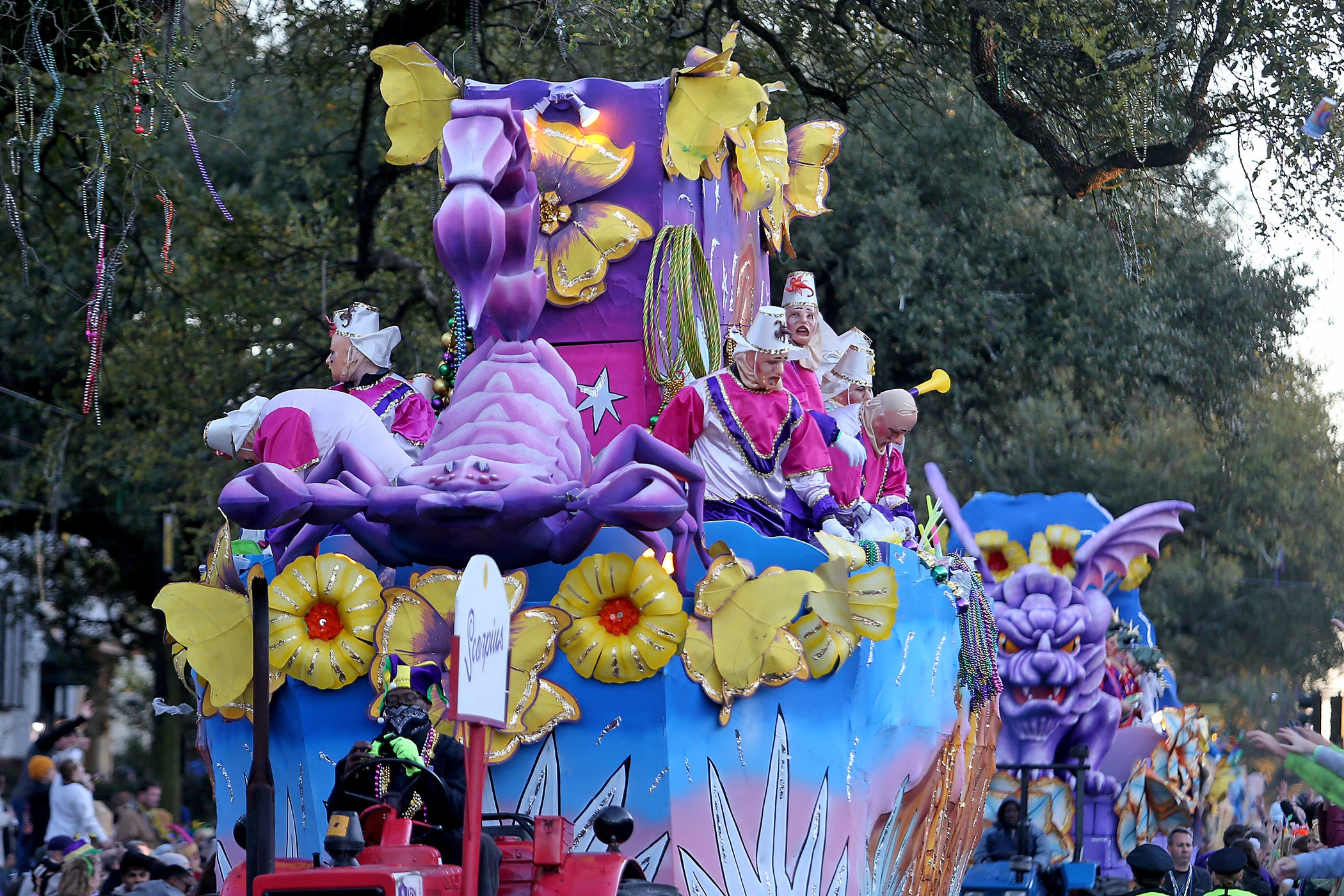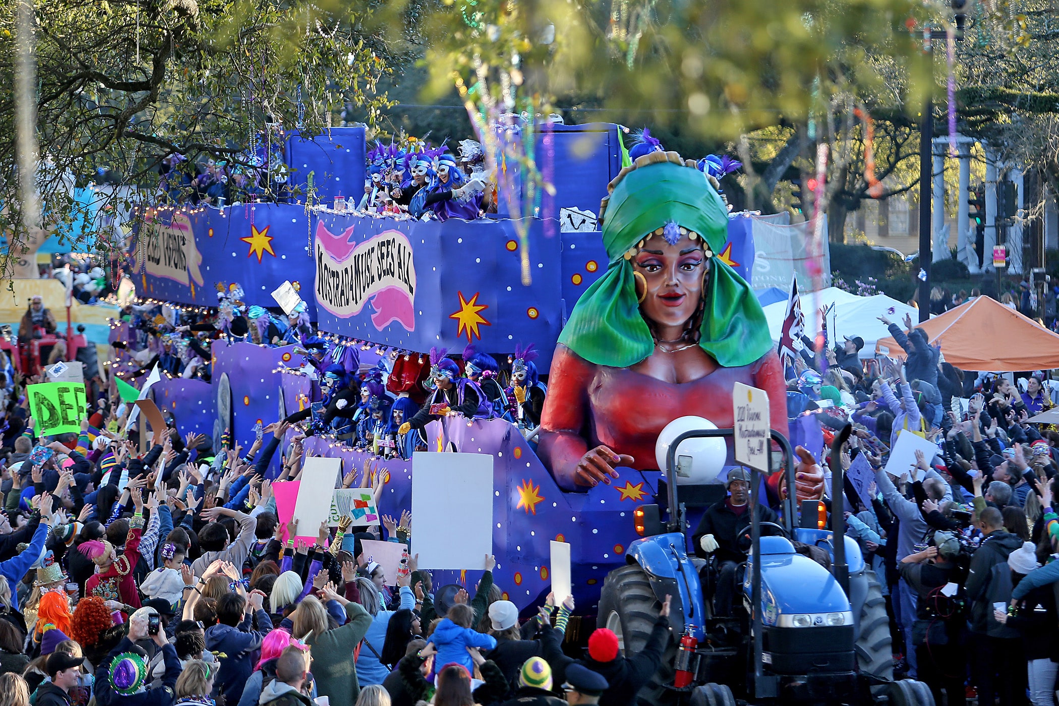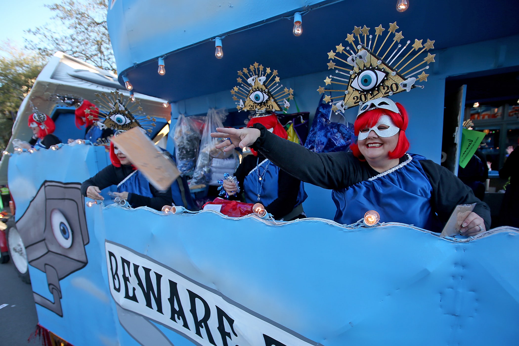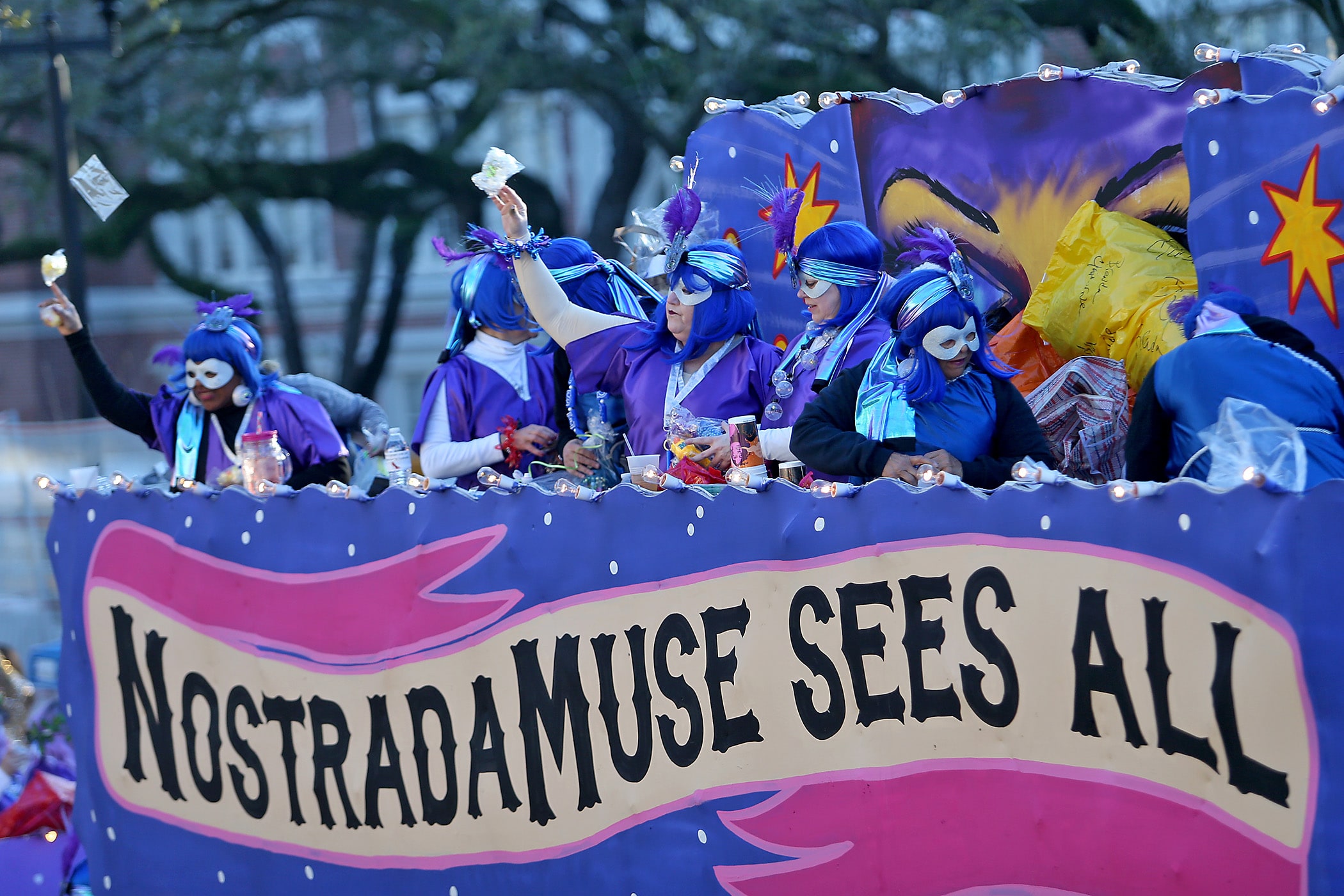 The title float comes up Napoleon Avenue as the over 1100 women of the Krewe of Muses roll down the Uptown parade route with a 26-float parade with the theme “Nostradamuse Sees All” as they celebrate their 20th anniversary on Friday, February 21, 2020. (Photo by Michael DeMocker)