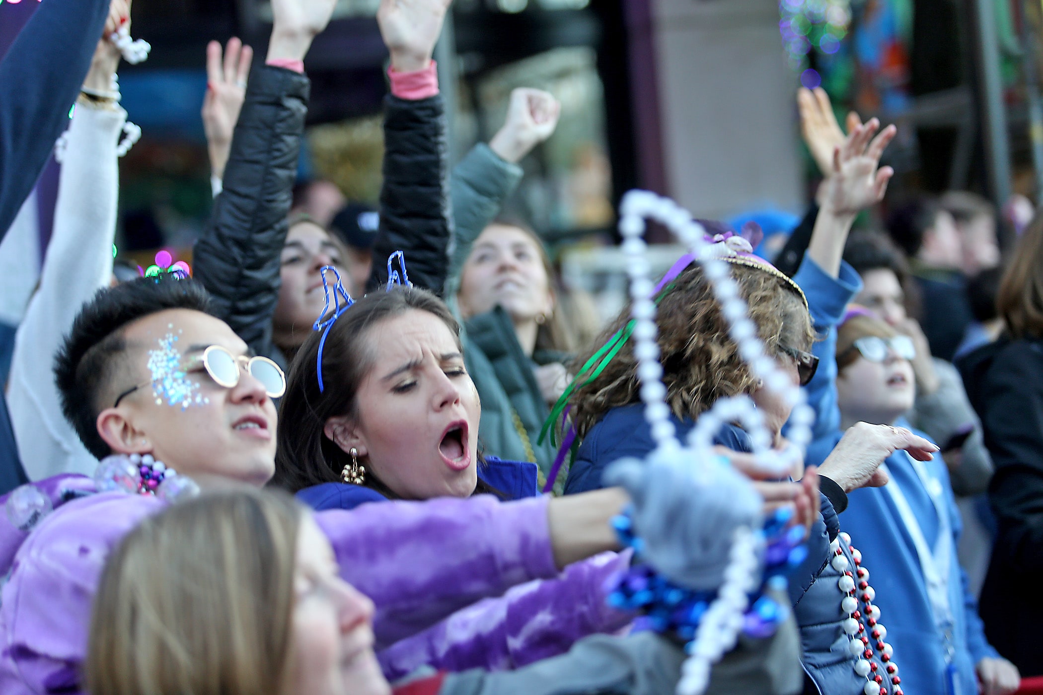 The crowd snares throws on Napoleon Avenue as the over 1100 women of the Krewe of Muses roll down the Uptown parade route with a 26-float parade with the theme “Nostradamuse Sees All” as they celebrate their 20th anniversary on Friday, February 21, 2020. (Photo by Michael DeMocker)
