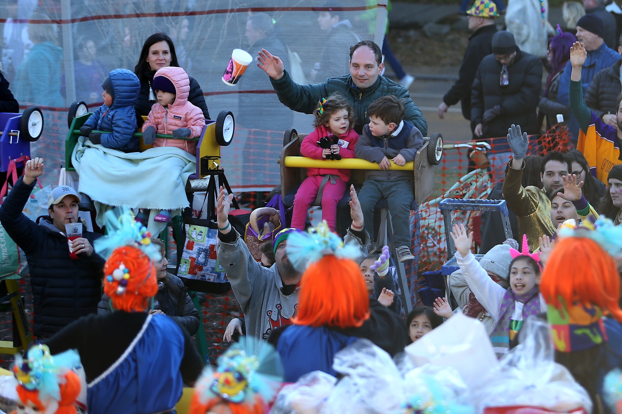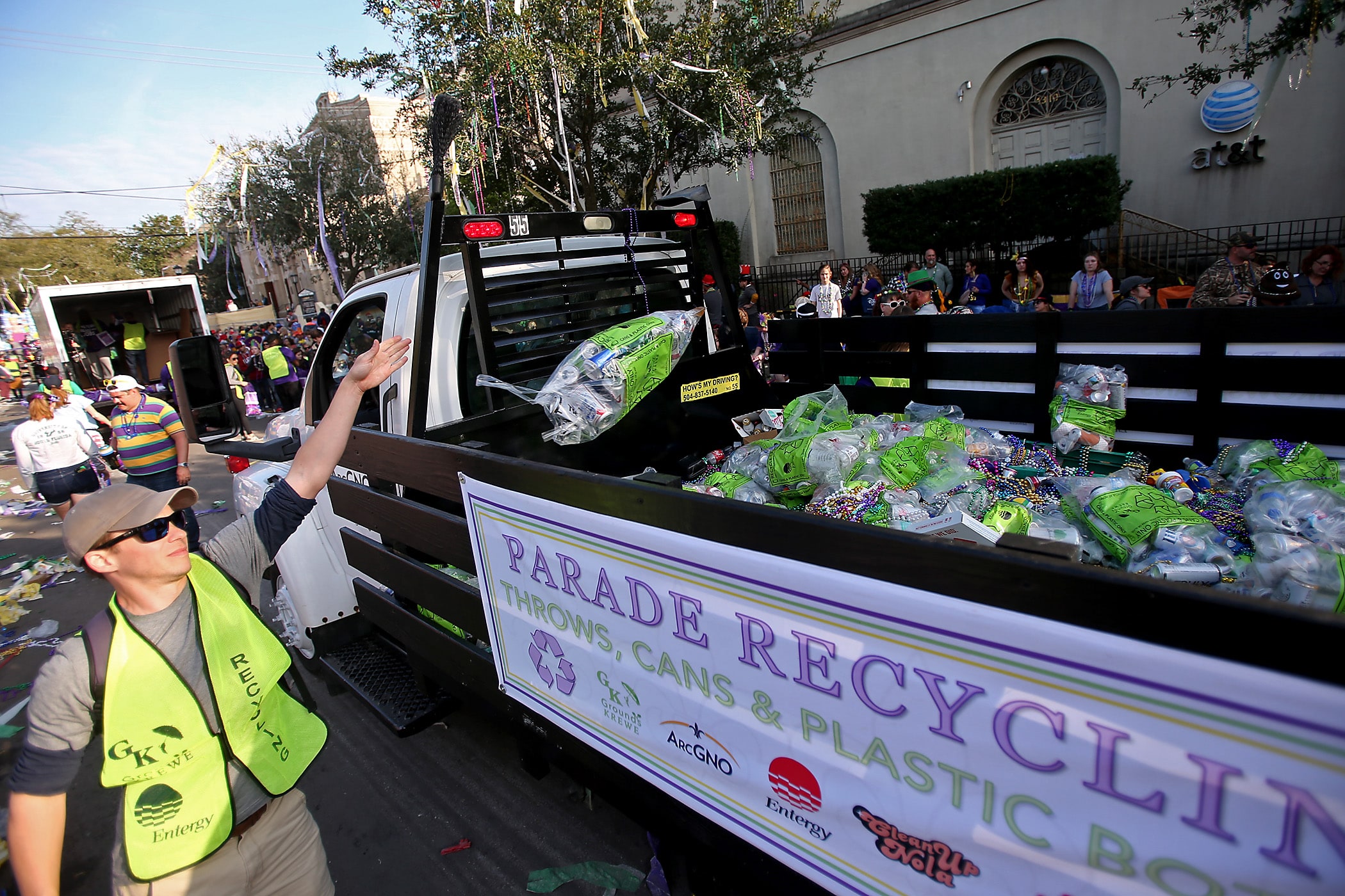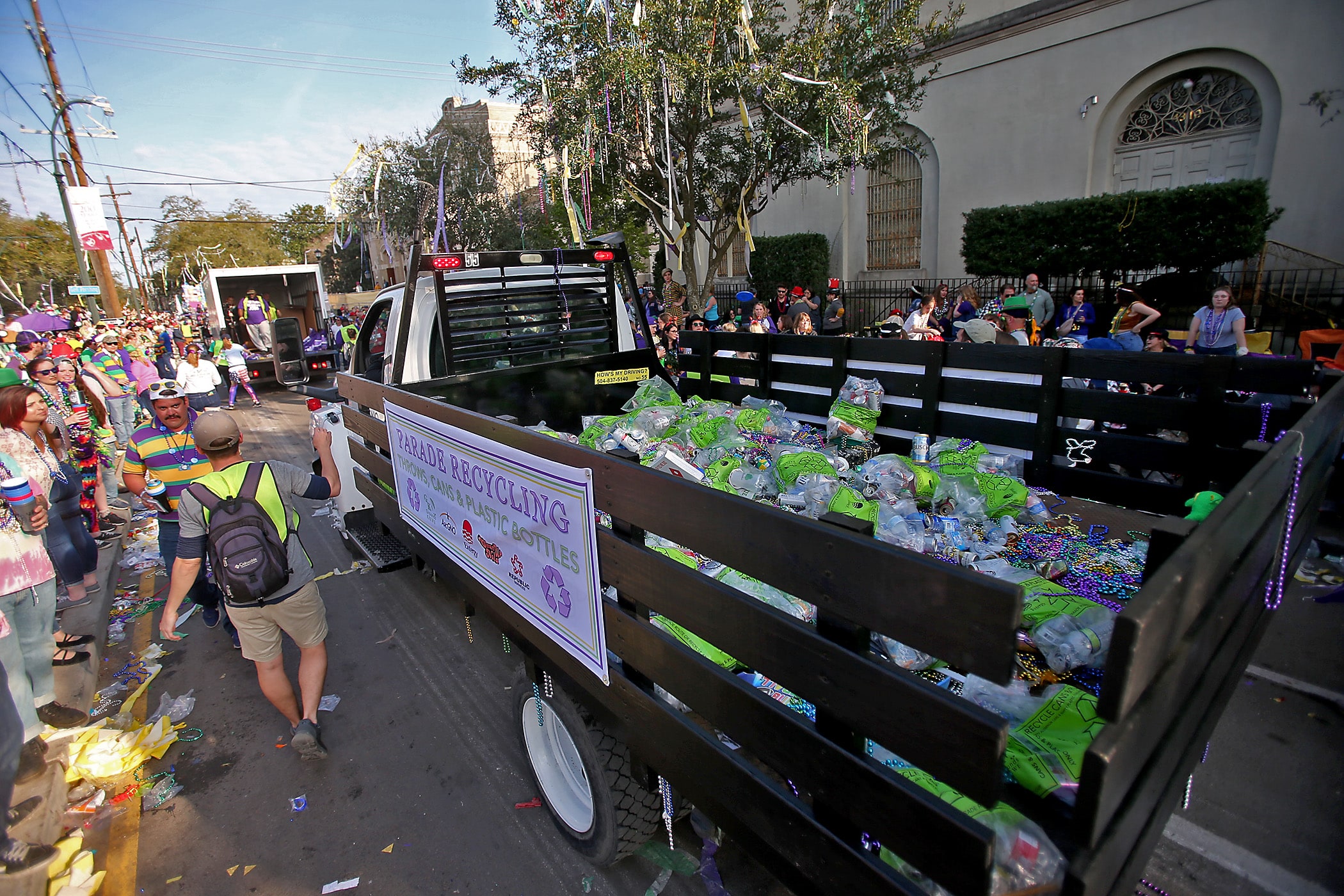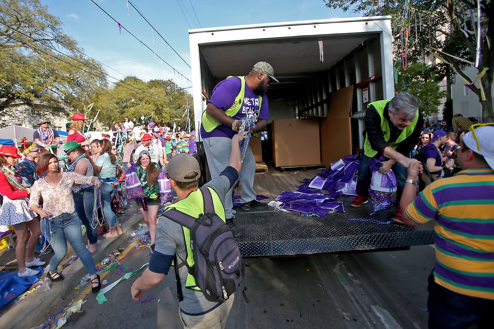 Volunteers collect beads for recycling at ARCGNO as they trail the day parades on Sunday, February 23, 2020. (Photo by Michael DeMocker)