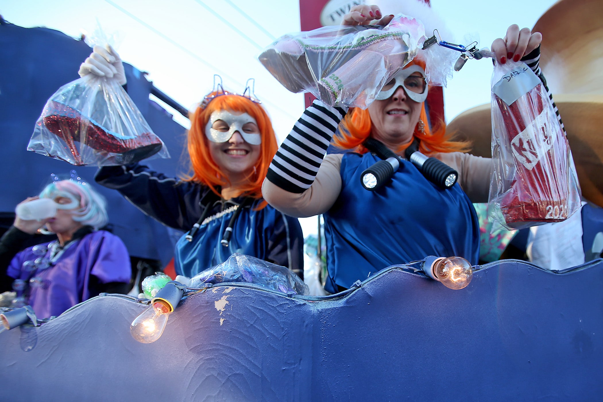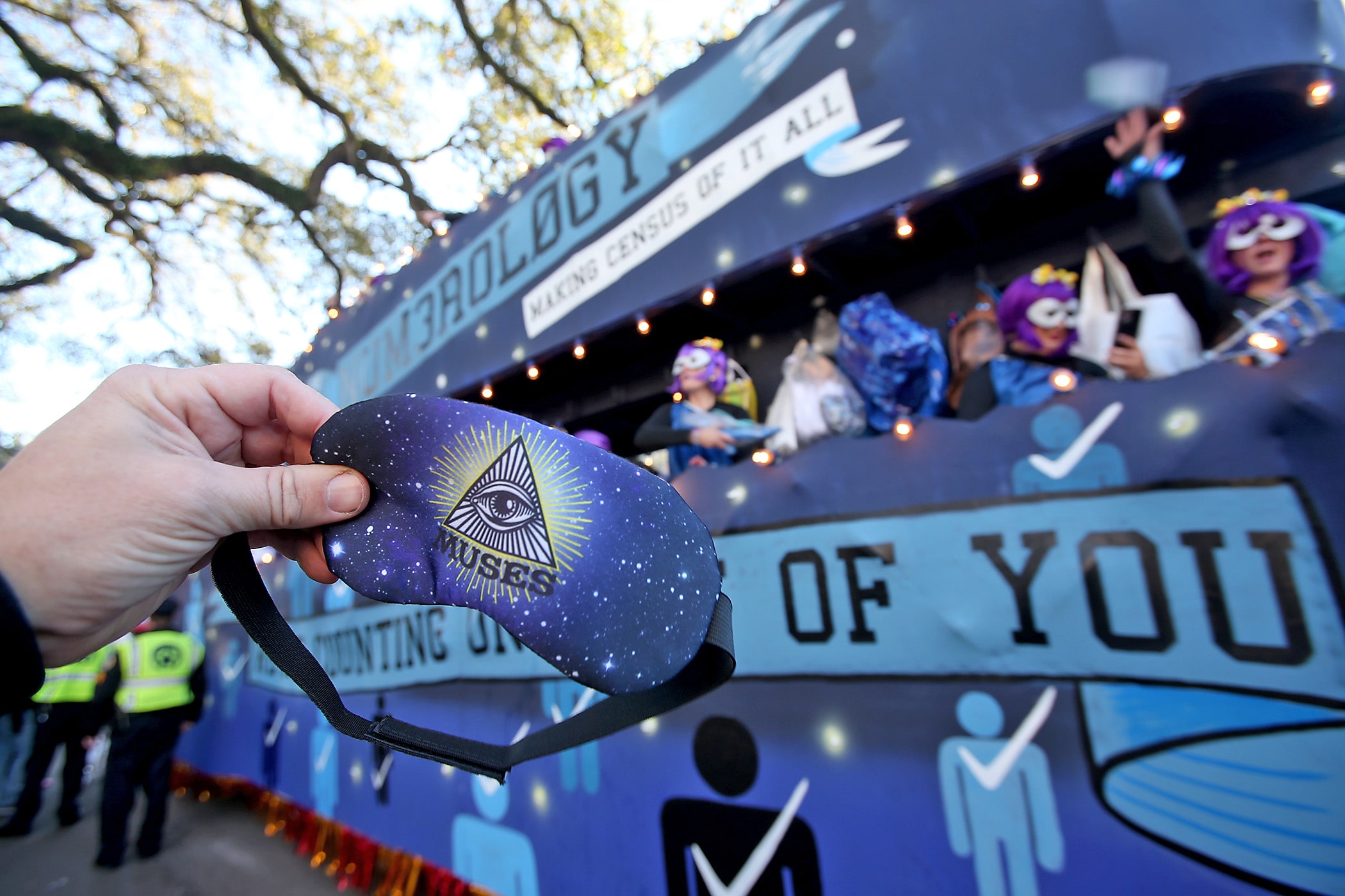 A sleeping mask, part of a sustainability effort by the Krewe of Muses, is caught during their parade on Napoleon Avenue on Friday, February 21, 2020. (Photo by Michael DeMocker)
