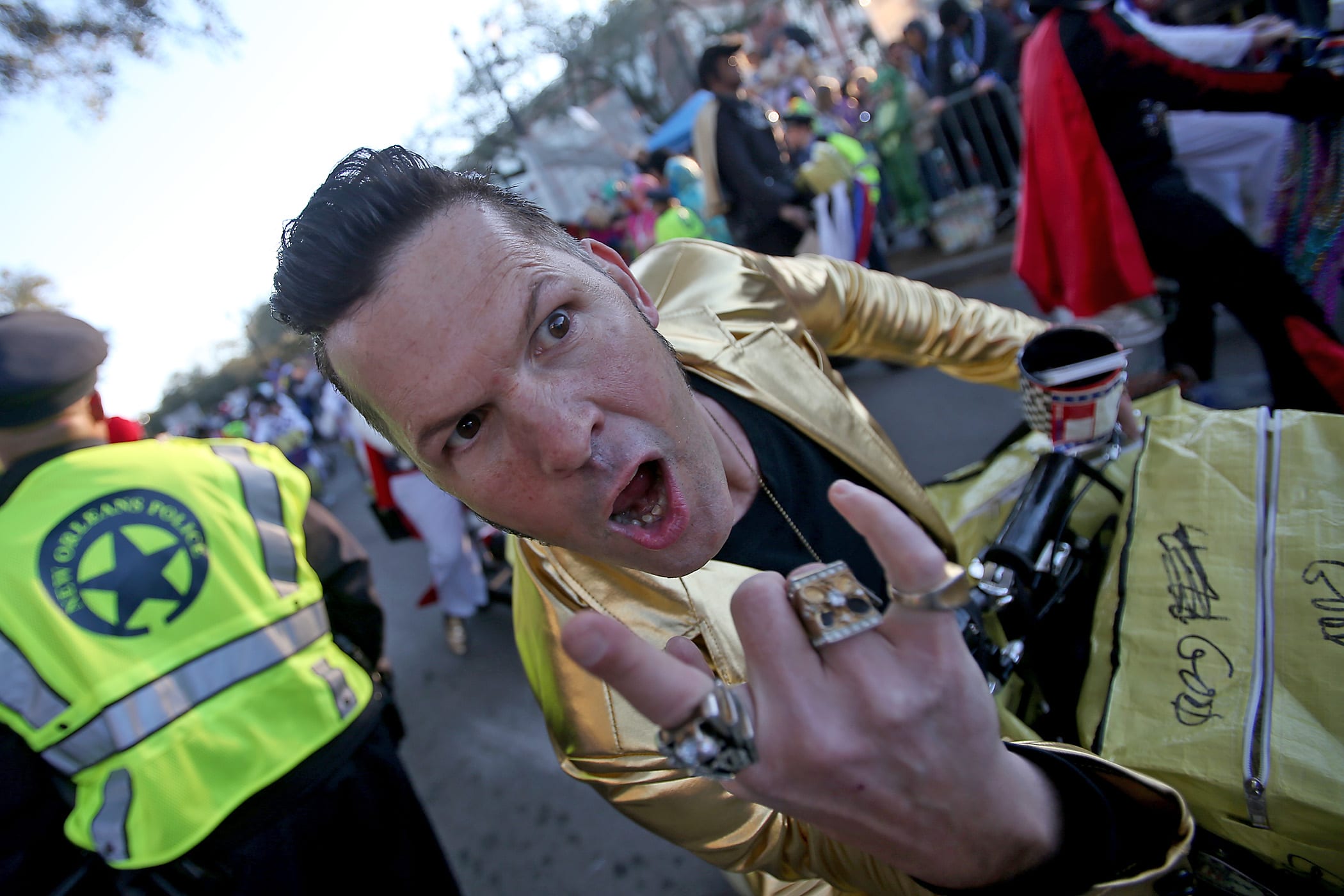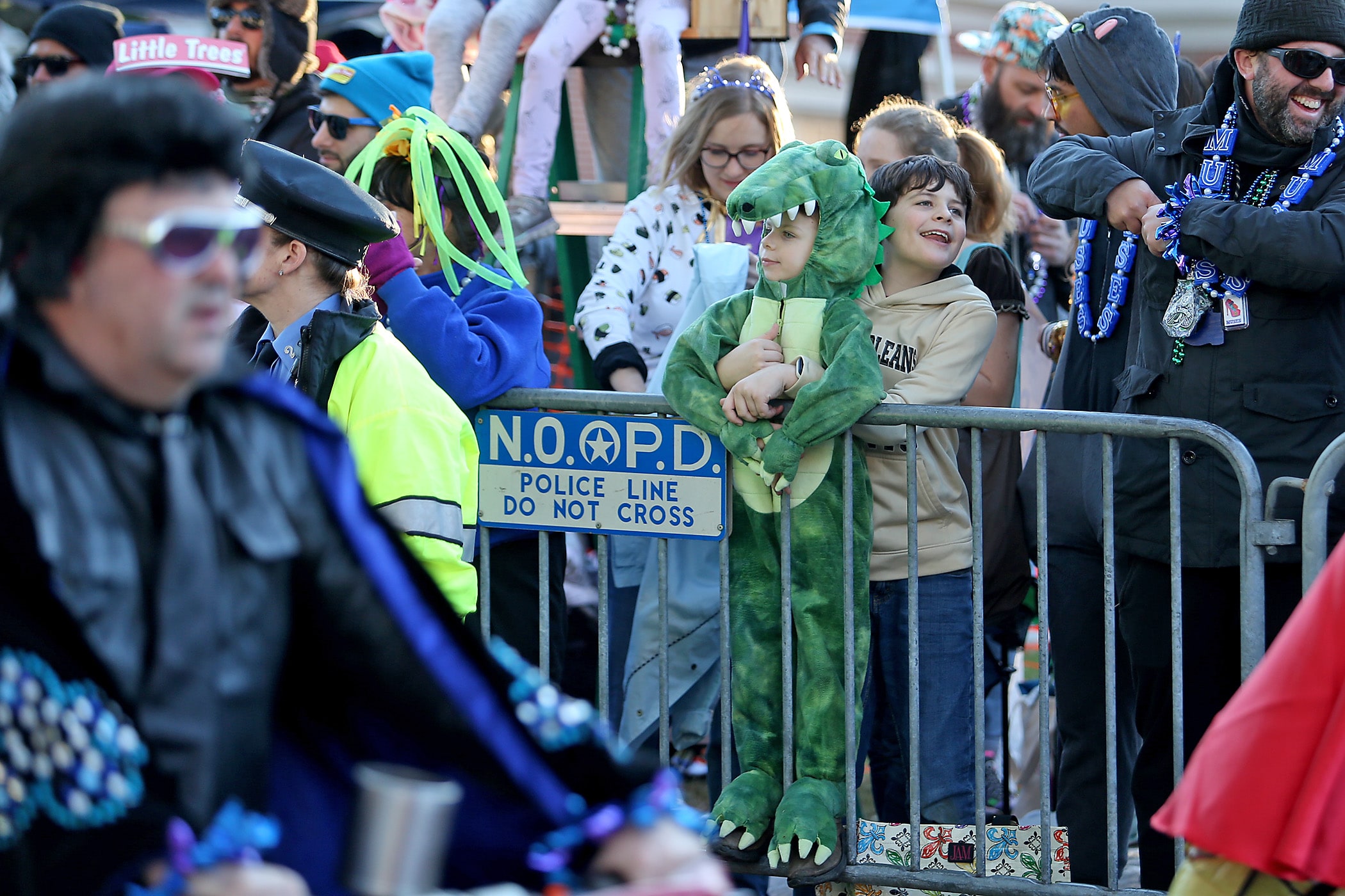 A young gator watches the Rolling Elvi as the over 1100 women of the Krewe of Muses roll down the Uptown parade route with a 26-float parade with the theme “Nostradamuse Sees All” as they celebrate their 20th anniversary on Friday, February 21, 2020. (Photo by Michael DeMocker)
