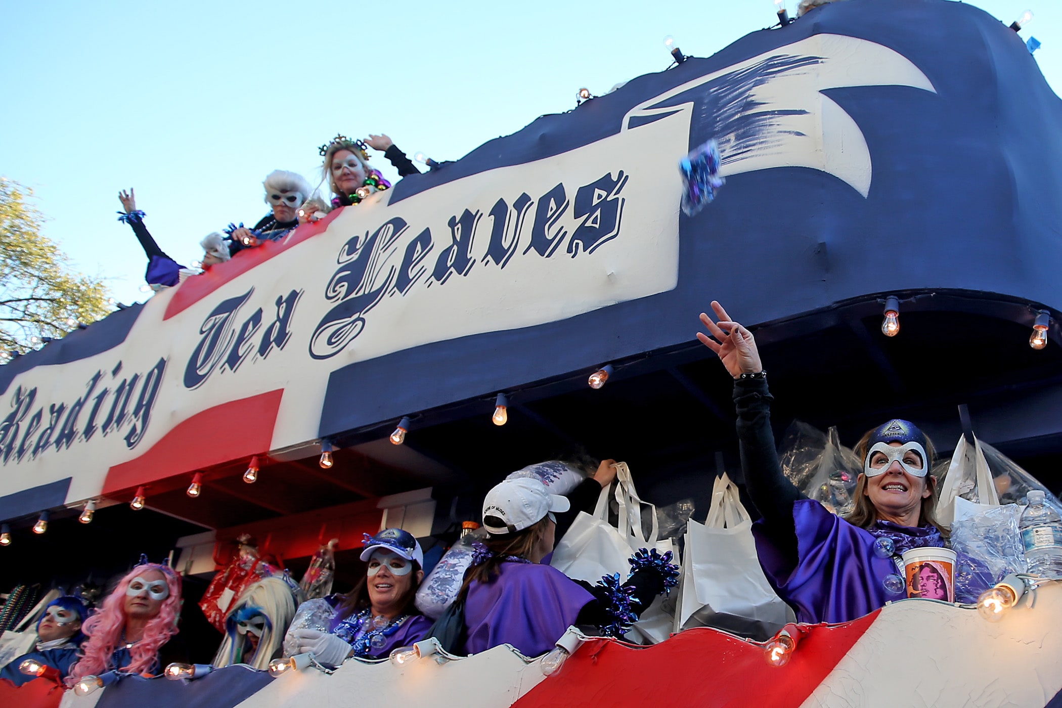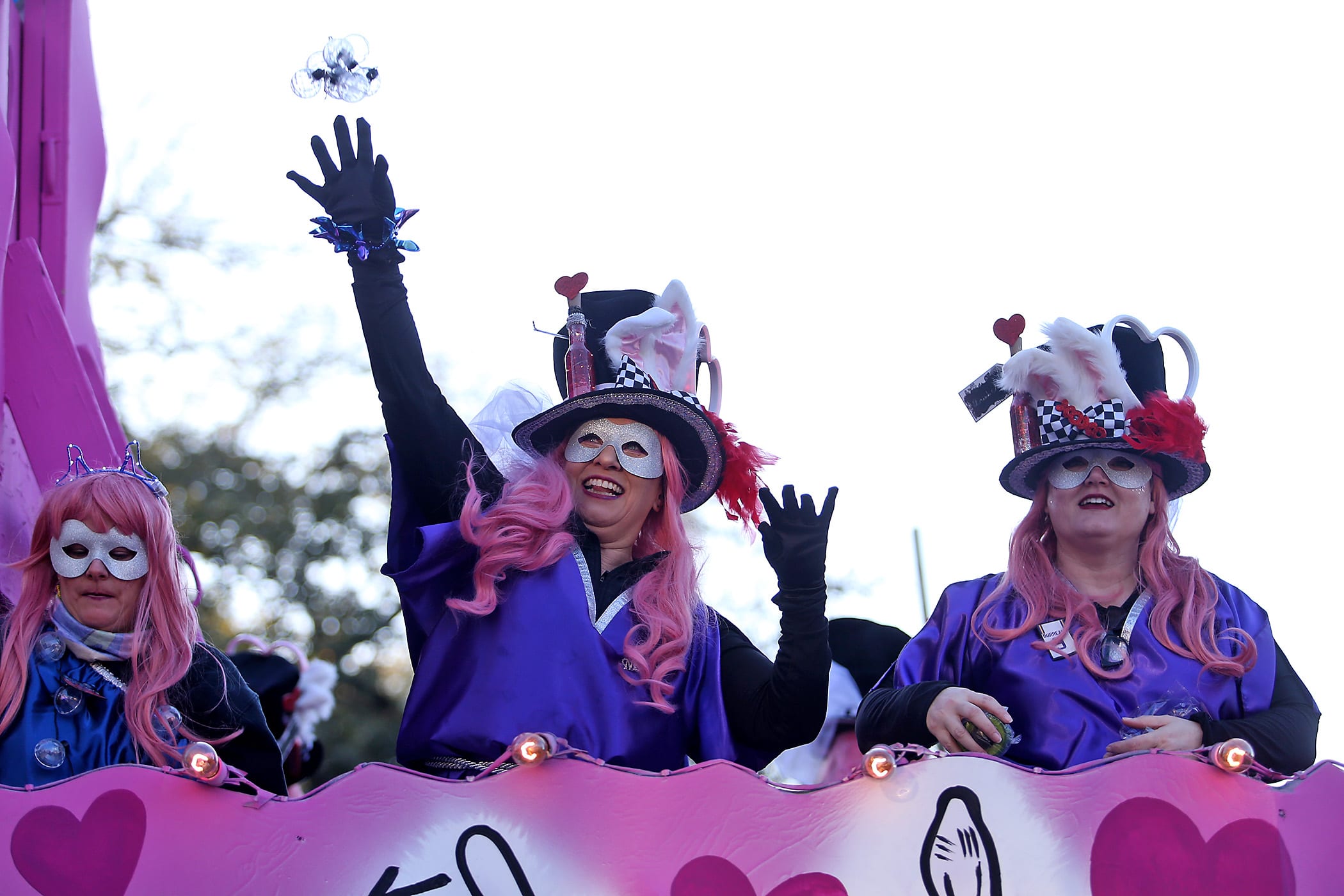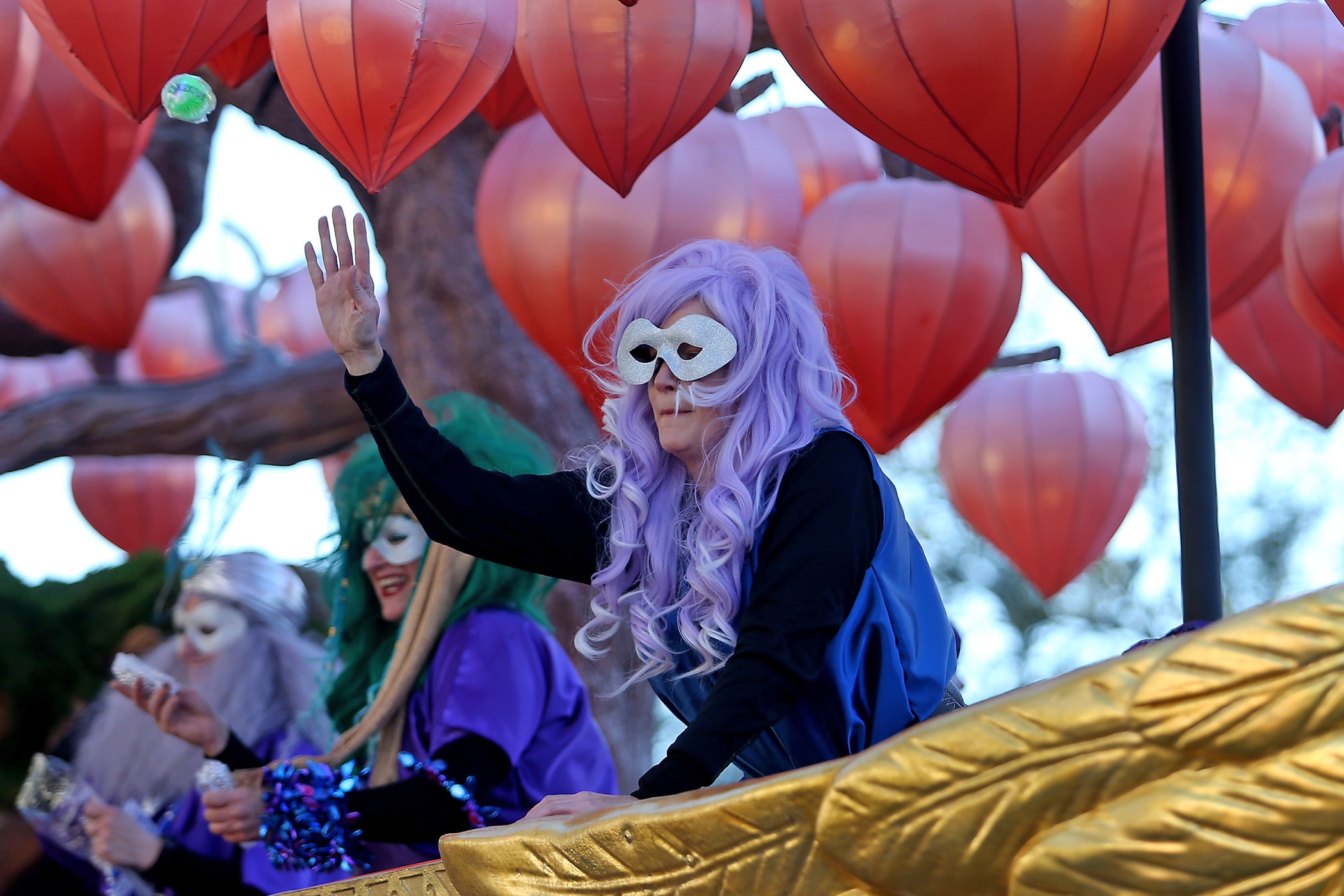 A rider throws on Napoleon Avenue as the over 1100 women of the Krewe of Muses roll down the Uptown parade route with a 26-float parade with the theme “Nostradamuse Sees All” as they celebrate their 20th anniversary on Friday, February 21, 2020. (Photo by Michael DeMocker)