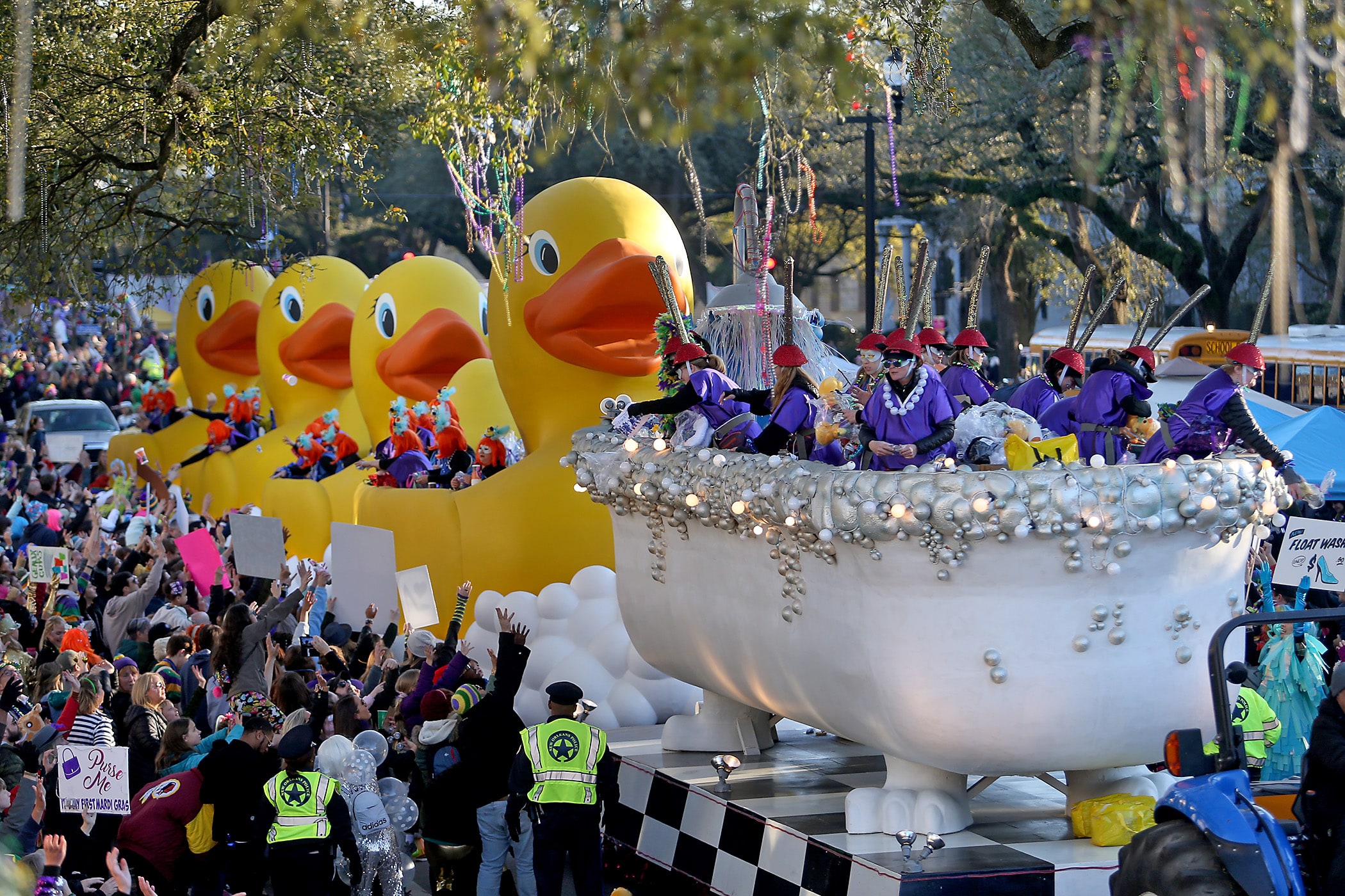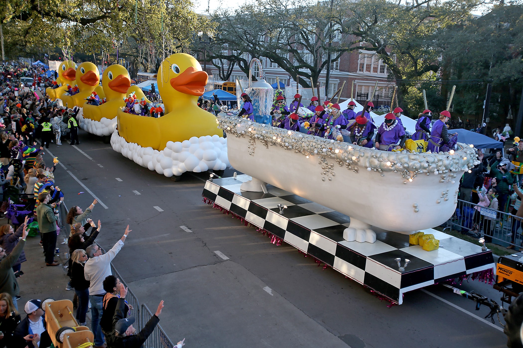 The bathtub and ducks waddle by as the over 1100 women of the Krewe of Muses roll down the Uptown parade route with a 26-float parade as they celebrate their 20th anniversary on Friday, February 21, 2020. (Photo by Michael DeMocker)