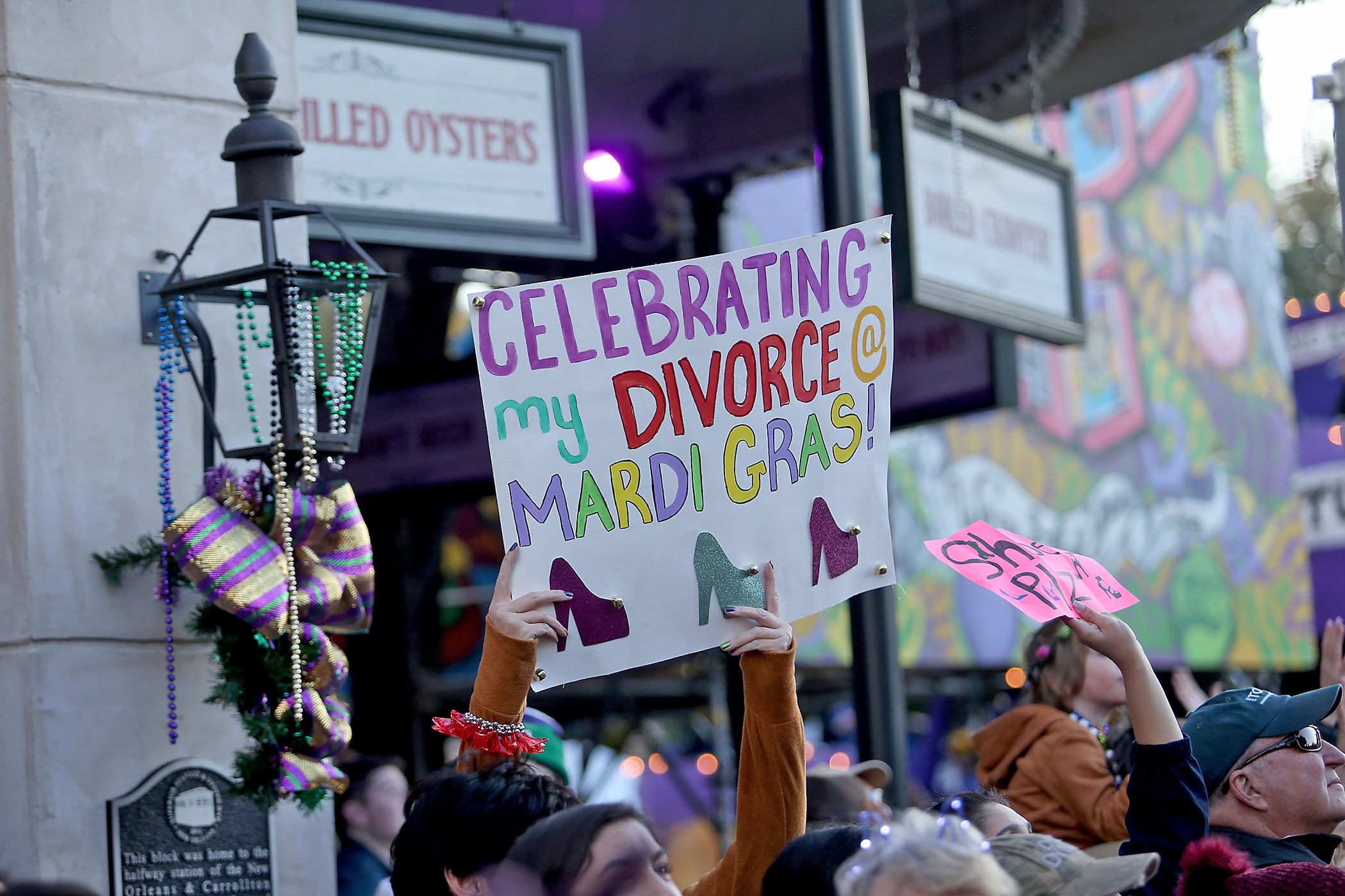 A sign on St. Charles Avenue as the over 1100 women of the Krewe of Muses roll down the Uptown parade route with a 26-float parade with the theme “Nostradamuse Sees All” as they celebrate their 20th anniversary on Friday, February 21, 2020. (Photo by Michael DeMocker)