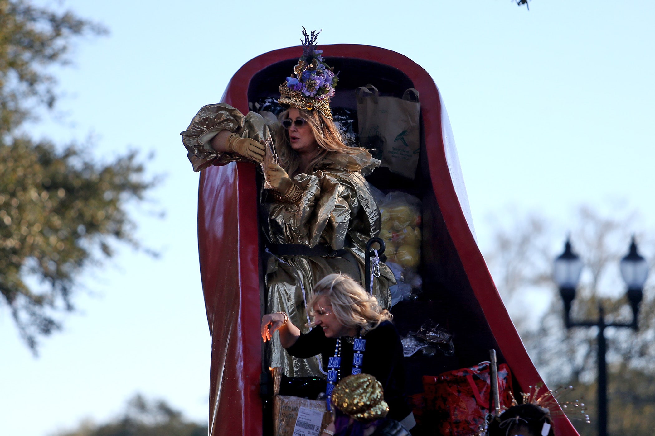 Actress Jennifer Coolidge aka Stifler’s mom rides as Honorary Muse 2020 as the over 1100 women of the Krewe of Muses roll down the Uptown parade route with a 26-float parade with the theme “Nostradamuse Sees All” as they celebrate their 20th anniversary on Friday, February 21, 2020. (Photo by Michael DeMocker)
