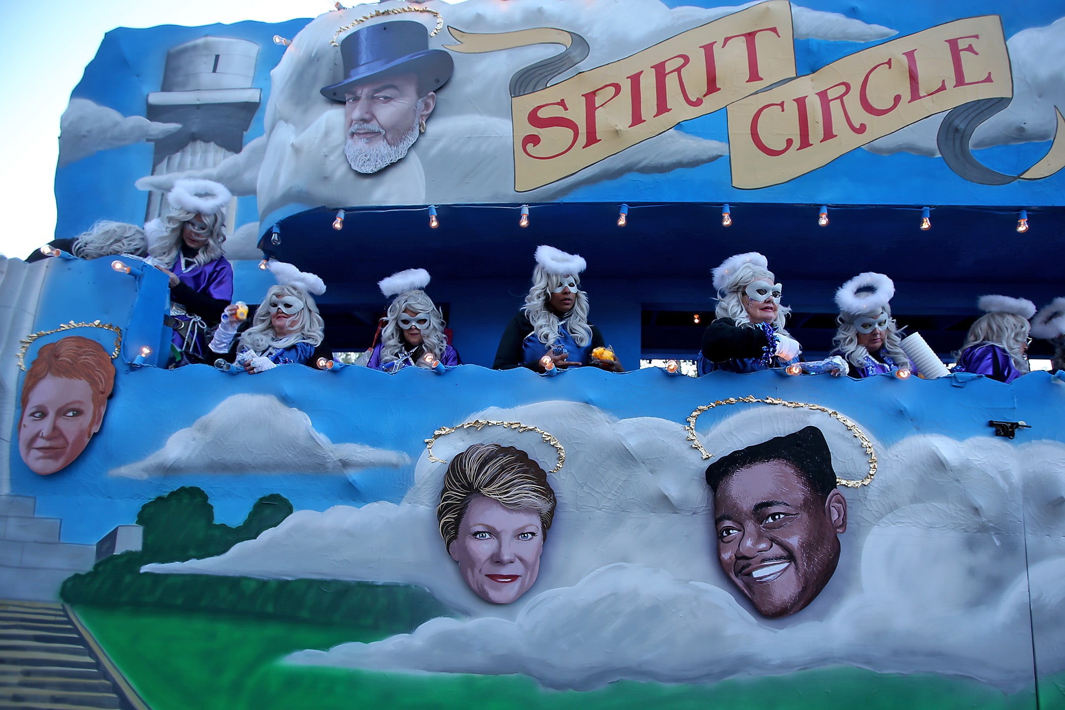 A float honors the passing of famous New Orleanians as the over 1100 women of the Krewe of Muses roll down the Uptown parade route with a 26-float parade with the theme “Nostradamuse Sees All” as they celebrate their 20th anniversary on Friday, February 21, 2020. (Photo by Michael DeMocker)