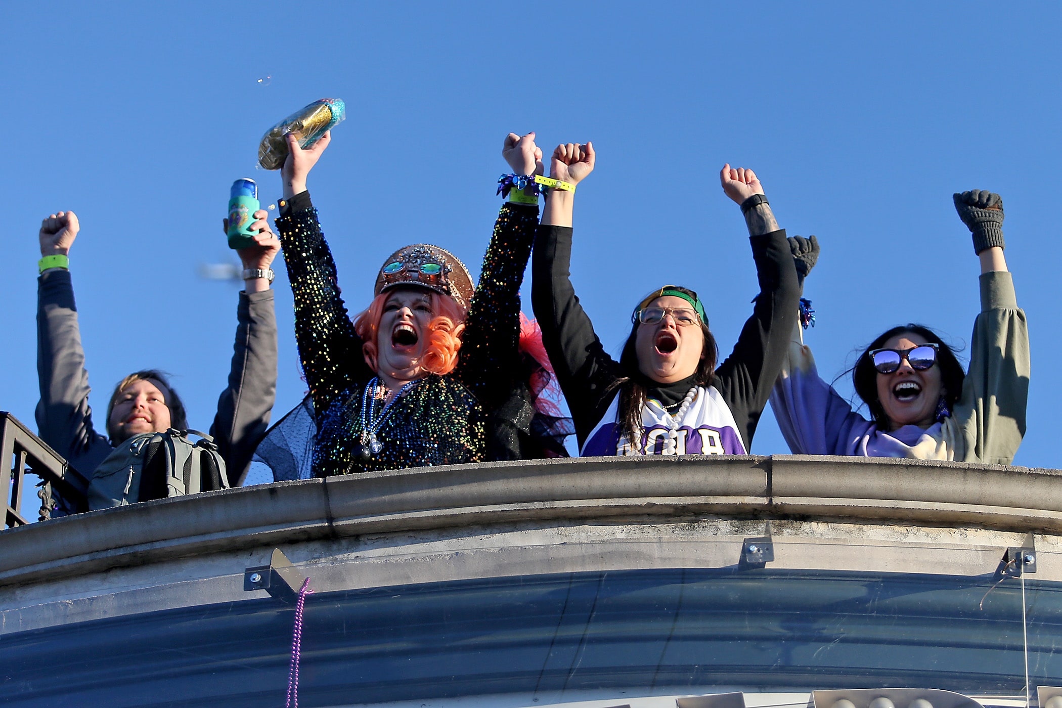 Riders show off their shoes as the over 1100 women of the Krewe of Muses roll down the Uptown parade route with a 26-float parade with the theme “Nostradamuse Sees All” as they celebrate their 20th anniversary on Friday, February 21, 2020. (Photo by Michael DeMocker)