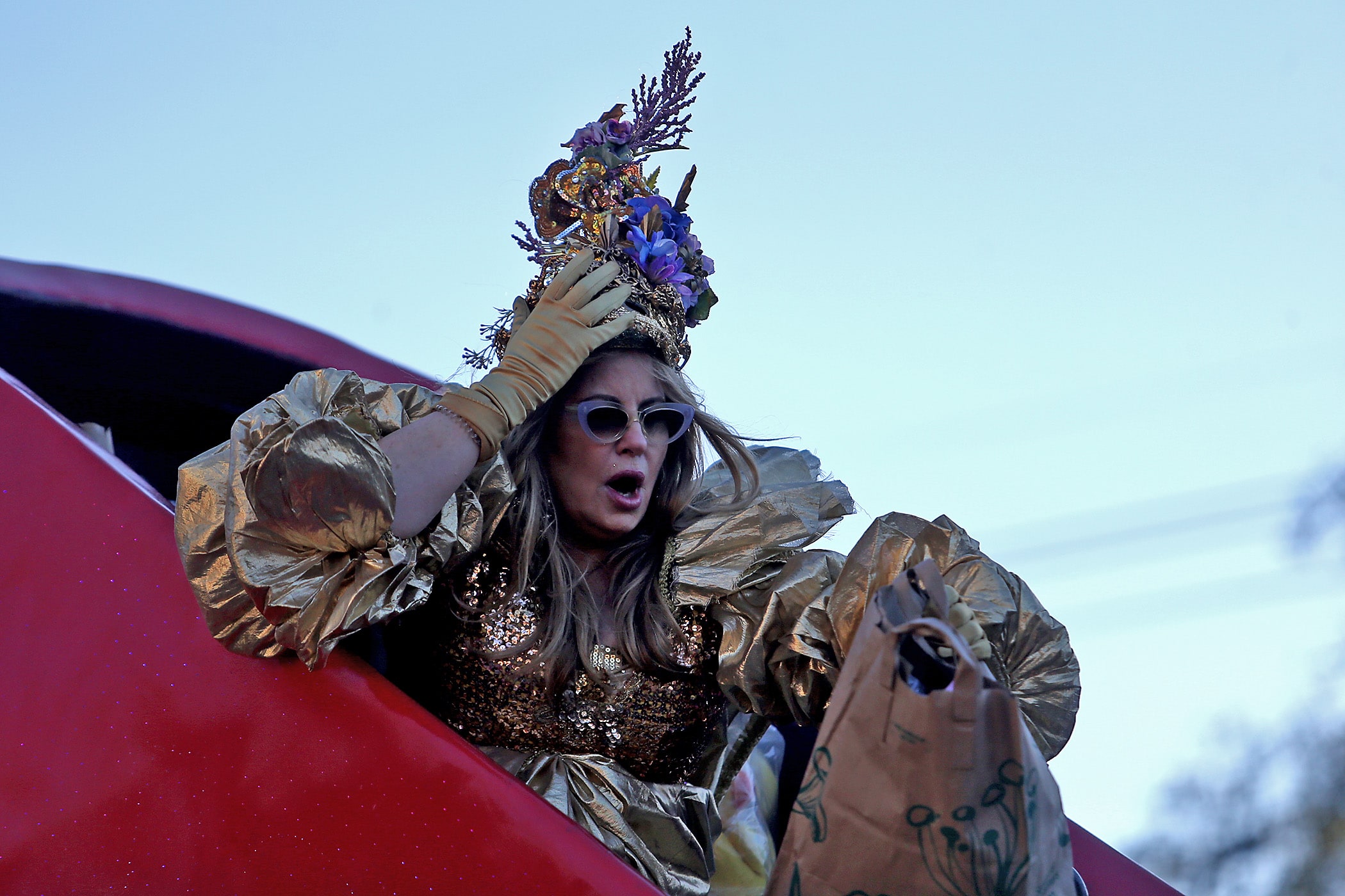 A rider offers up a shoe as the over 1100 women of the Krewe of Muses roll down the Uptown parade route with a 26-float parade with the theme “Nostradamuse Sees All” as they celebrate their 20th anniversary on Friday, February 21, 2020. (Photo by Michael DeMocker)