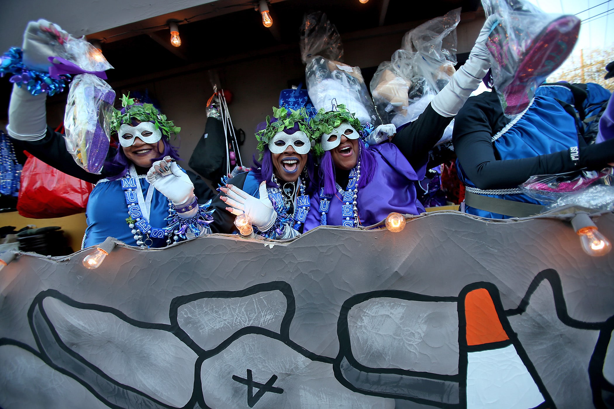 Riders show off shoes to the crowd as the over 1100 women of the Krewe of Muses roll down the Uptown parade route with a 26-float parade with the theme “Nostradamuse Sees All” as they celebrate their 20th anniversary on Friday, February 21, 2020. (Photo by Michael DeMocker)