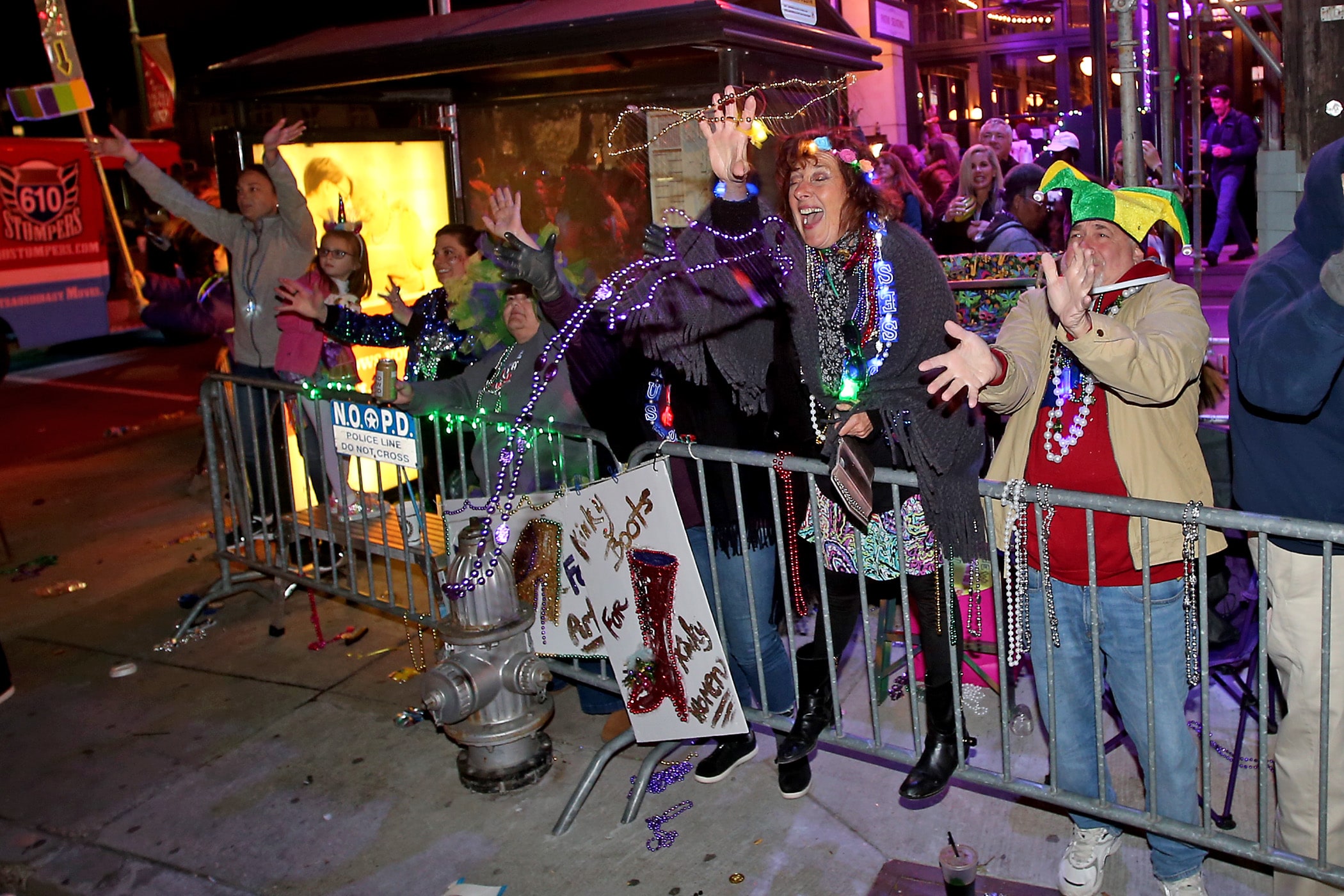 The crowd catches throws at St. Charles and Napoleon Avenues as over 800 members of Hermes rolls down the Uptown parade route with a 32-float parade entitled “Carnival at the French Opera House” on Friday, February 21, 2020. (Photo by Michael DeMocker)