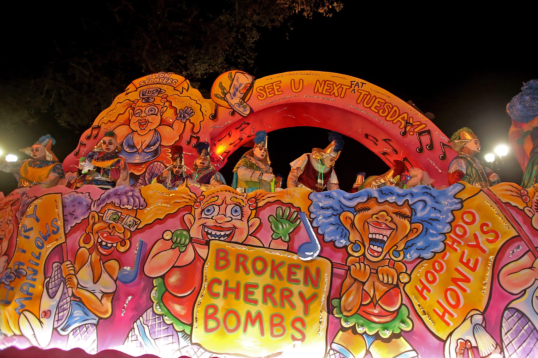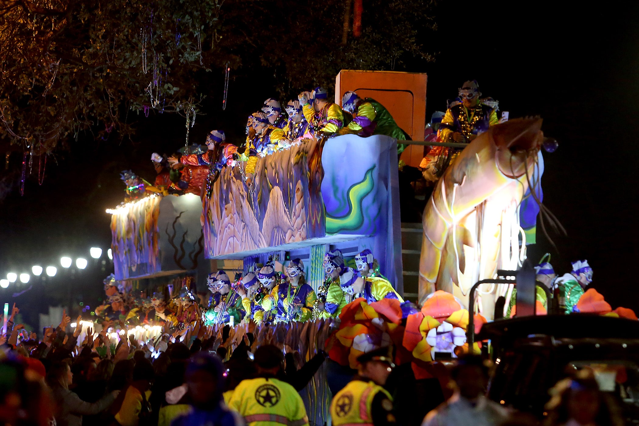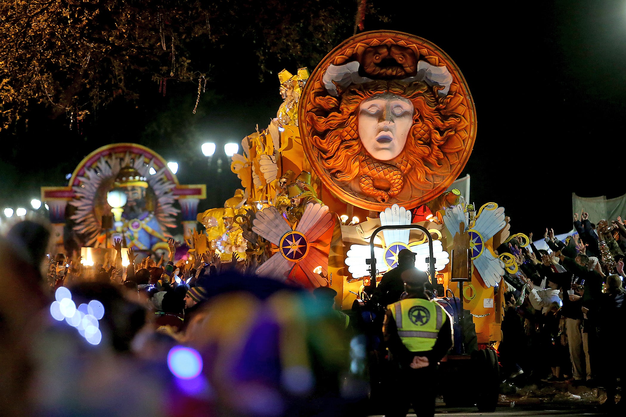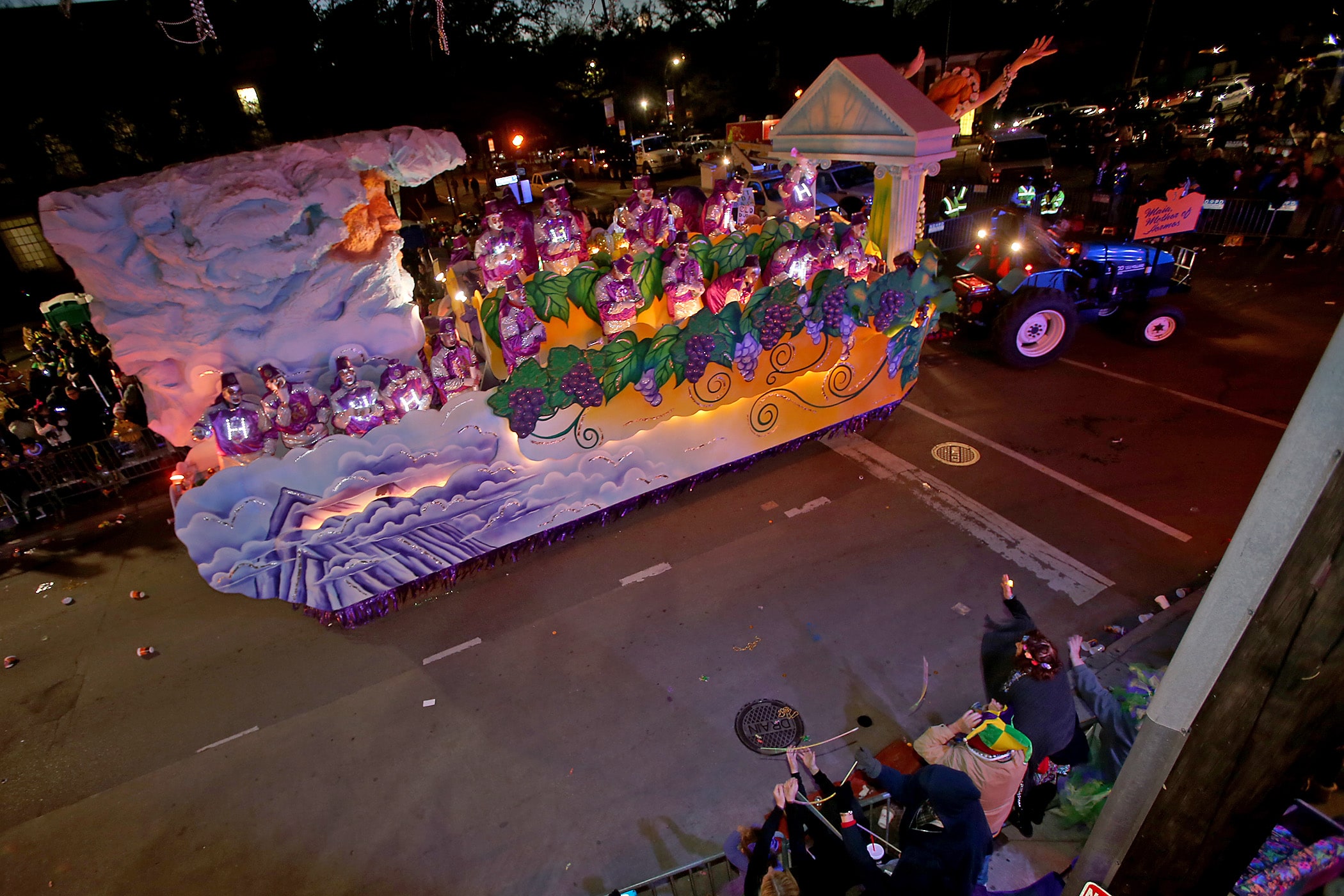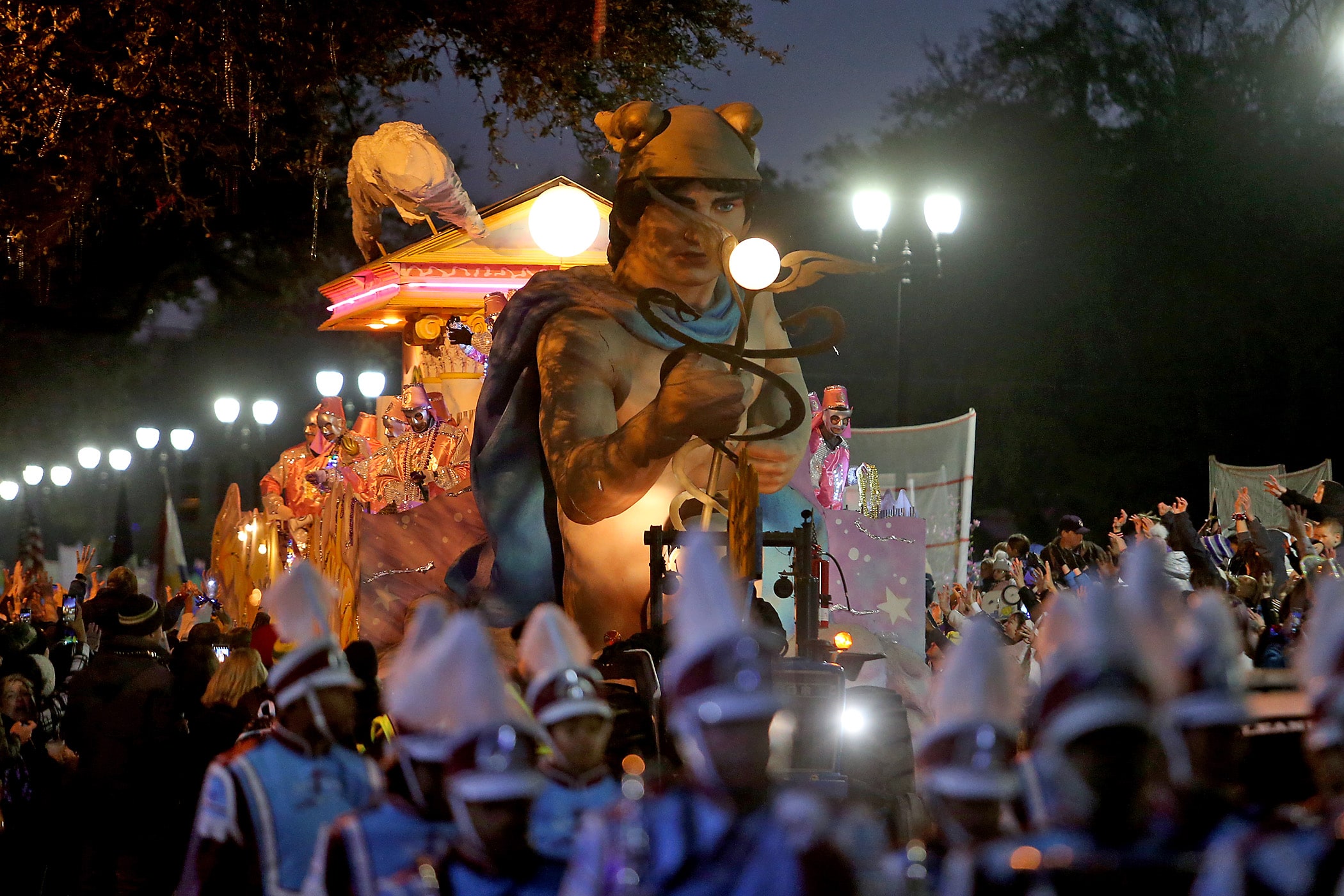 Floats come up Napoleon Avenue as over 800 members of Hermes rolls down the Uptown parade route with a 32-float parade entitled “Carnival at the French Opera House” on Friday, February 21, 2020. (Photo by Michael DeMocker)