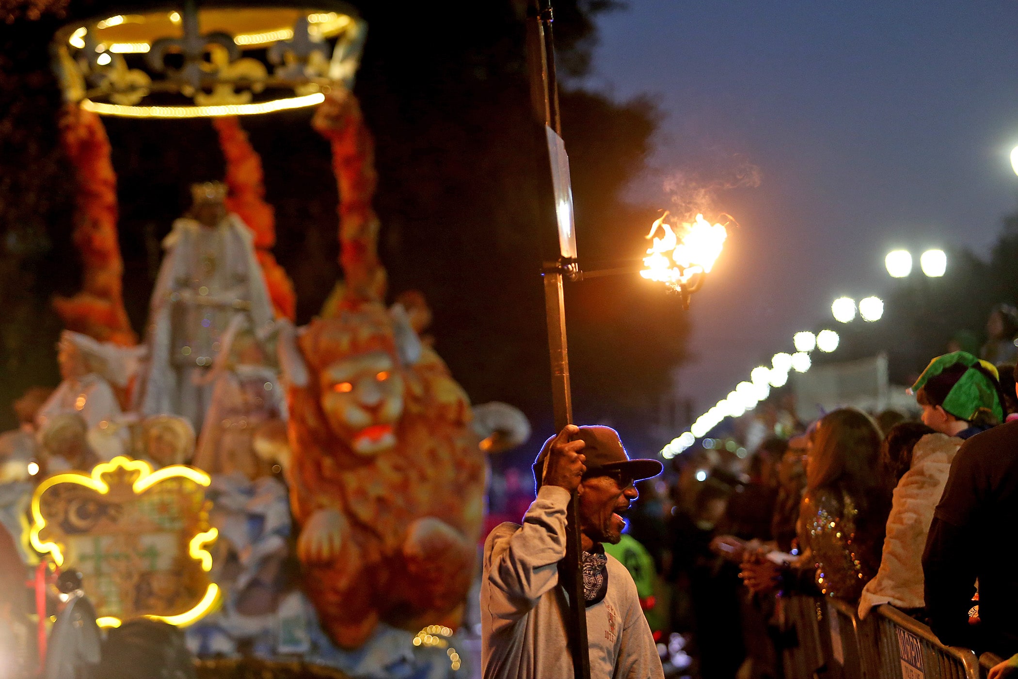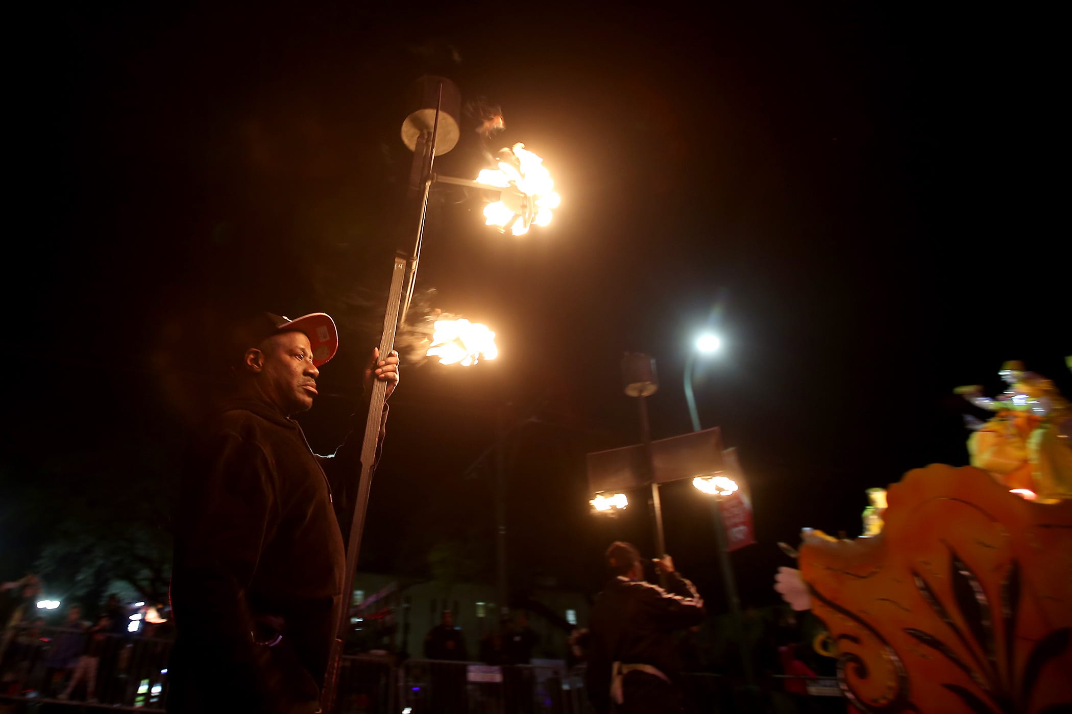 Flambeaux carriers light the route as over 800 members of Hermes rolls down the Uptown parade route with a 32-float parade entitled “Carnival at the French Opera House” on Friday, February 21, 2020. (Photo by Michael DeMocker)