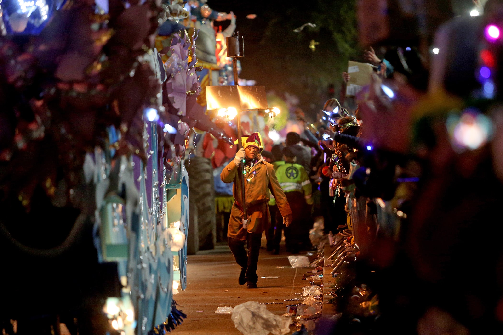 A flambeaux carrier lights the way for the King as over 800 members of Hermes rolls down the Uptown parade route with a 32-float parade entitled “Carnival at the French Opera House” on Friday, February 21, 2020. (Photo by Michael DeMocker)