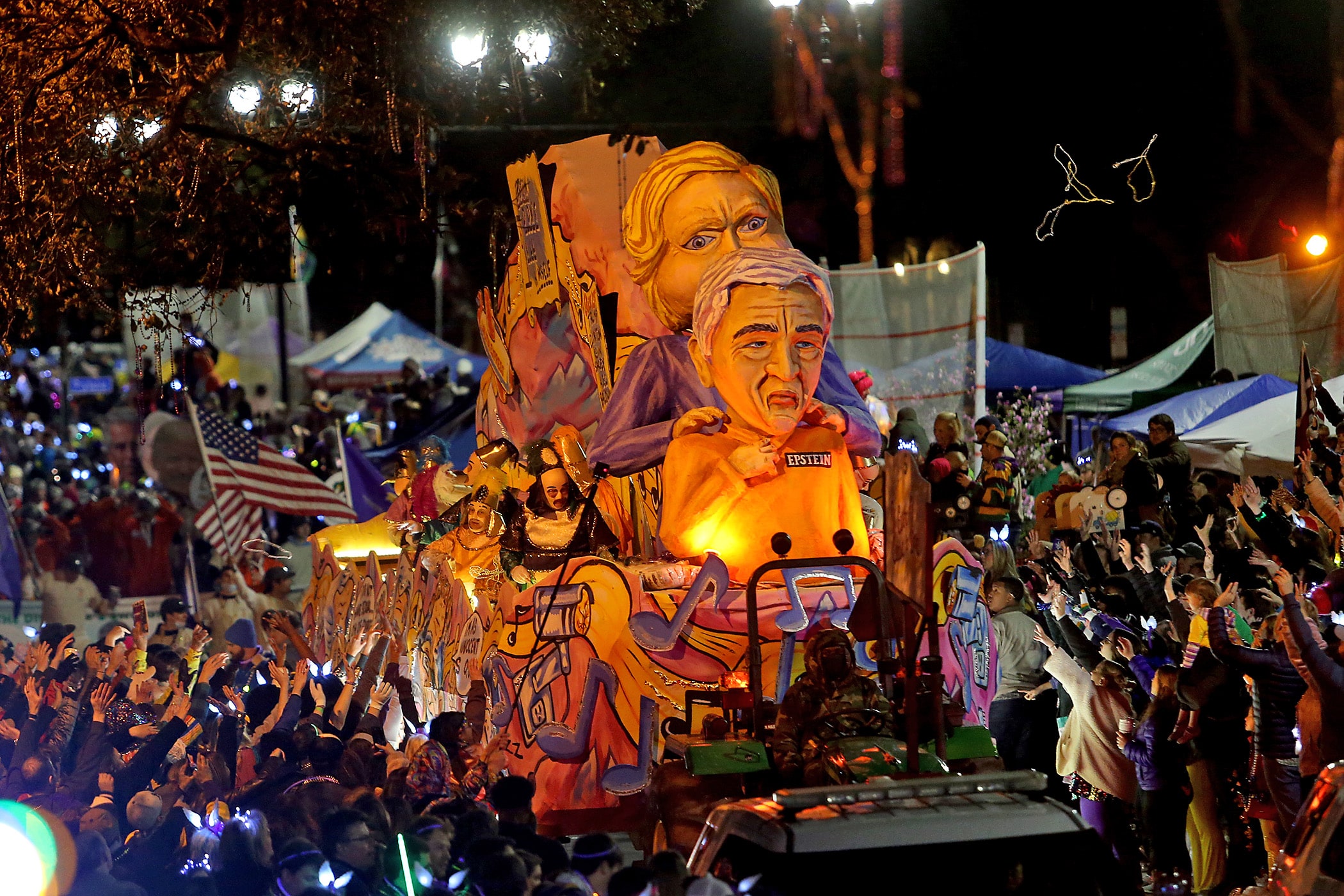 The Epstein float comes up Napoleon Avenue as 540-plus members of Le Krewe D’Etat roll down the Uptown parade route with a satirical 24-float parade with the theme “The DIC Goes to Mardi Gras” as they celebrate their 24th year on Friday, February 21, 2020. (Photo by Michael DeMocker)