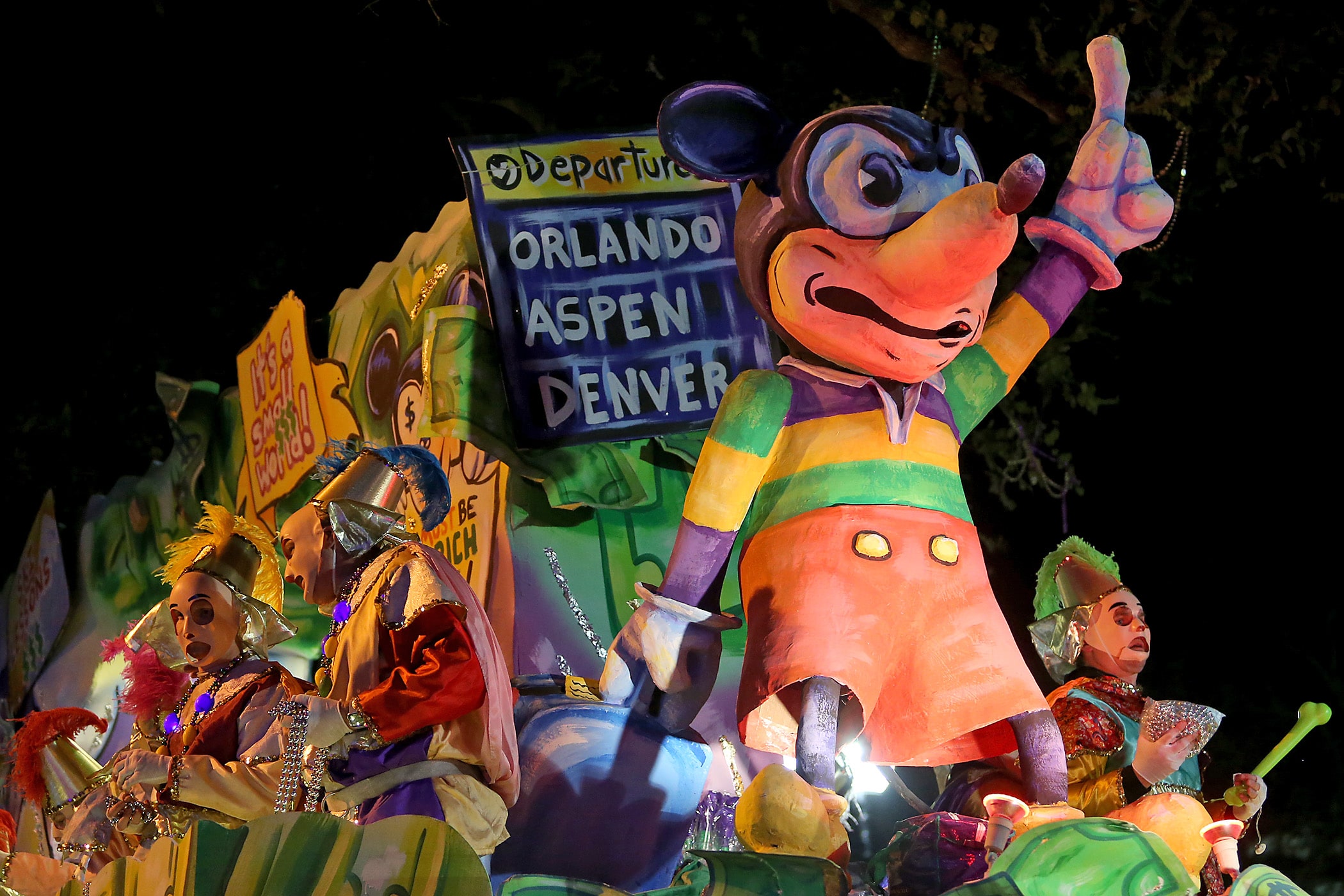 A float skewering problems at the new airport passes as the 540-plus members of Le Krewe D’Etat roll down the Uptown parade route with a satirical 24-float parade with the theme “The DIC Goes to Mardi Gras” as they celebrate their 24th year on Friday, February 21, 2020. (Photo by Michael DeMocker)