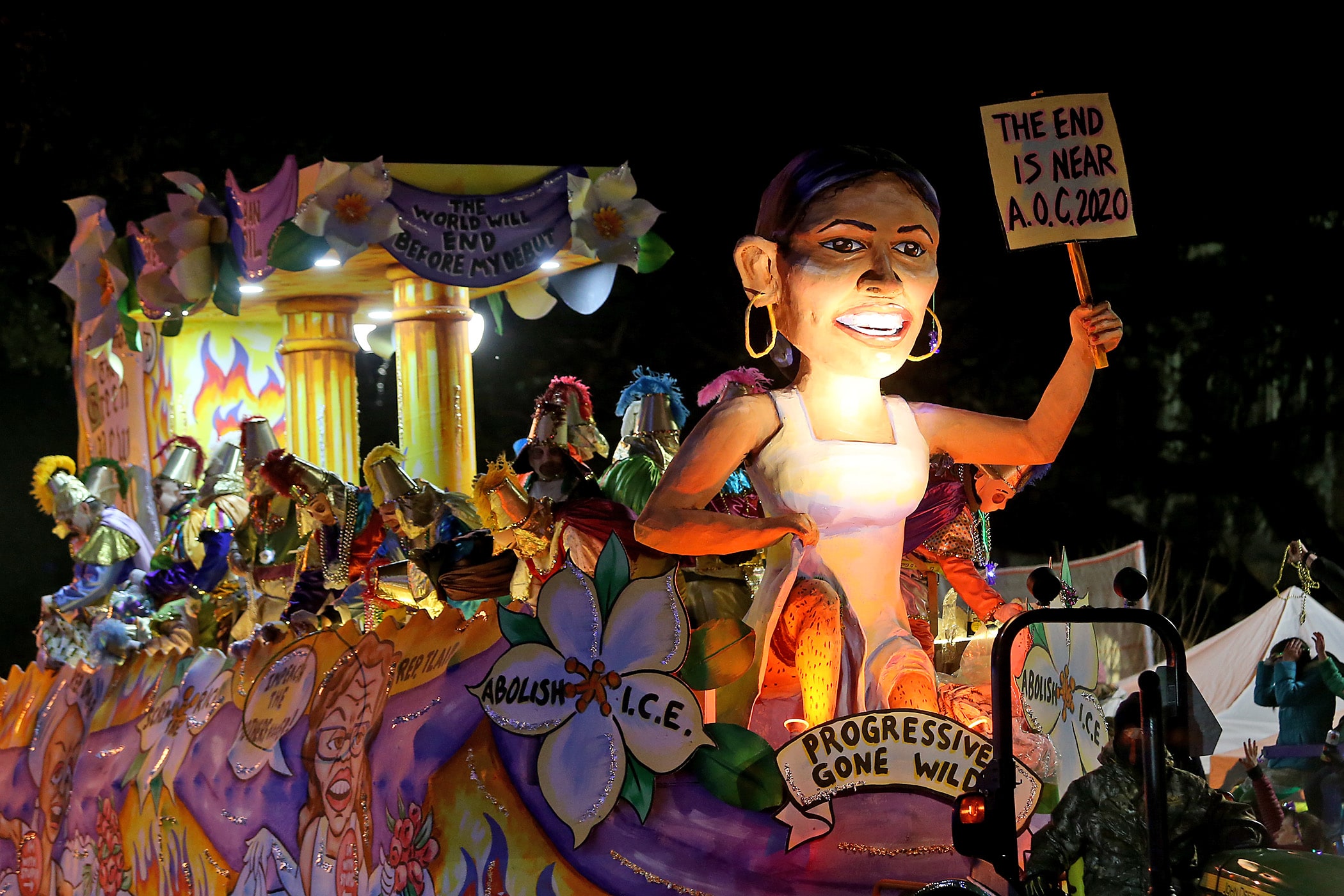 A float skewering the Babycakes passes as the 540-plus members of Le Krewe D’Etat roll down the Uptown parade route with a satirical 24-float parade with the theme “The DIC Goes to Mardi Gras” as they celebrate their 24th year on Friday, February 21, 2020. (Photo by Michael DeMocker)