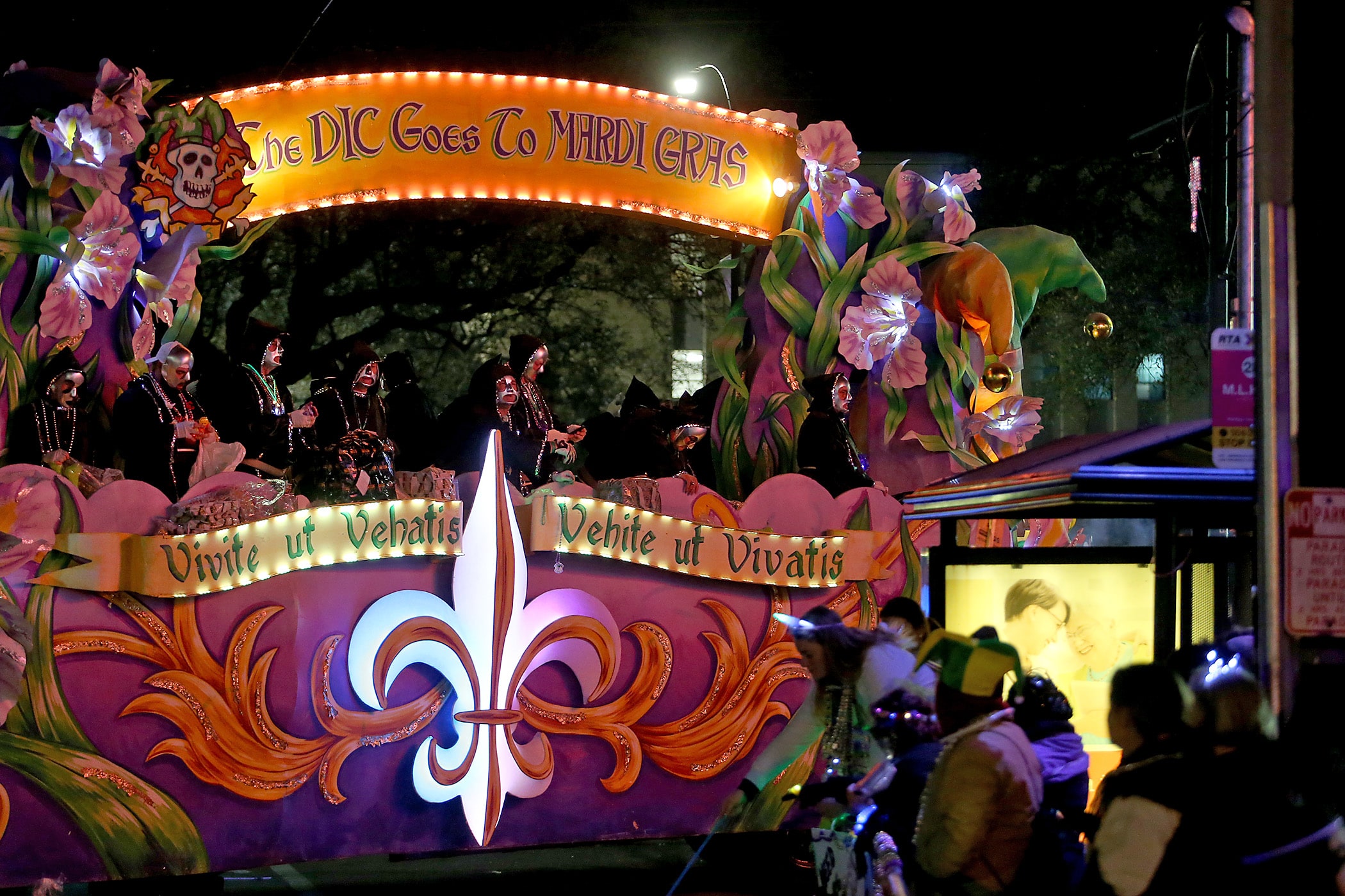 The title float passes by as 540-plus members of Le Krewe D’Etat roll down the Uptown parade route with a satirical 24-float parade with the theme “The DIC Goes to Mardi Gras” as they celebrate their 24th year on Friday, February 21, 2020. (Photo by Michael DeMocker)