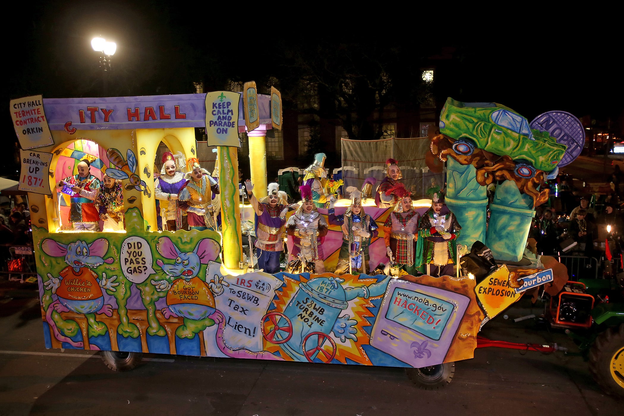 The City Hall float passes as the 540-plus members of Le Krewe D’Etat roll down the Uptown parade route with a satirical 24-float parade with the theme “The DIC Goes to Mardi Gras” as they celebrate their 24th year on Friday, February 21, 2020. (Photo by Michael DeMocker)