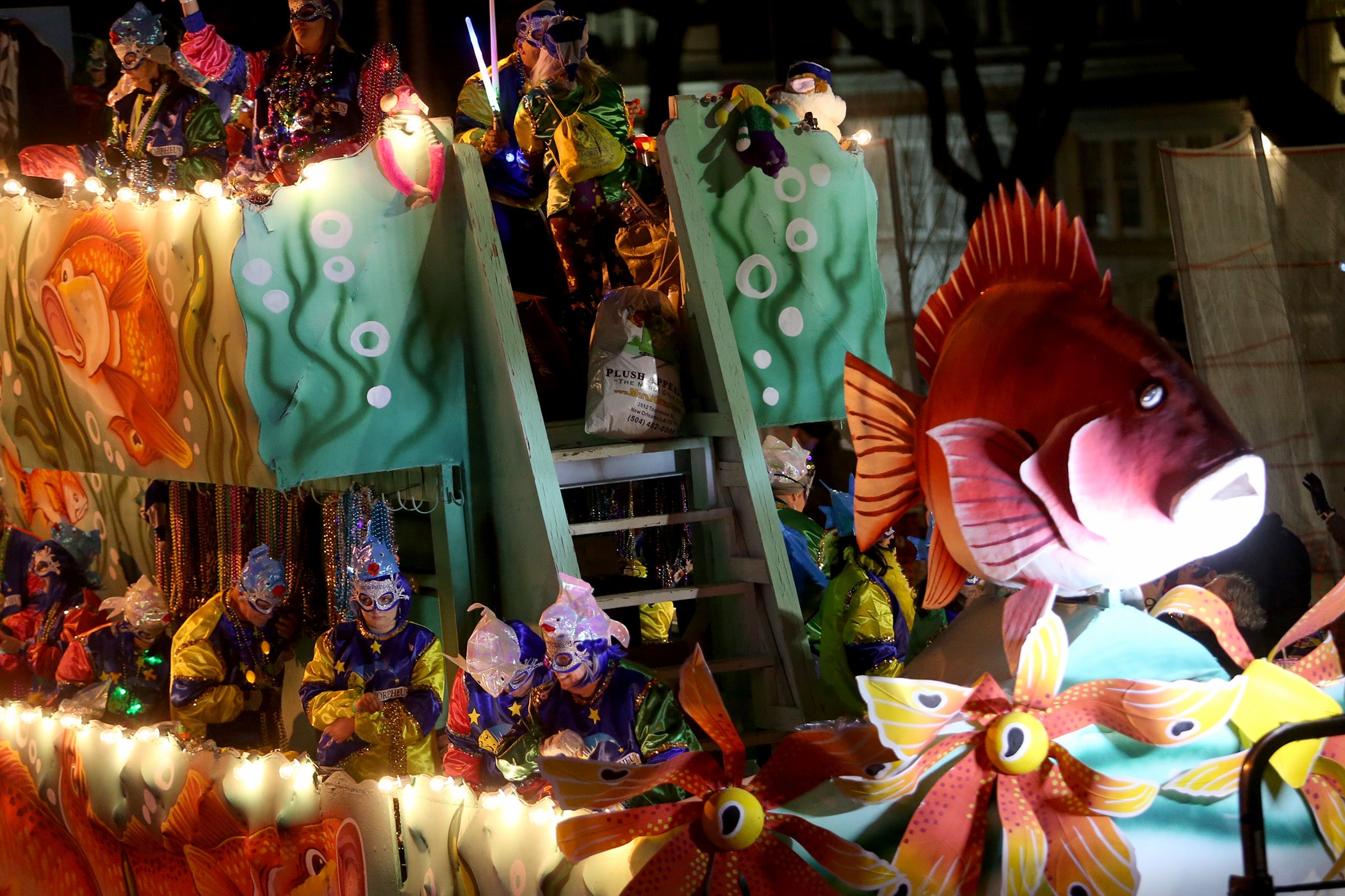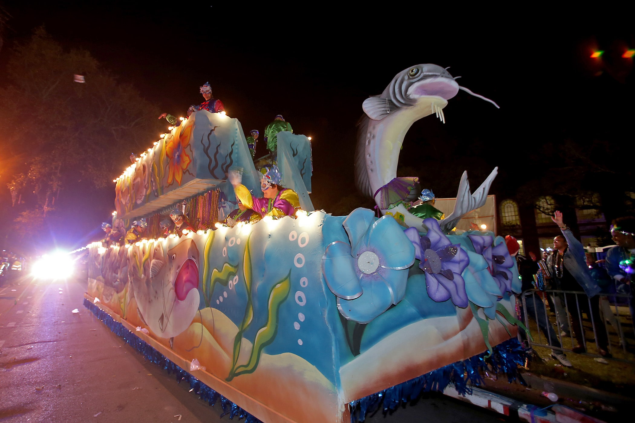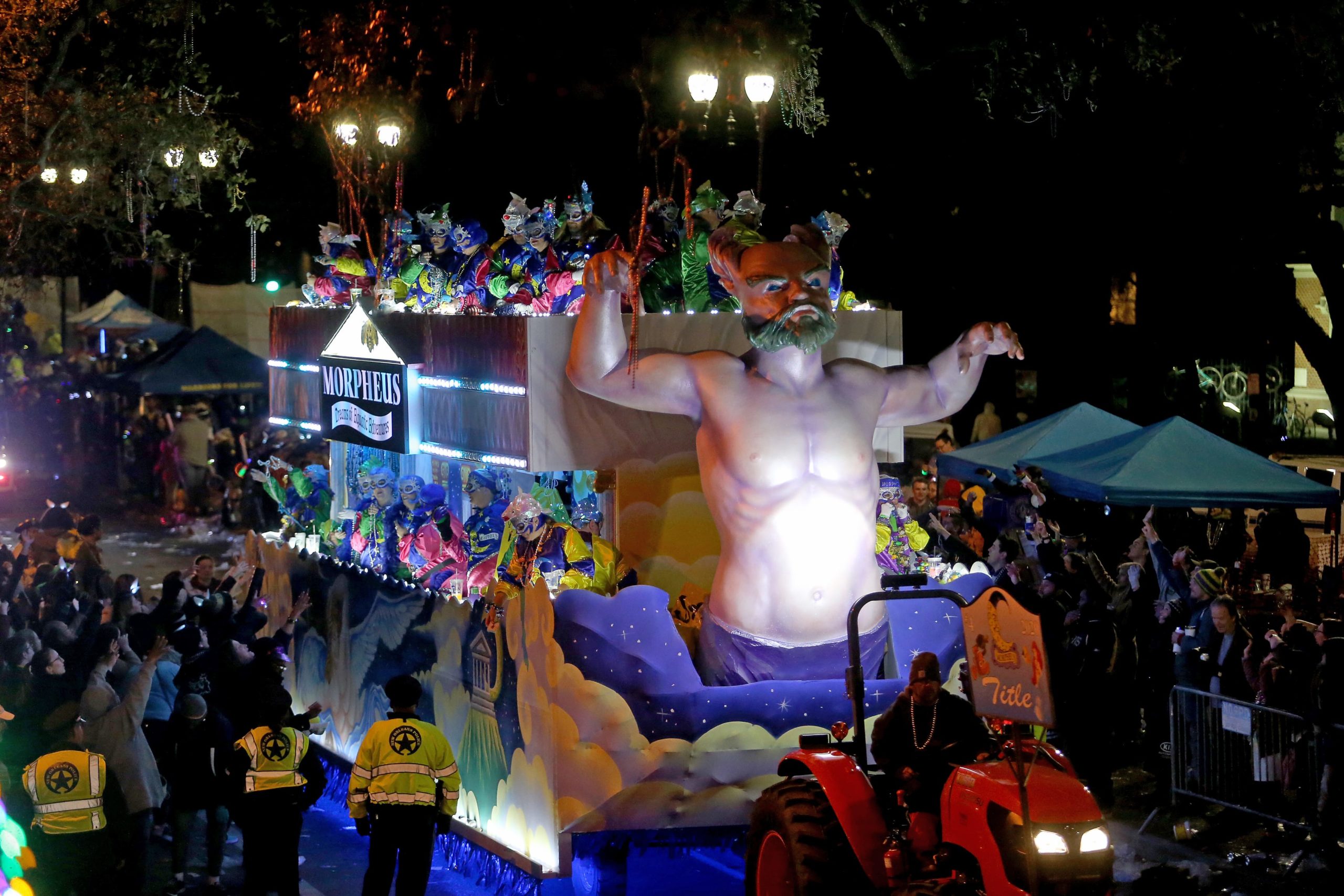 The title float passes as the 800 members of the Krewe of Morpheus roll down the Uptown parade route with a 24-float parade entitled “Morpheus Dreams of Aquatic Adventures” as they celebrate their 20th year on Friday, February 21, 2020. (Photo by Michael DeMocker)